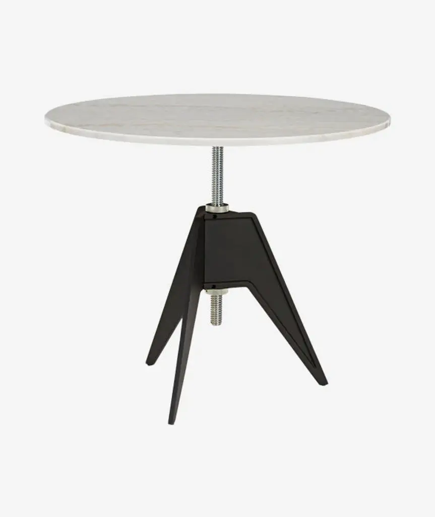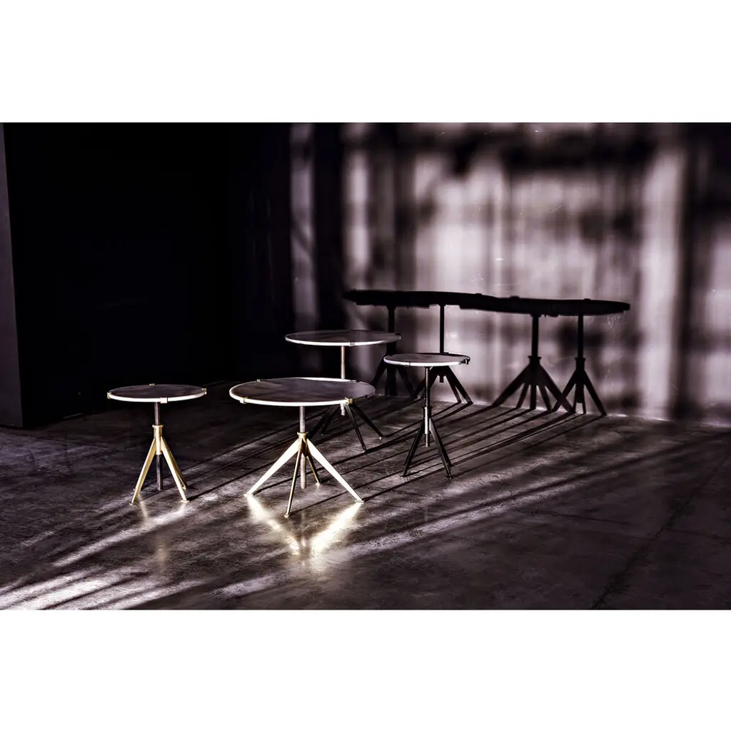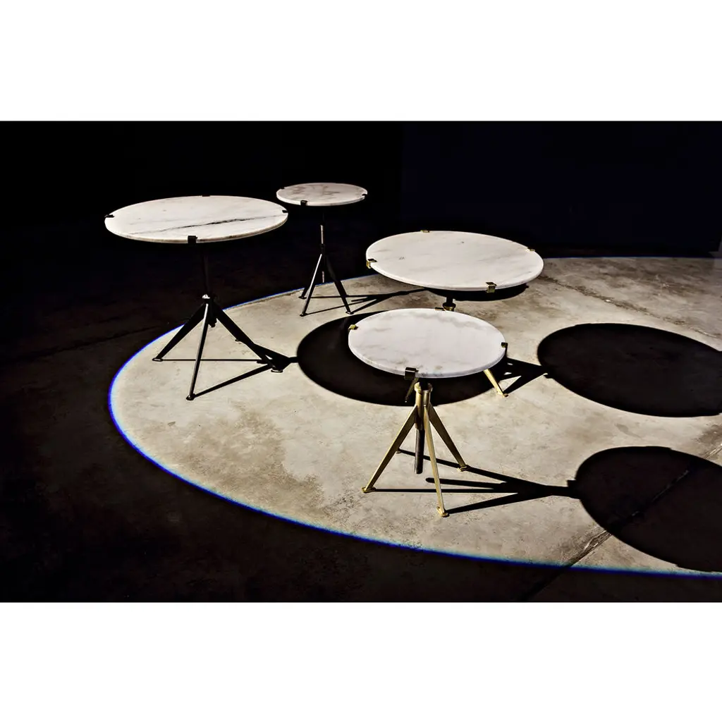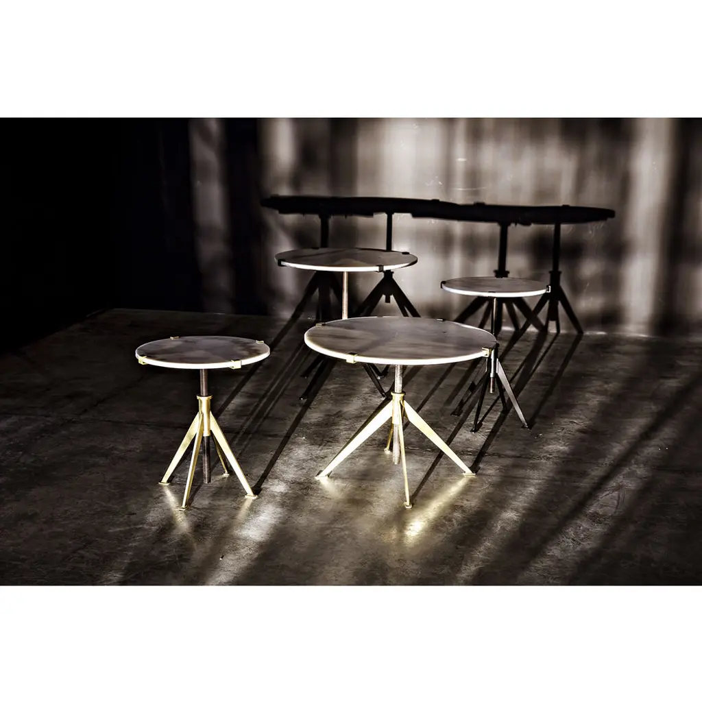 An updated take on mid-century modern, this table is topped with a slab of marble and designed to embrace the beauty of the natural material. The one of a kind stone discs top minimally finished adjustable metal bases that allow the table's height to be easily adjusted.