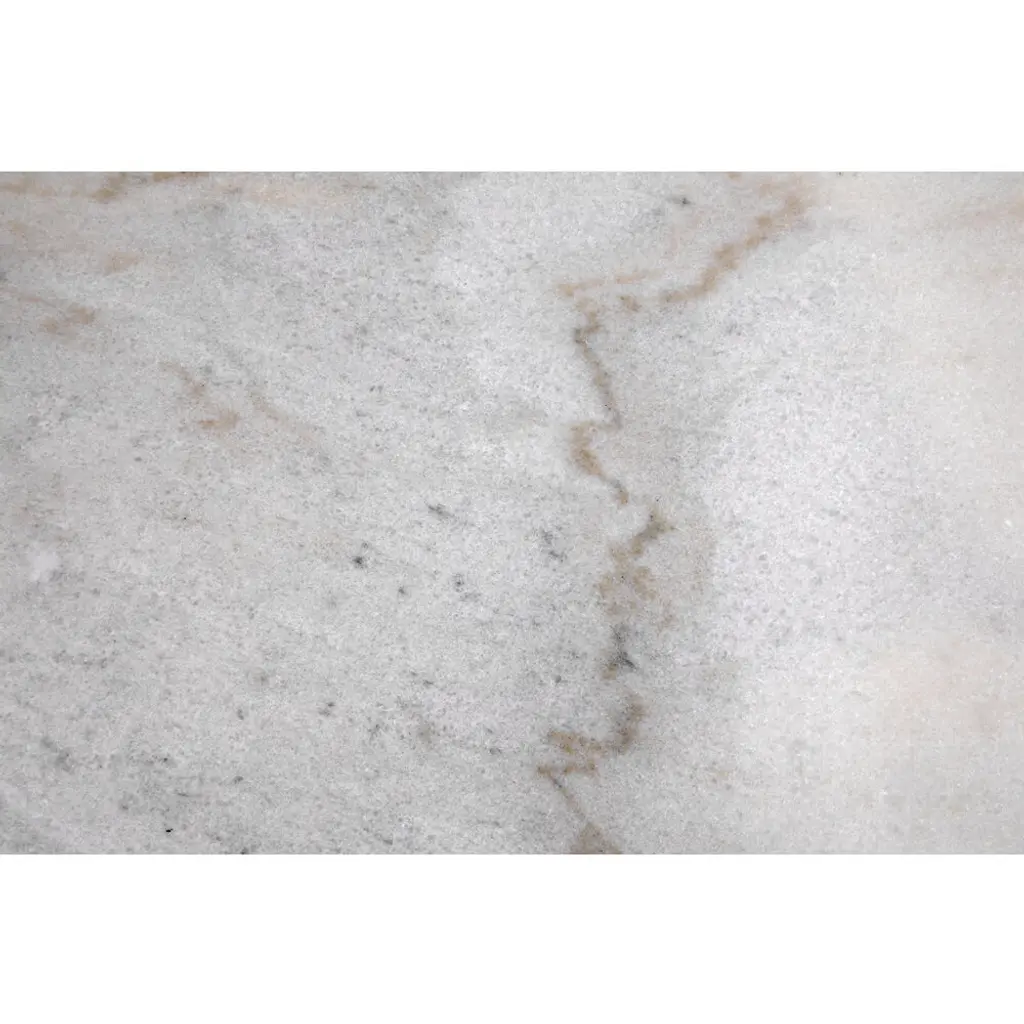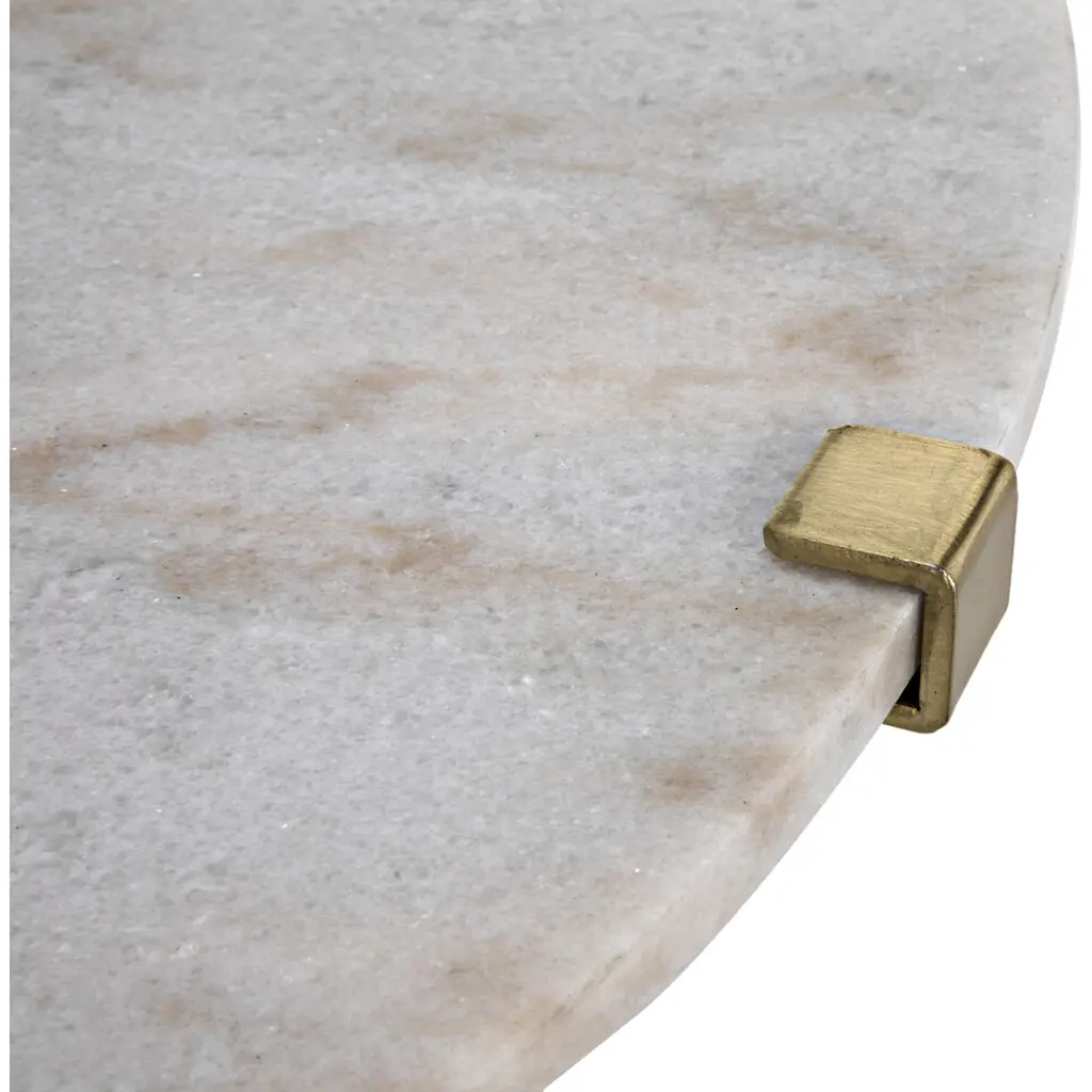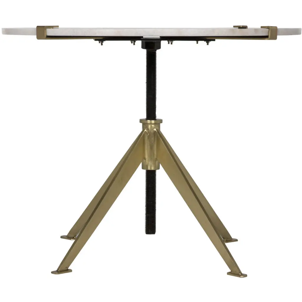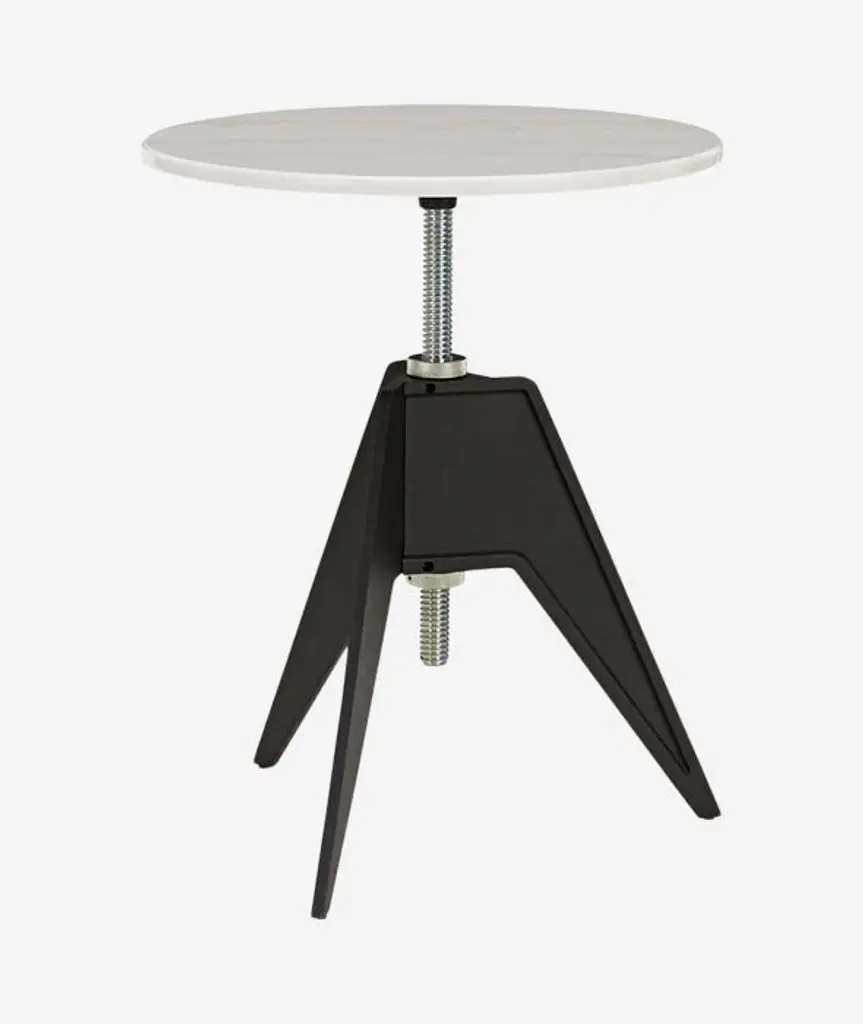 An updated take on mid-century modern, this table is topped with a slab of marble and designed to embrace the beauty of the natural material. The one of a kind stone discs top minimally finished adjustable metal bases that allow the table's height to be easily adjusted.