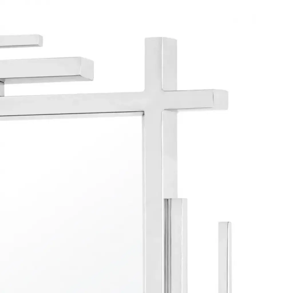 The Edith Mirror marries sophisticated glamour with unexpected design. The large rectangular mirror finds its ornamental upgrade in polished stainless steel, which forms a deconstructed frame with sleek layers and contrasting dimensions. A thick border adds extra depth and metallic shine. The result is a spectacular silver statement piece that instantly snags the spotlight, whether placed above a desk, sofa, or side table. The Edith would also make a beautiful addition as a vanity mirror in a bedroom or bathroom.