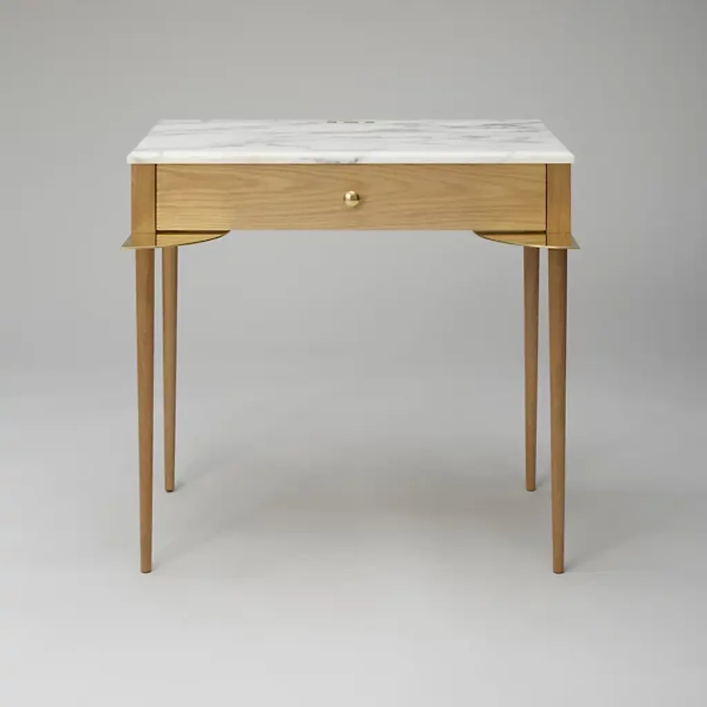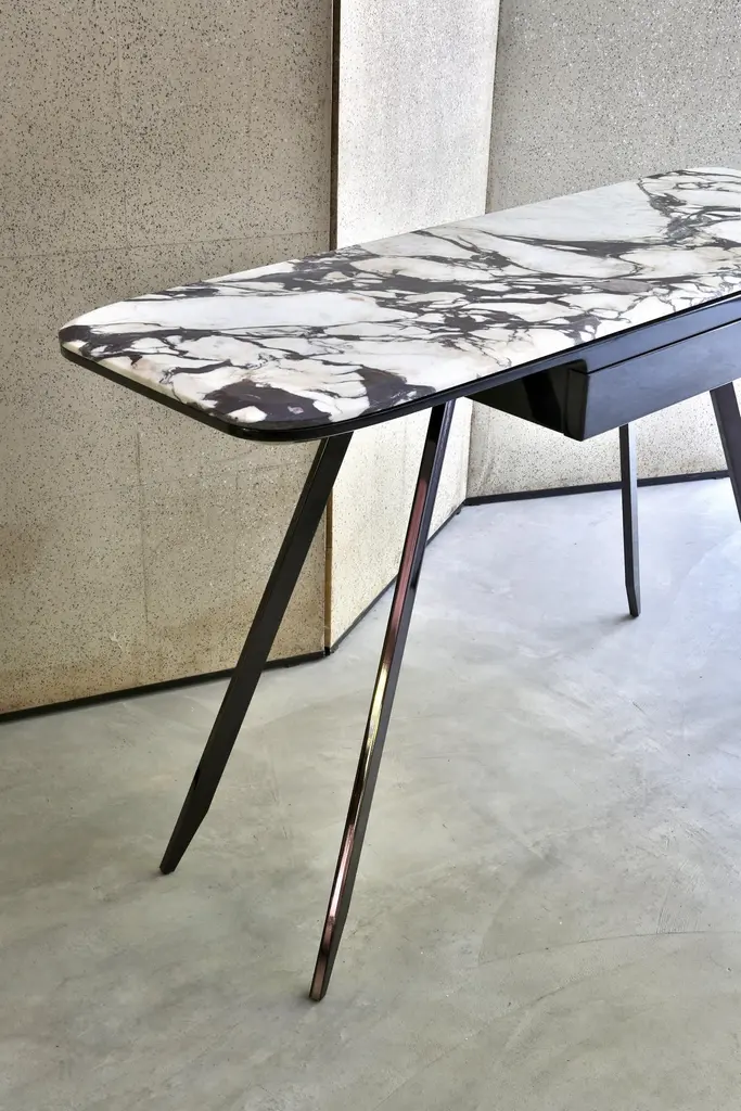 A light console of minimal design, available in two different sizes (here in the version 120 centimeters lenght). The top is composed of a lower part in lacquered and chamfered wood which gently curves into a small drawer entirely lacquered.The upper part of the top is made of marble (glossy or opaque). Customers can choose from three different qualities of marble: Breccia Medicea, Statuario Black, Arabescato White (see pictures).The four slim metal legs are tapering to a delicate foot, available in three versions: Gold and Silver Chromes or in Black Nickel (see pictures).The EDO console can be accessorized with a protective mirror 30 centimeters in diameter set into its marble top.The console can be used also as a writing desk or as a dressing table. It is possible to accessorize the console (but only in the version with marble top) with a round mirror. In this case there is a surcharge of 1.400 (painted/bronze finishes) or 1.750 (gold/silver chrome) euros.
