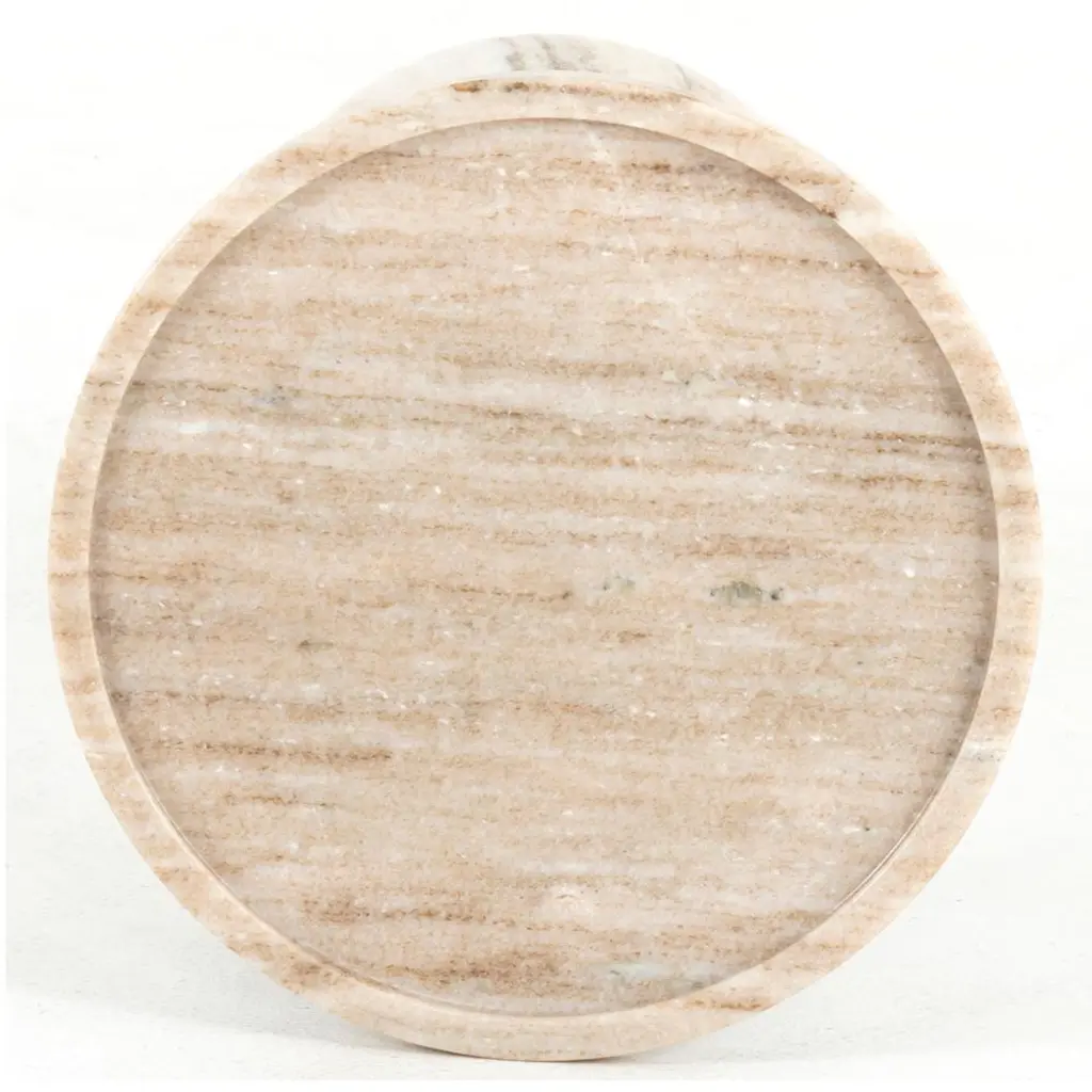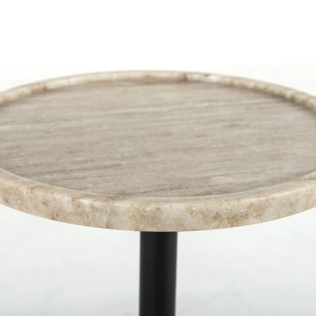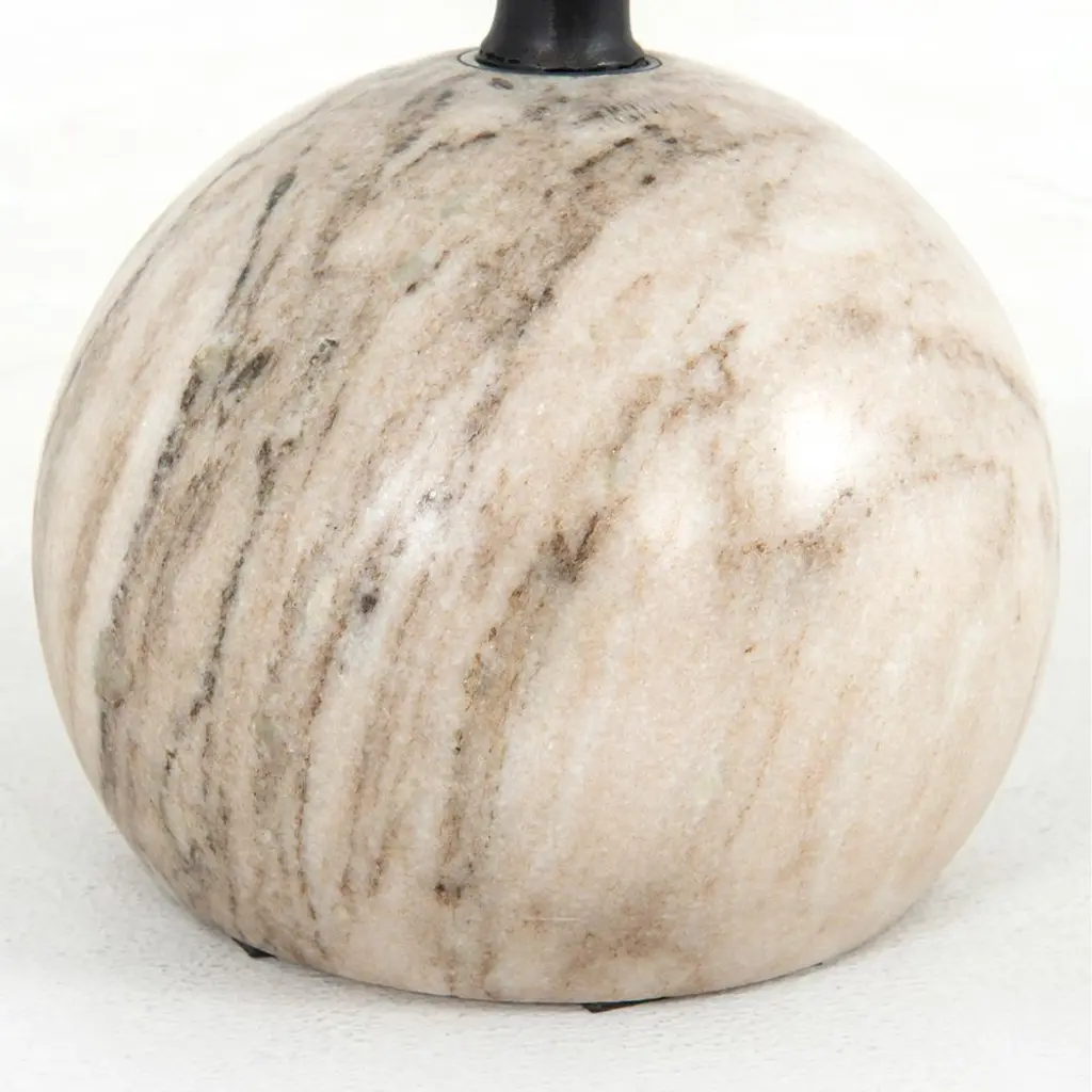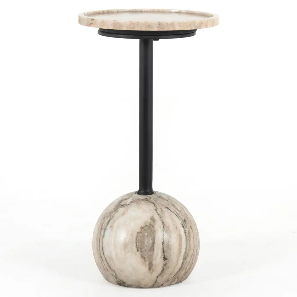 Luxurious materials form a striking silhouette on the Eike drink table. An orb-shaped marble base is finished in antique white, firmly grounding the stylish piece. Slim, black-finished iron piping supports the rounded marble tabletop, perfectly sized to hold your drink of choice.