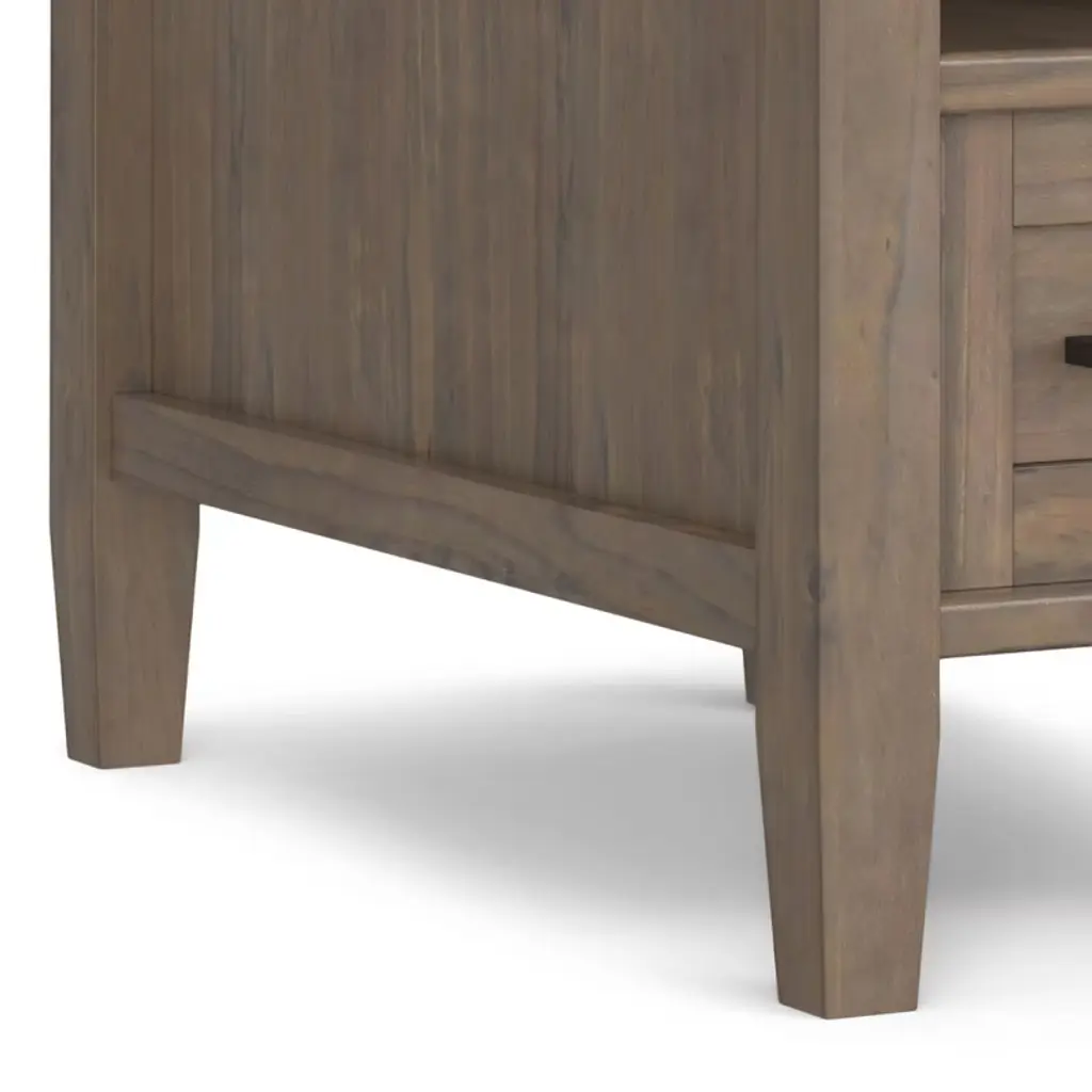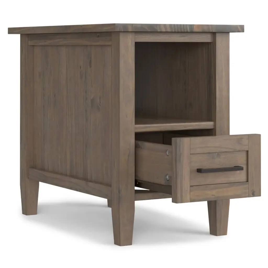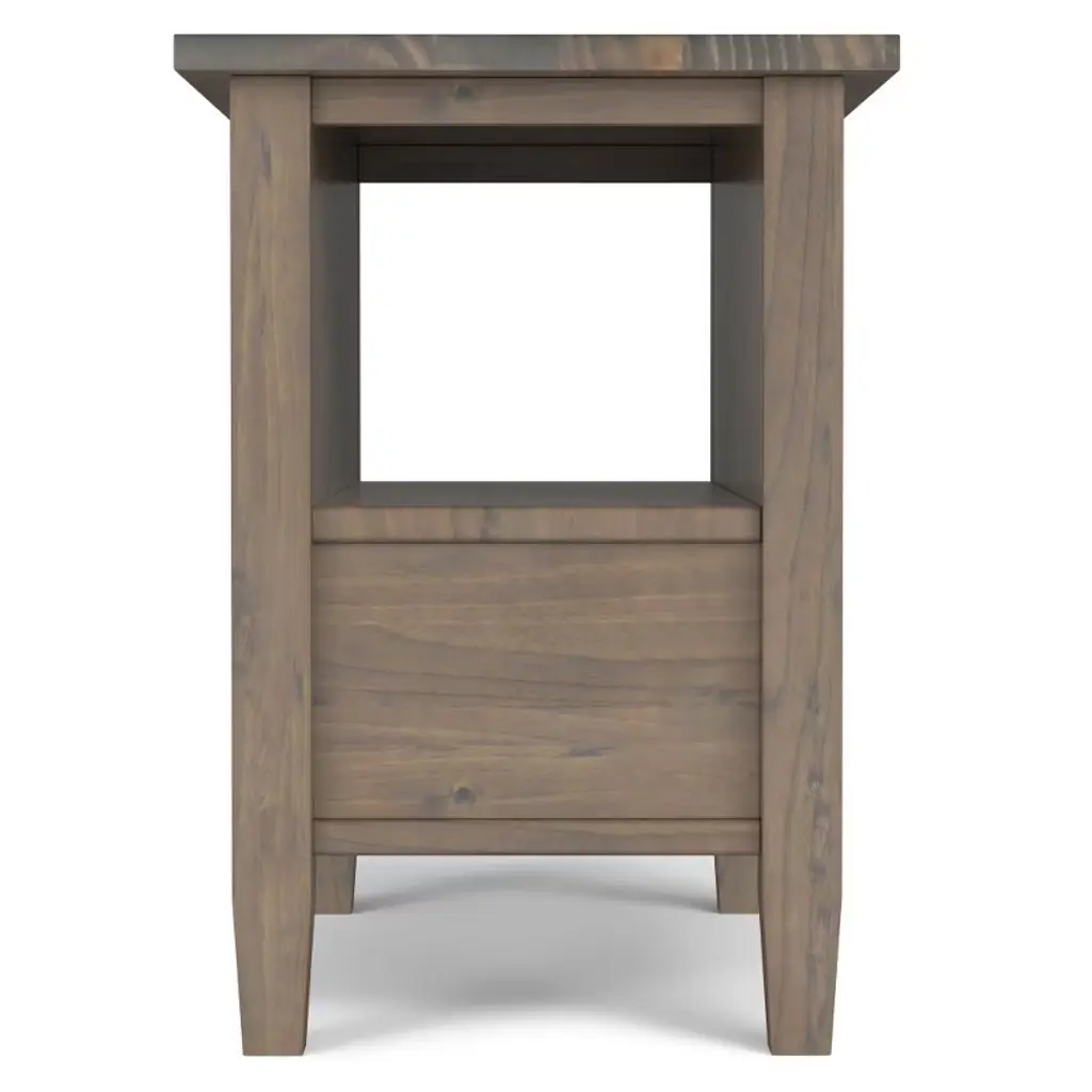 DIMENSIONS: 24in d x 14in w x 20in hHandcrafted with care using the finest quality solid woodHand-finished with a Smoky Brown Stain and a protective NC lacquer to accentuate and highlight the grain and the uniqueness of each piece of furniture.Multipurpose table can be used as an end table or side table. Looks great in your living room, great room, condo or bedroomFeatures one bottom drawer with metal drawer glides and large open shelf for storageTransitional design includes shaker style design on drawer front and sides, bronze handles