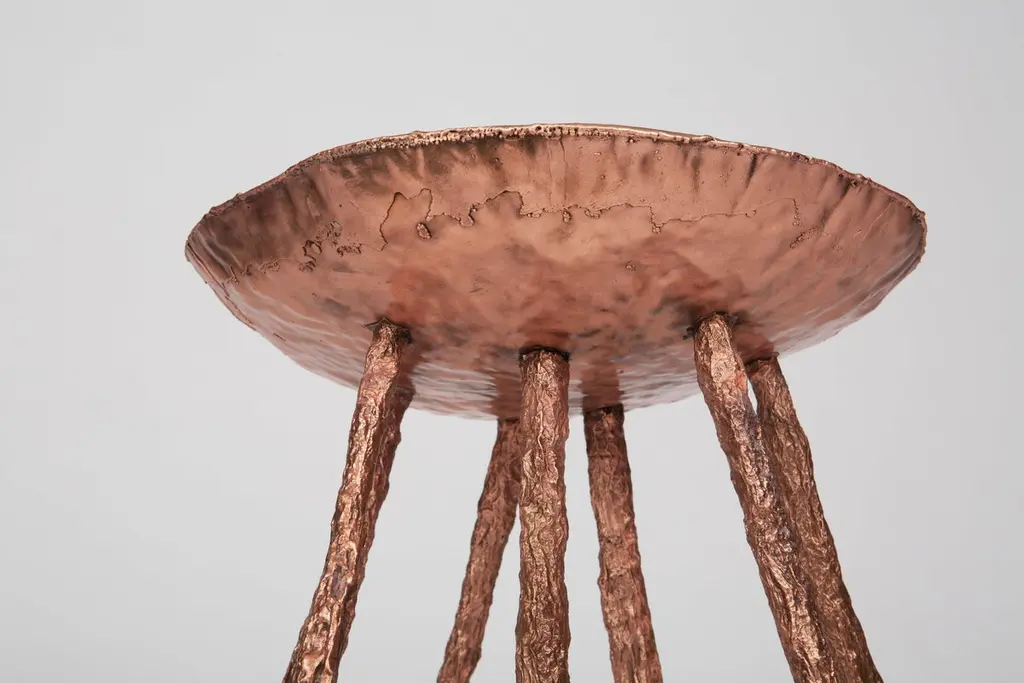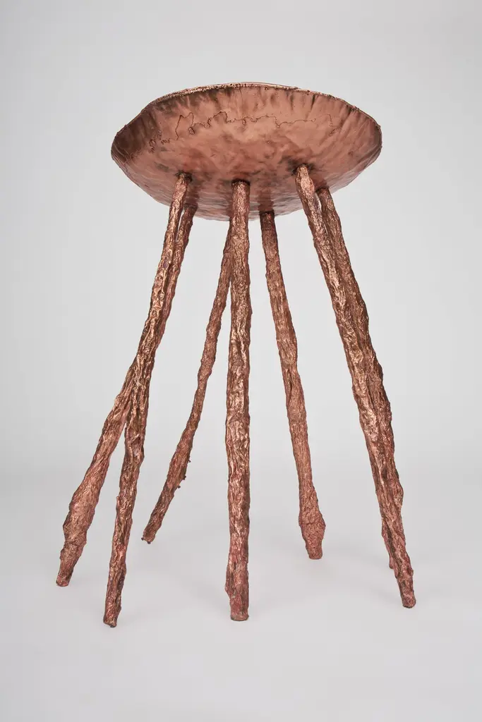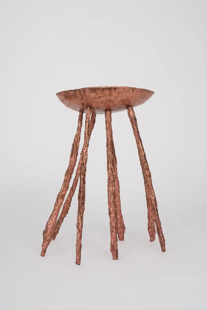 Michael Gittings Studio.Electroformed side tableHand beaten copper topElectroformed copper legs.Dimensions: 40 cm, 60 cm, 40 cm.Limited edition of 3.Michael GittingsMelbourne based designer Michael Gittings aims toChallenge pre-conceptions around furniture, creatingcontemporary, yet unconventional pieces.Utilizing industrial processes Gittings welds, weaves, grinds,pours and grows metal into various functional forms.At the heart of Michael’s work is a desire to exposethe raw materials for what they are. Michael’s designethos shines through in the handmade, unique qualityof each piece.Pushing the boundaries of furniture design, Michael’swork balances both artistic and functional sensibilities.