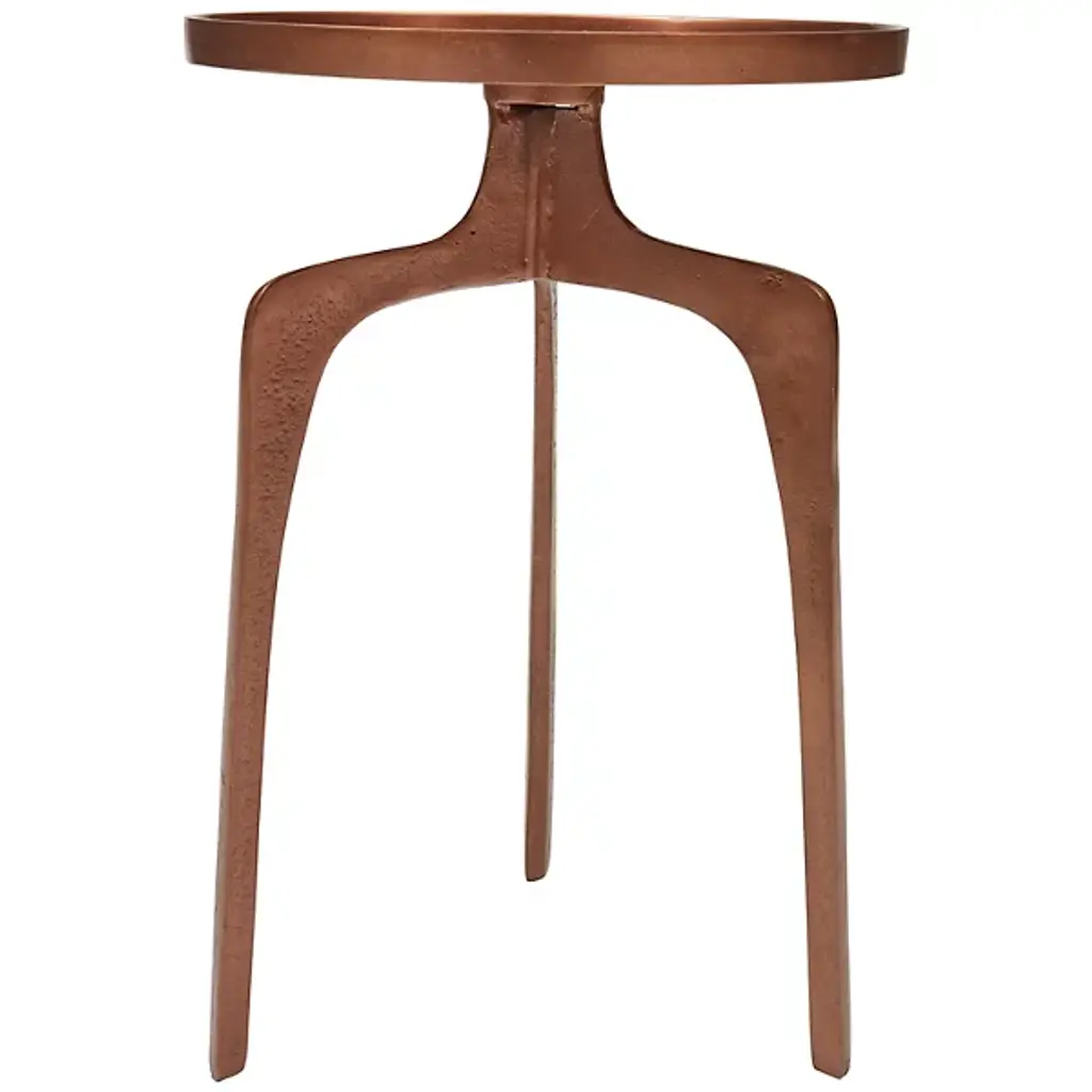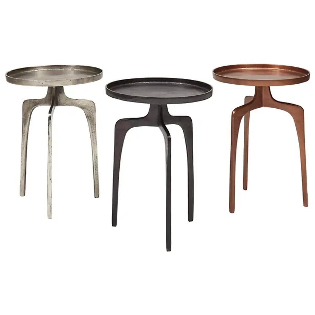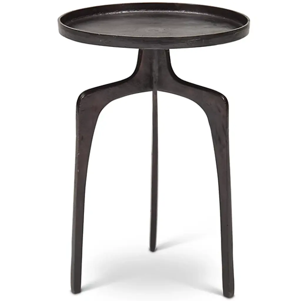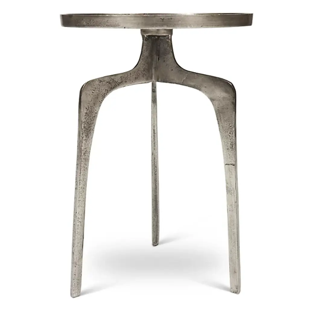 Midcentury style furniture for the modern home. The Elements Vinya End Table by Urbia boasts an eye-catching rustic appeal characterized by a forked tripod base, rimmed round surface and sleek aluminum construction. Decorate it with plants and photos or nestle it beside your favorite chair for placing drinks and plates of food. Either way, this table will instantly enhance the form and functionality of your living space, with its unique hand-crafted construction creating a totally unique surface and yielding a true collector's item.