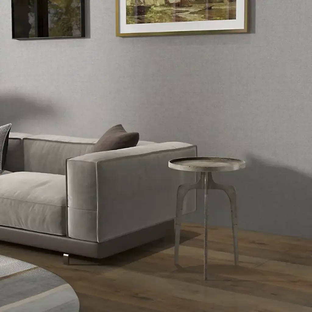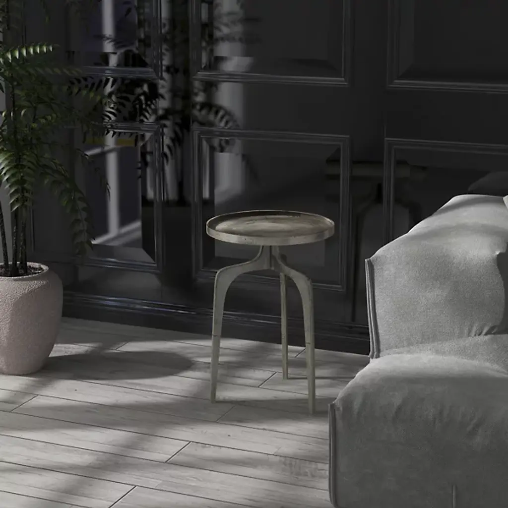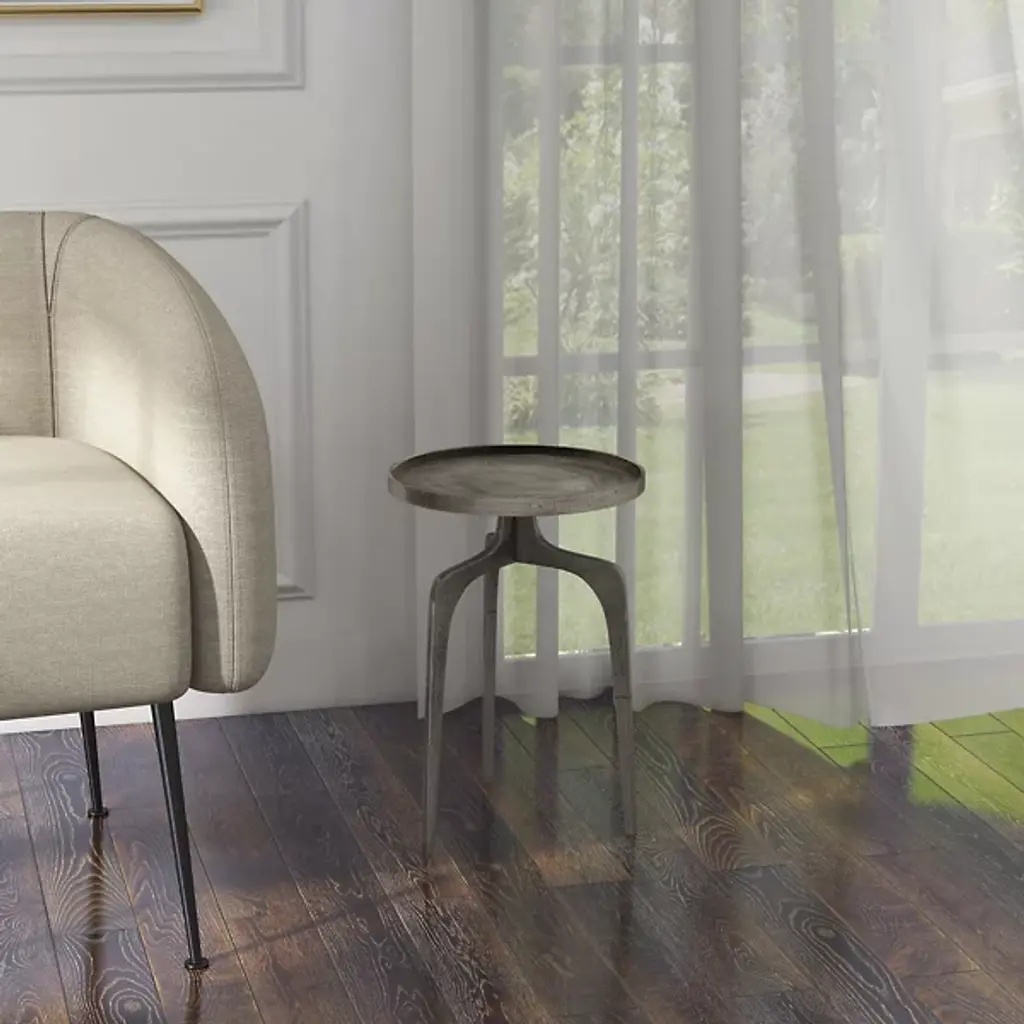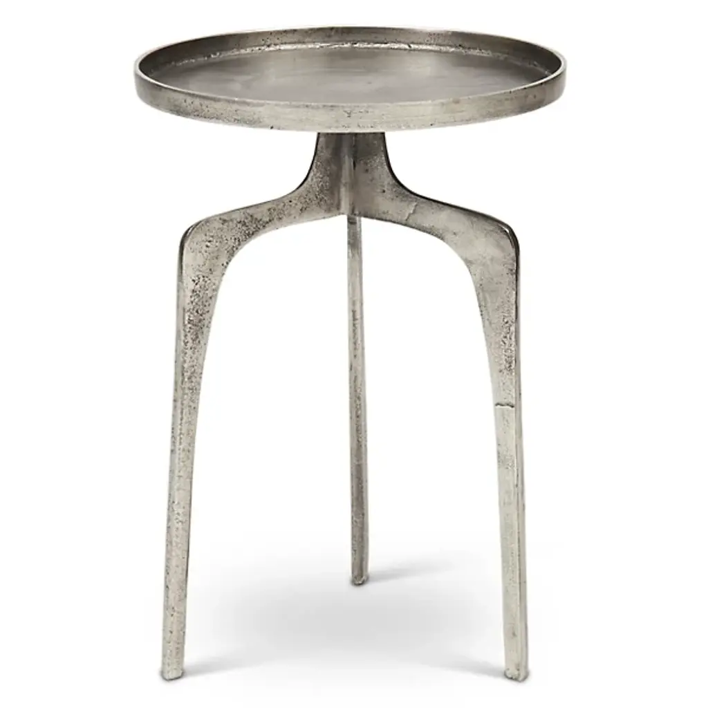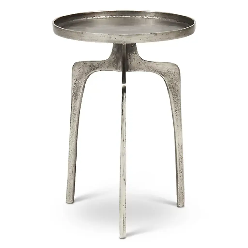 Midcentury style furniture for the modern home. The Elements Vinya End Table by Urbia boasts an eye-catching rustic appeal characterized by a forked tripod base, rimmed round surface and sleek aluminum construction. Decorate it with plants and photos or nestle it beside your favorite chair for placing drinks and plates of food. Either way, this table will instantly enhance the form and functionality of your living space, with its unique hand-crafted construction creating a totally unique surface and yielding a true collector's item.