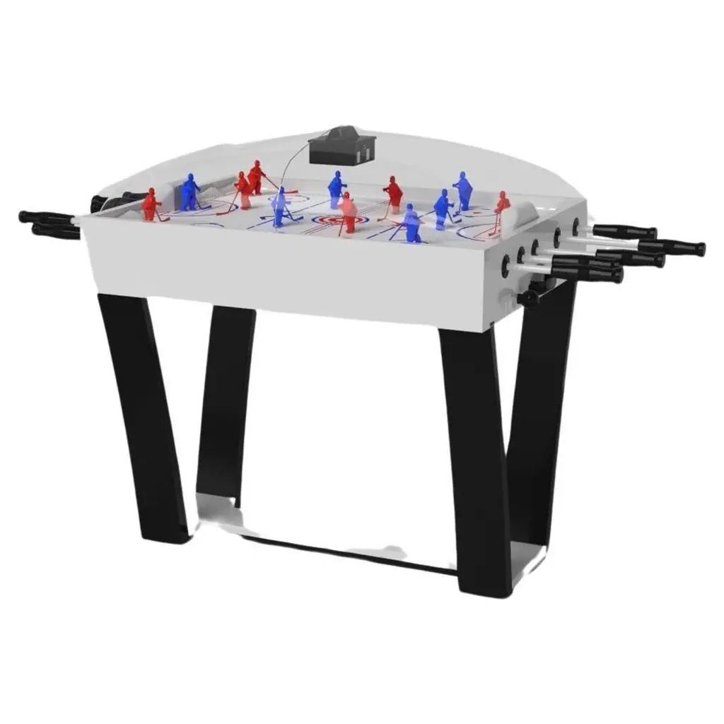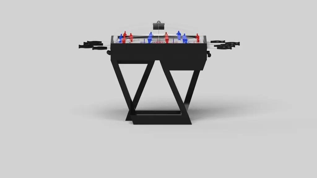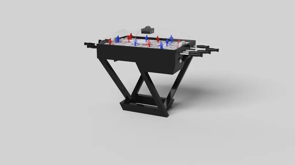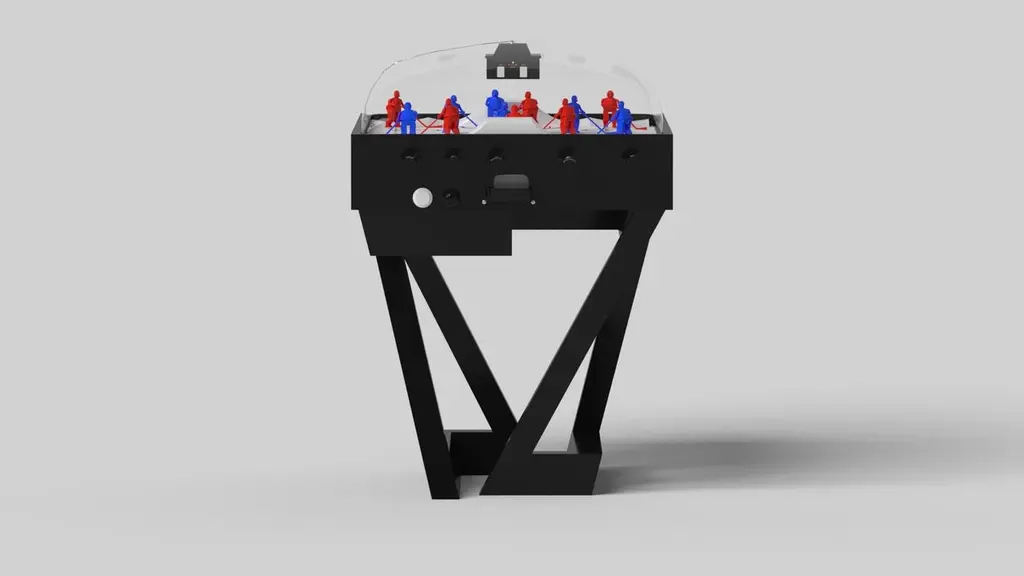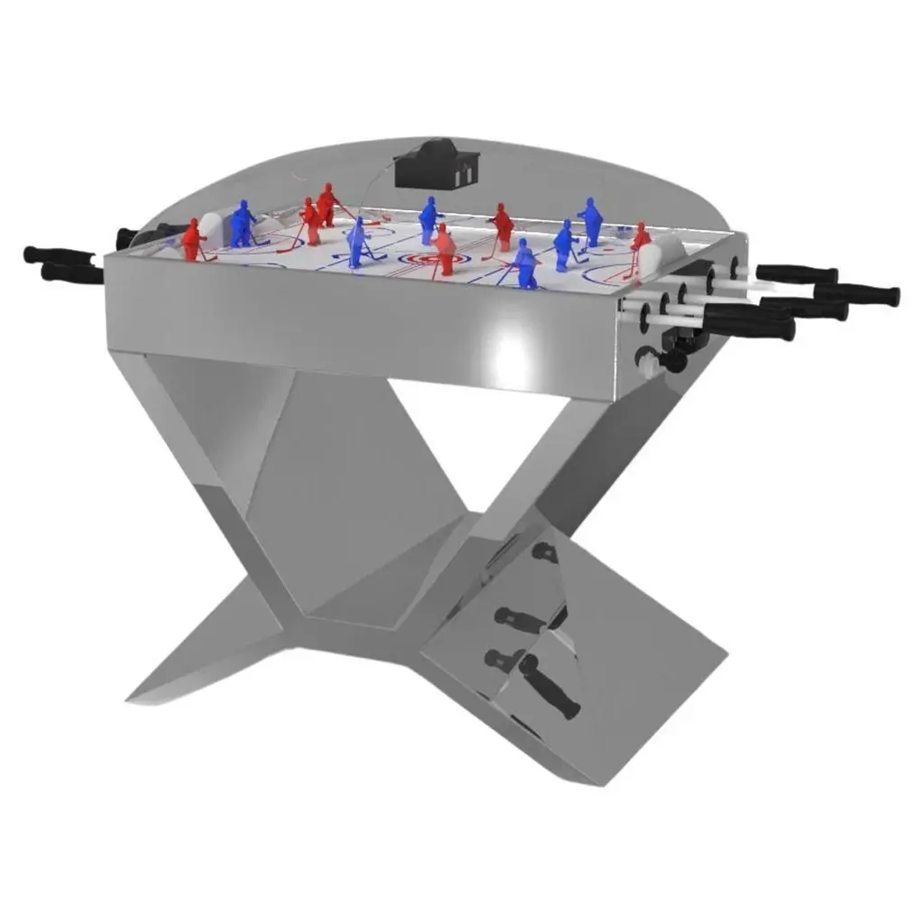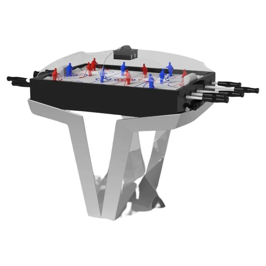 A contemporary composition of clean lines and sleek edges, the Trinity dome hockey table in black chrome with red accents is an elegant expression of modern design. Handcrafted from natural maple wood, this table offers statement-making style with sharp angles that form three distinct triangles when viewed from the side. When viewed from each end, a Z-shaped pattern takes form, giving this high-end table a bold, geometric appeal that fits seamlessly into any modern room design.Size:45”X34”X47”