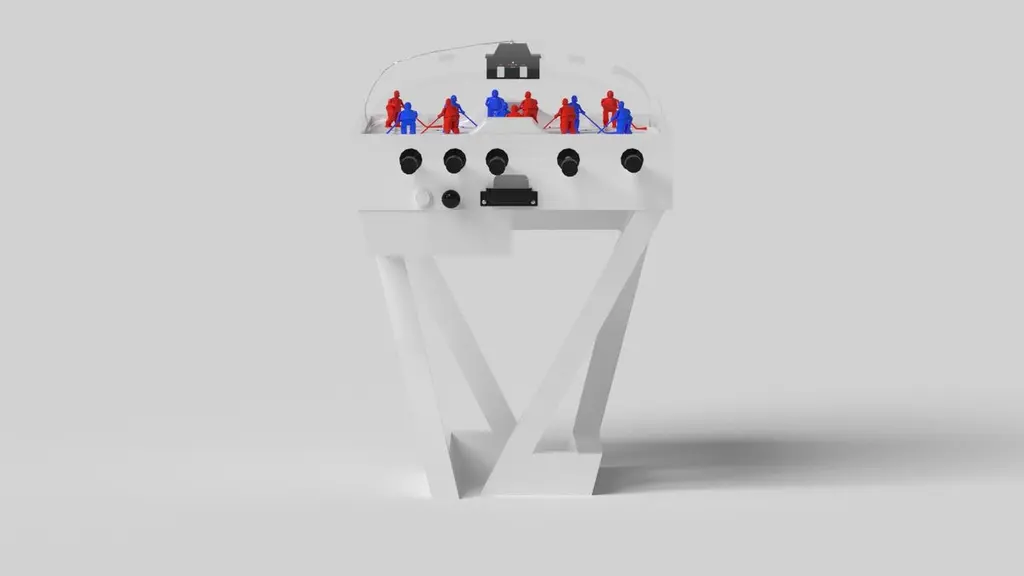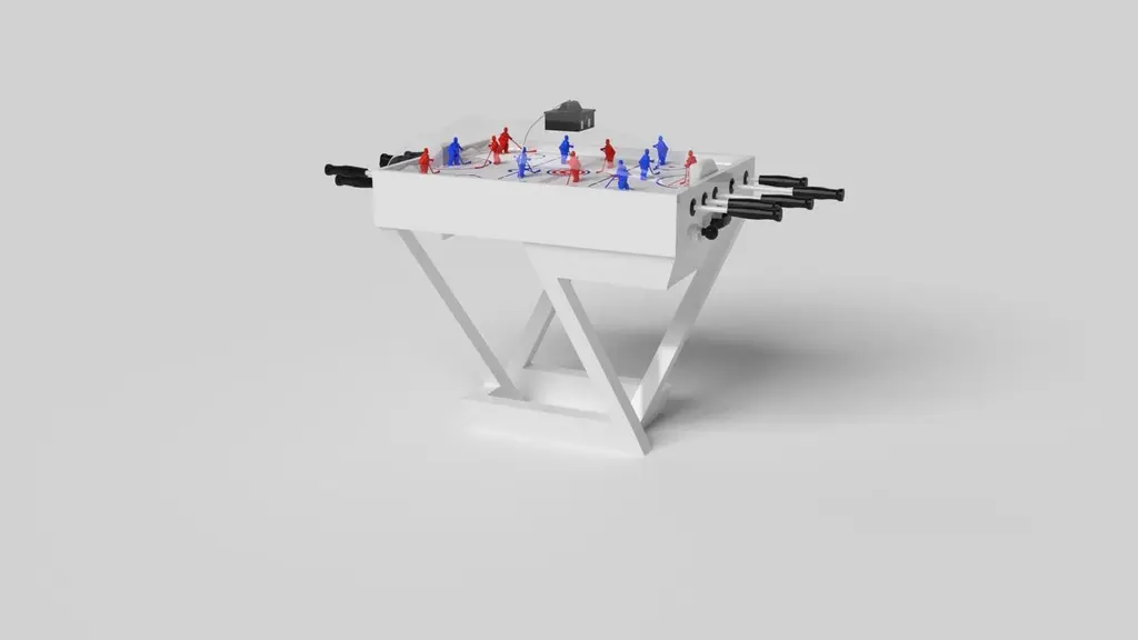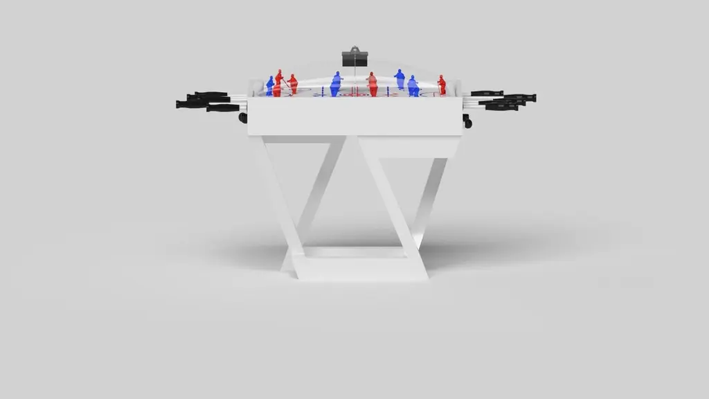 A contemporary composition of clean lines and sleek edges, the Trinity dome hockey table in black chrome with red accents is an elegant expression of modern design. Handcrafted from natural maple wood, this table offers statement-making style with sharp angles that form three distinct triangles when viewed from the side. When viewed from each end, a Z-shaped pattern takes form, giving this high-end table a bold, geometric appeal that fits seamlessly into any modern room design.Size:45”X34”X47”