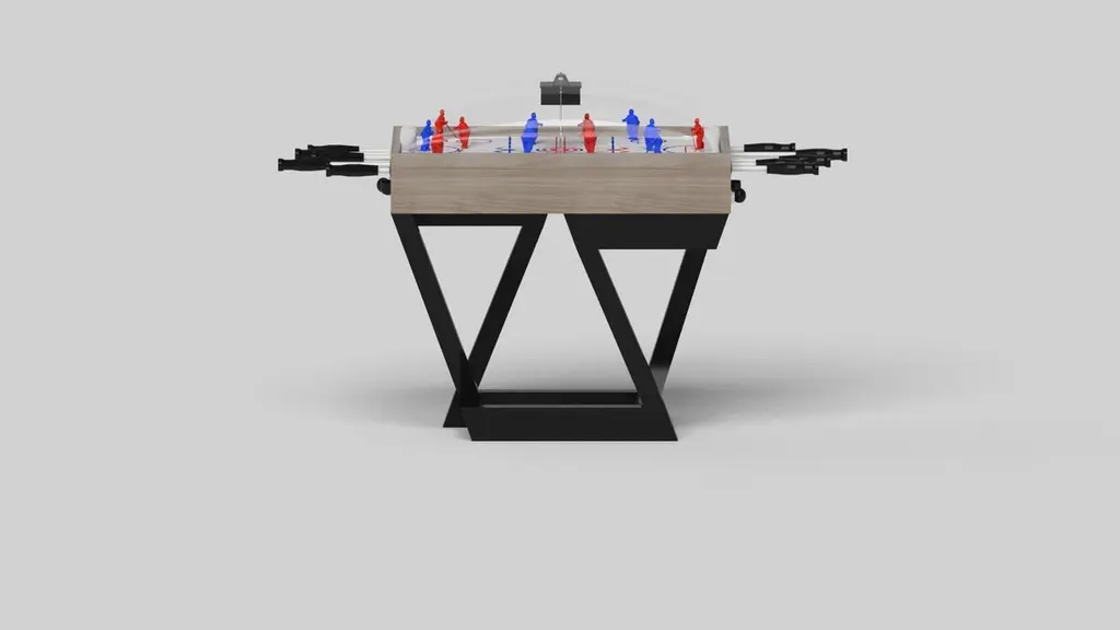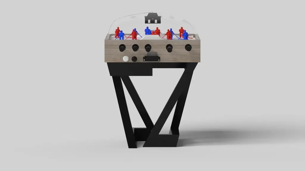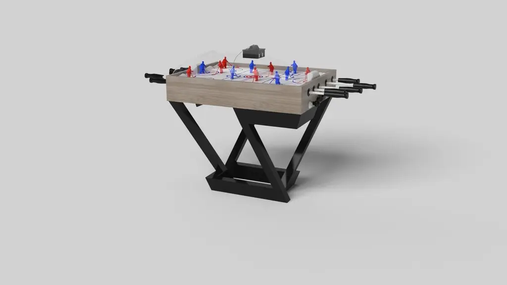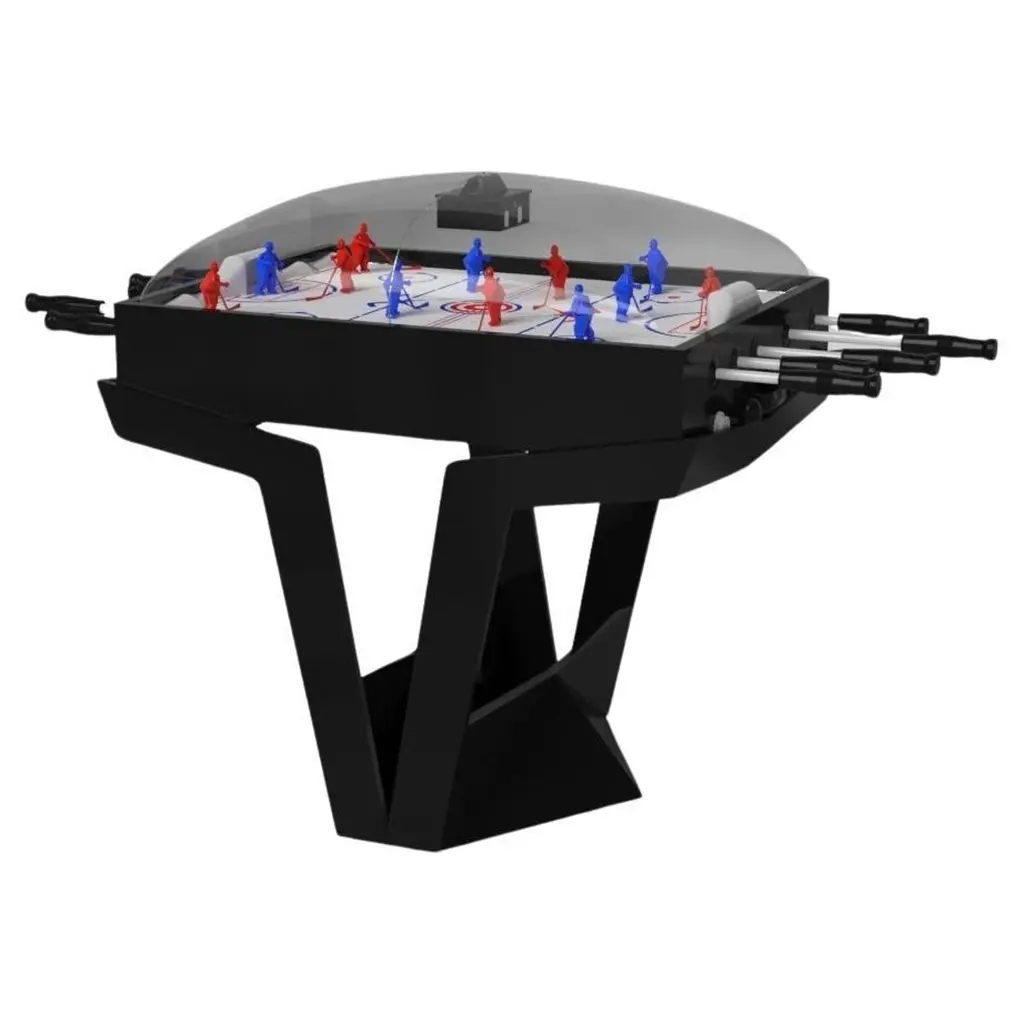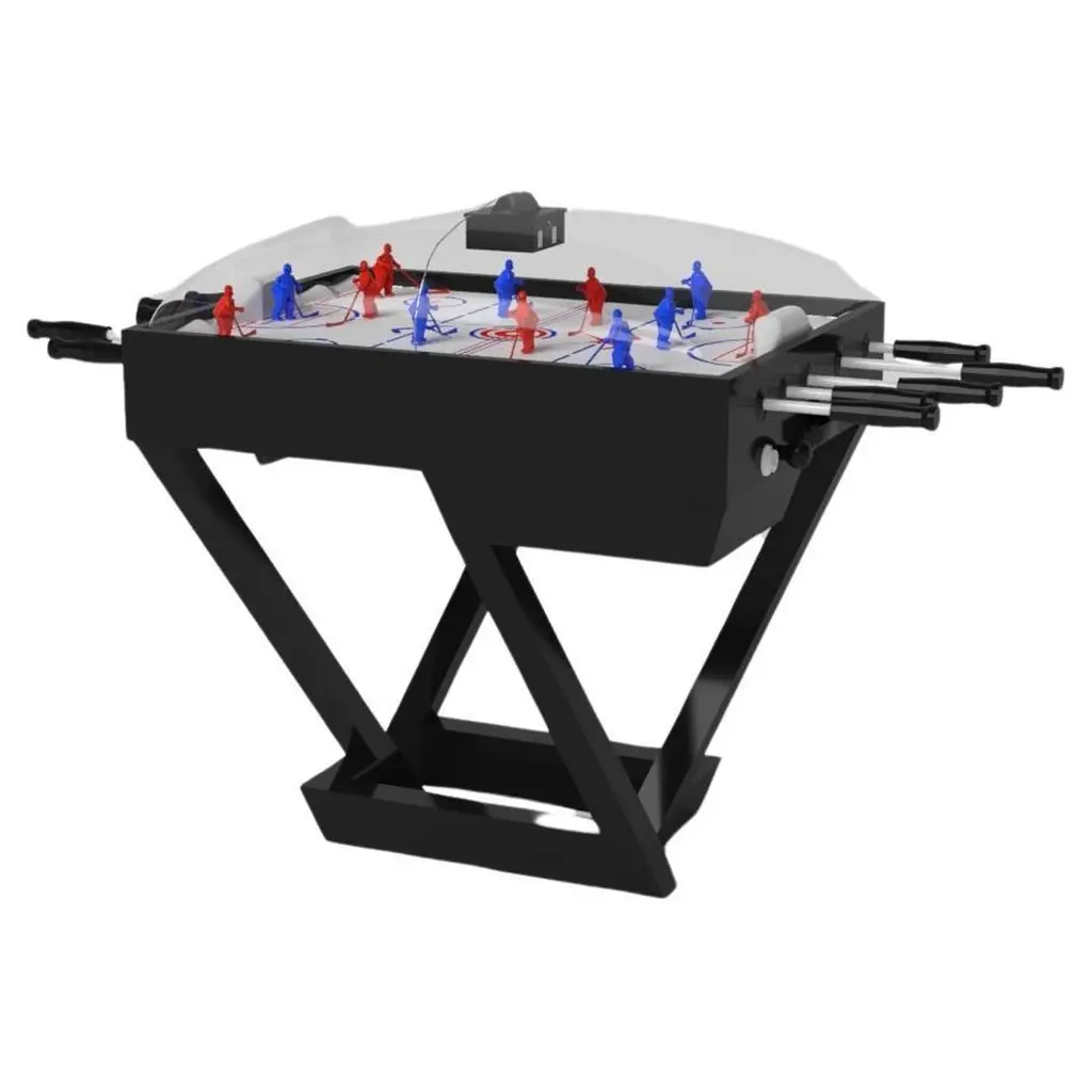 A contemporary composition of clean lines and sleek edges, the Trinity dome hockey table in black chrome with red accents is an elegant expression of modern design. Handcrafted from natural maple wood, this table offers statement-making style with sharp angles that form three distinct triangles when viewed from the side. When viewed from each end, a Z-shaped pattern takes form, giving this high-end table a bold, geometric appeal that fits seamlessly into any modern room design.Size:45”X34”X47”