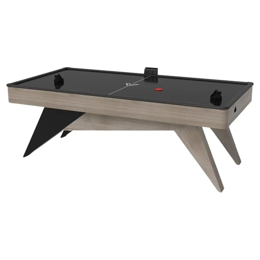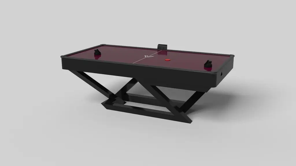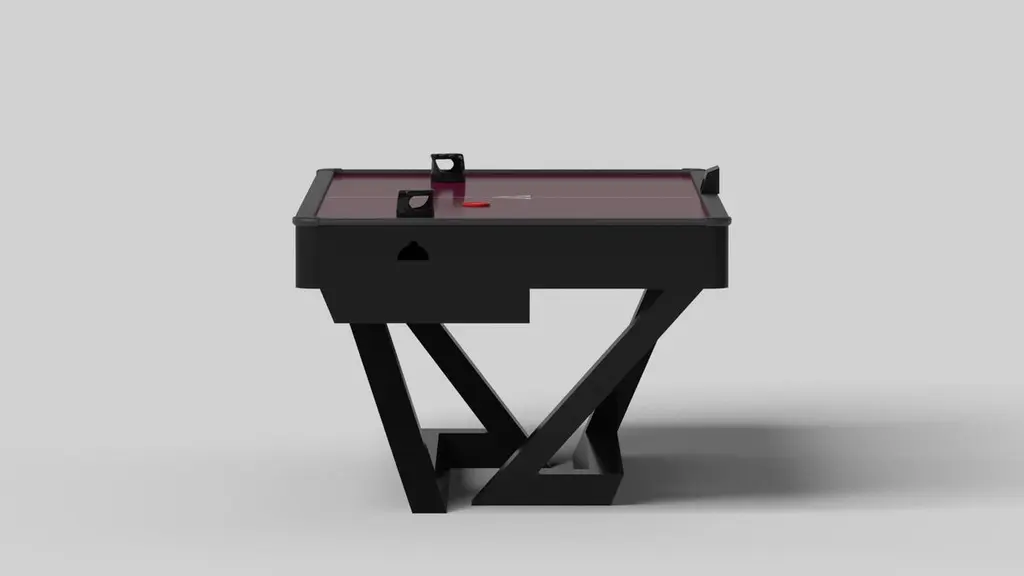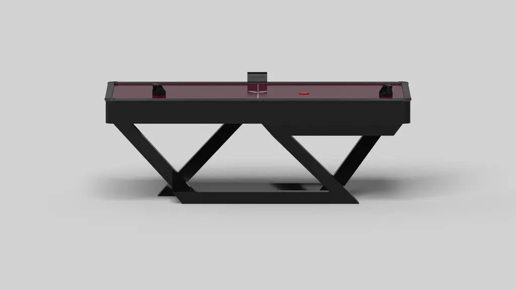 A contemporary composition of clean lines and sleek edges, the Trinity air hockey table in black with red accents is an elegant expression of modern design. Handcrafted and detailed with a regulation top for professional game play, this table offers statement-making style with sharp angles that form three distinct triangles when viewed from the side. When viewed from each end, a Z-shaped pattern takes form, giving this high-end table a bold, geometric appeal that fits seamlessly into any modern room design.Size:88”X45”X31”