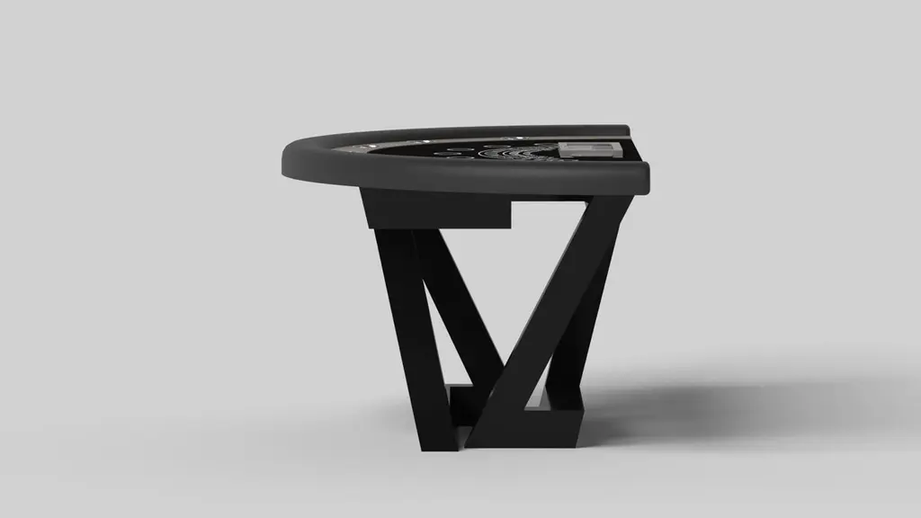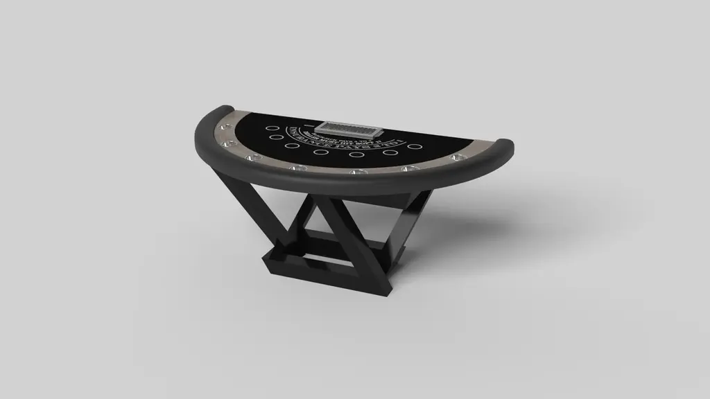 A contemporary composition of clean lines and sleek edges, the Trinity blackjack table in Black is an elegant expression of modern design. Handcrafted in a semicircular design with a chip rack and betting circles, this table offers statement-making style with sharp angles that form three distinct triangles when viewed from the side. When viewed from each end, a Z-shaped pattern takes form, giving this high-end table a bold, geometric appeal that fits seamlessly into any modern room design.Size:88”X46”X30” (Bar Height)Custom Sizes Available Per Request