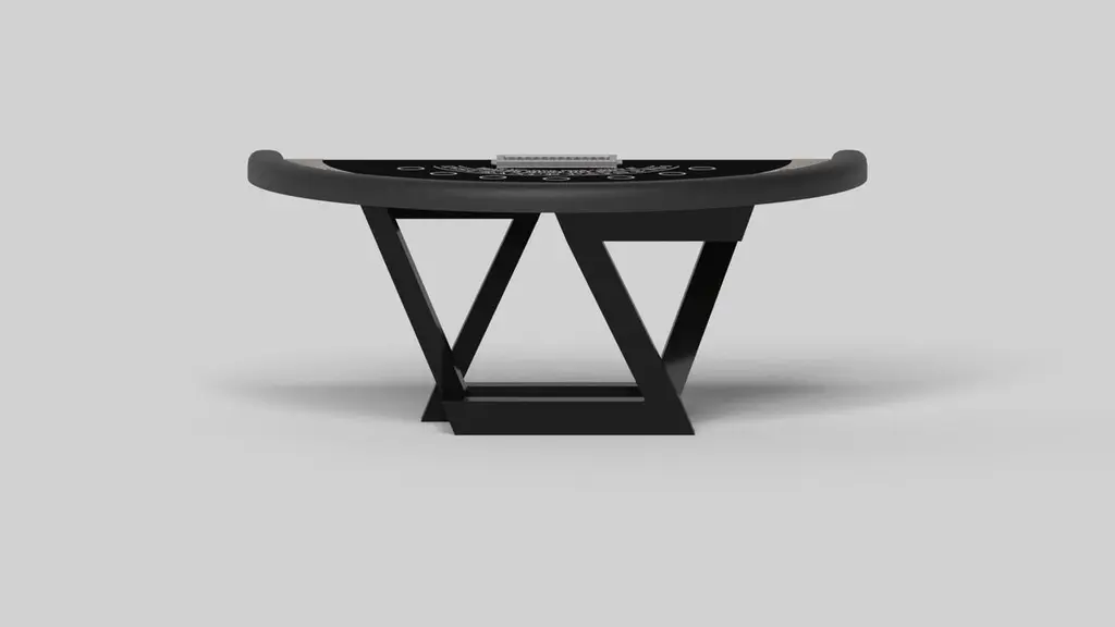 A contemporary composition of clean lines and sleek edges, the Trinity blackjack table in Black is an elegant expression of modern design. Handcrafted in a semicircular design with a chip rack and betting circles, this table offers statement-making style with sharp angles that form three distinct triangles when viewed from the side. When viewed from each end, a Z-shaped pattern takes form, giving this high-end table a bold, geometric appeal that fits seamlessly into any modern room design.Size:88”X46”X30” (Dining Height)Custom Sizes Available Per Request