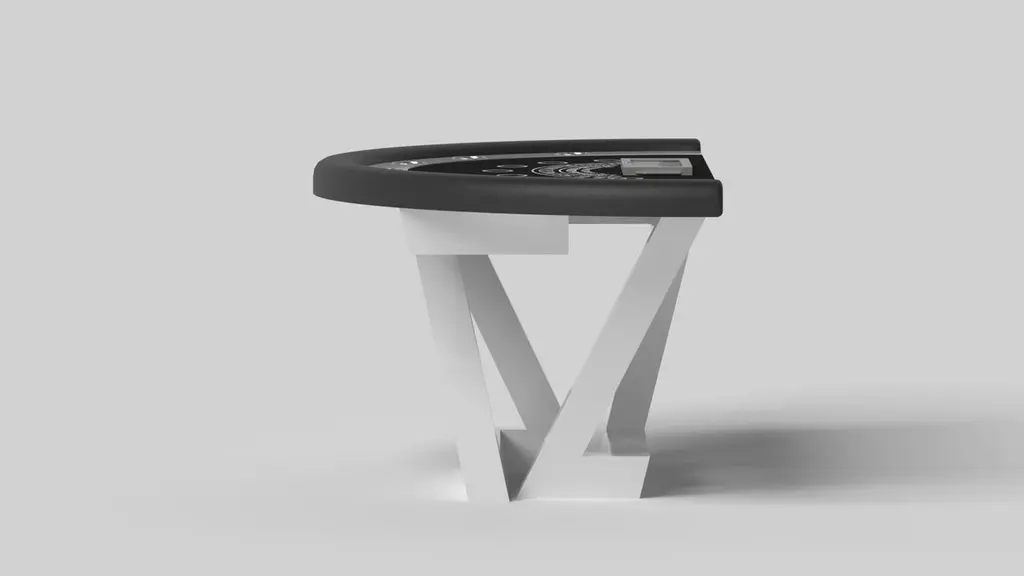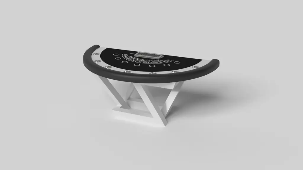 A contemporary composition of clean lines and sleek edges, the Trinity blackjack table in Black is an elegant expression of modern design. Handcrafted in a semicircular design with a chip rack and betting circles, this table offers statement-making style with sharp angles that form three distinct triangles when viewed from the side. When viewed from each end, a Z-shaped pattern takes form, giving this high-end table a bold, geometric appeal that fits seamlessly into any modern room design.Size:88”X46”X30” (Bar Height)Custom Sizes Available Per Request