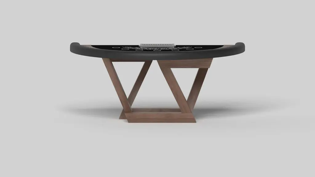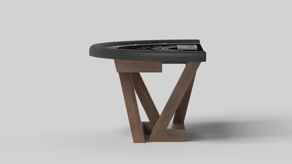 A contemporary composition of clean lines and sleek edges, the Trinity blackjack table in Black is an elegant expression of modern design. Handcrafted in a semicircular design with a chip rack and betting circles, this table offers statement-making style with sharp angles that form three distinct triangles when viewed from the side. When viewed from each end, a Z-shaped pattern takes form, giving this high-end table a bold, geometric appeal that fits seamlessly into any modern room design.Size:88”X46”X30” (Bar Height)Custom Sizes Available Per Request