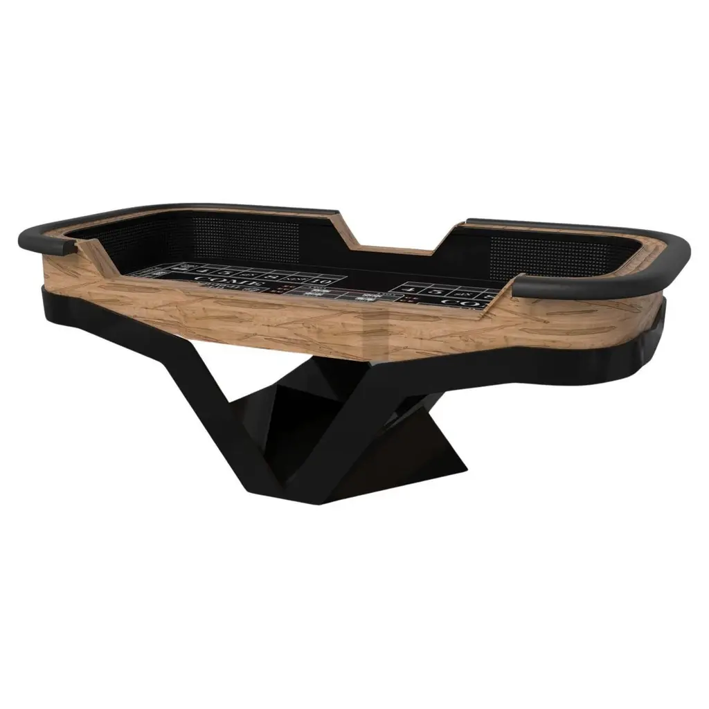 A contemporary composition of clean lines and sleek edges, the Trinity craps table in black with red is an elegant expression of modern design. Handcrafted in a rectangular design with point boxes and bet blocks, this table offers statement-making style with sharp angles that form three distinct triangles when viewed from the side. When viewed from each end, a Z-shaped pattern takes form, giving this high-end table a bold, geometric appeal that fits seamlessly into any modern room design.Size:117”X60”X42”Custom Sizes Available Per Request