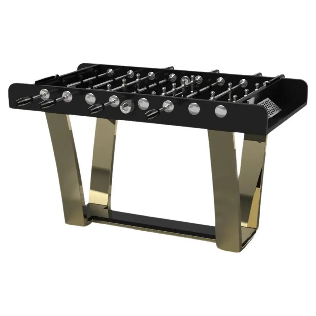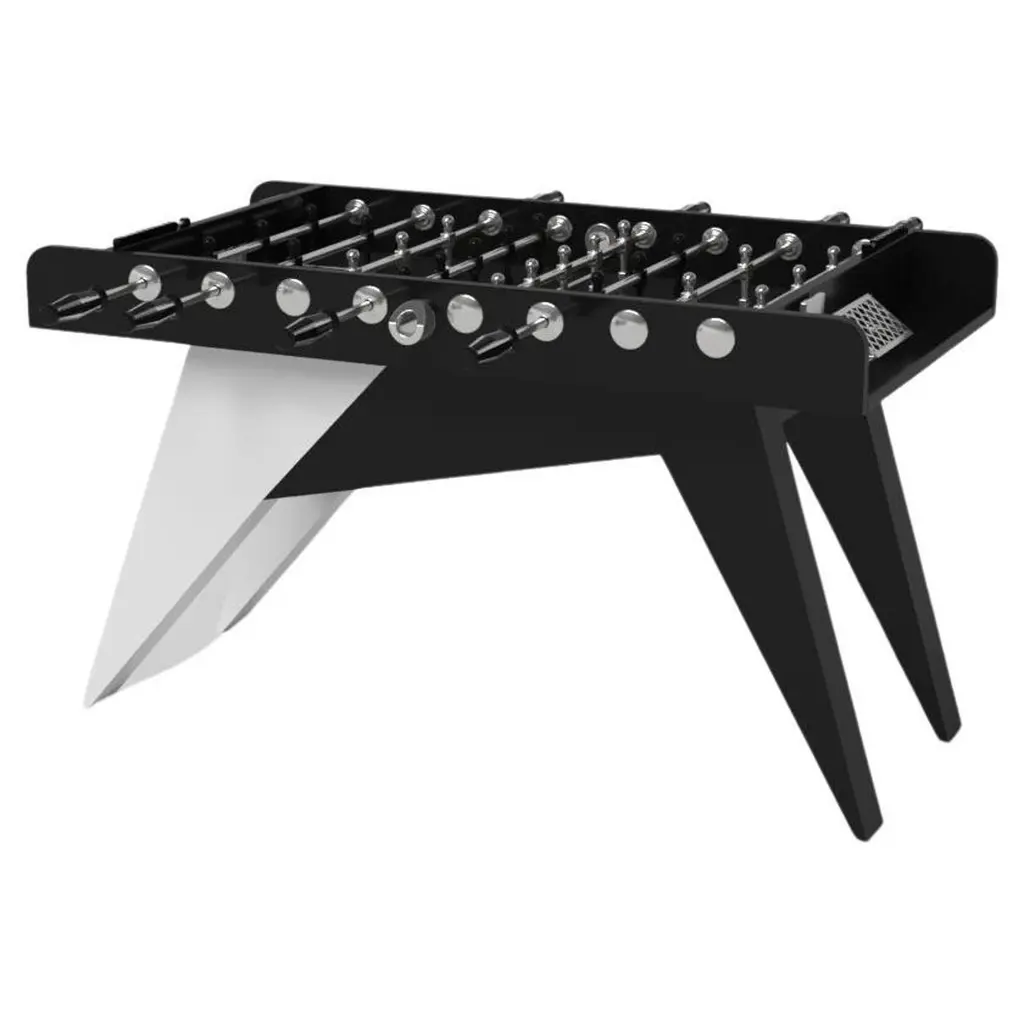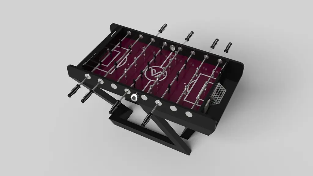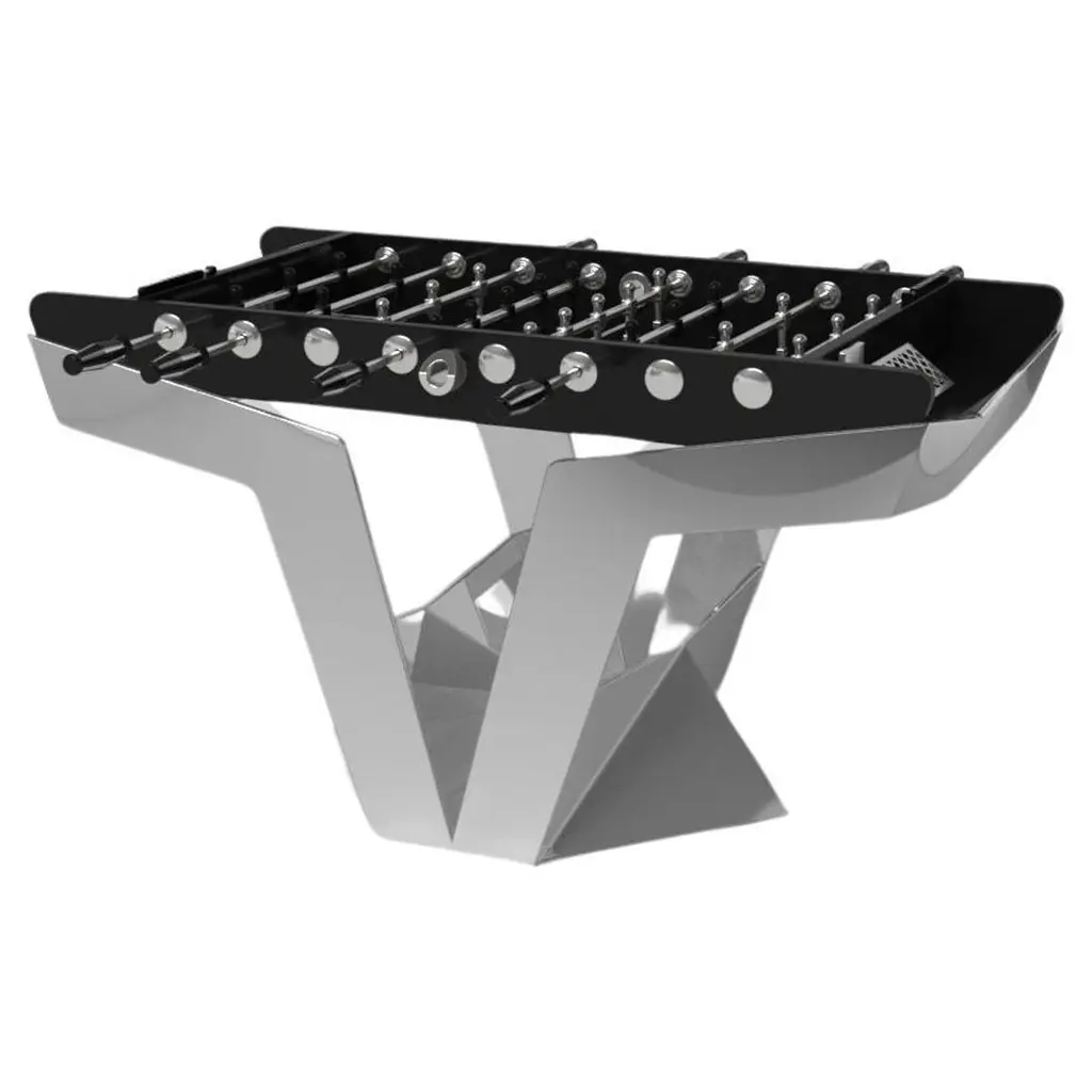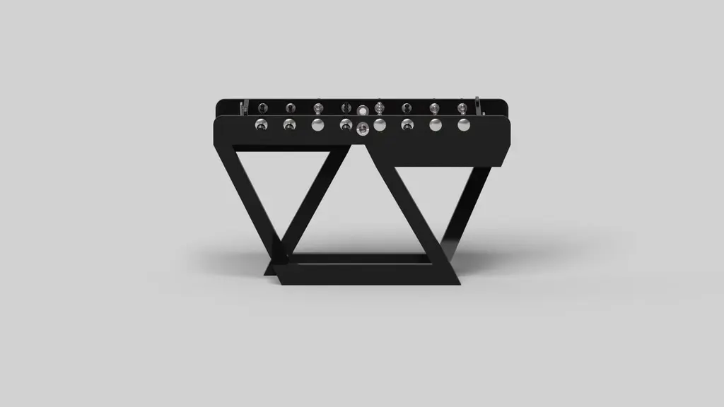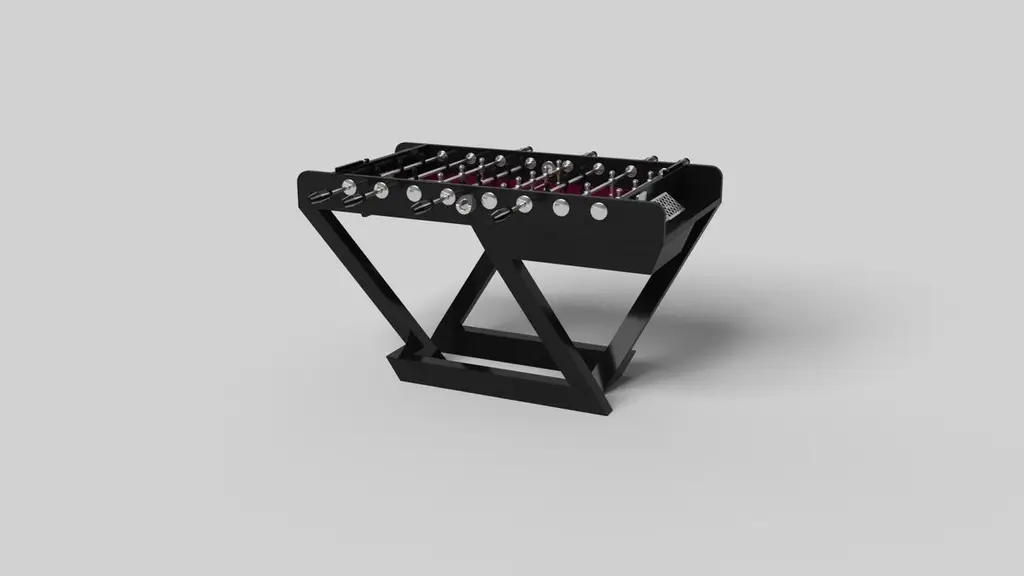 A contemporary composition of clean lines and sleek edges, the Trinity foosball table in black chrome with red accent is an elegant expression of modern design. Handcrafted from durable metal with vibrant red accents and a regulation top for professional game play, this table offers statement-making style with sharp angles that form three distinct triangles when viewed from the side. When viewed from each end, a Z-shaped pattern takes form, giving this high-end table a bold, geometric appeal that fits seamlessly into any modern room design.Size:62”X31”X36”