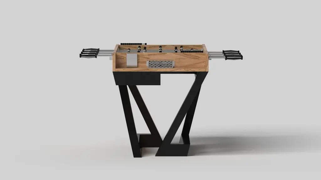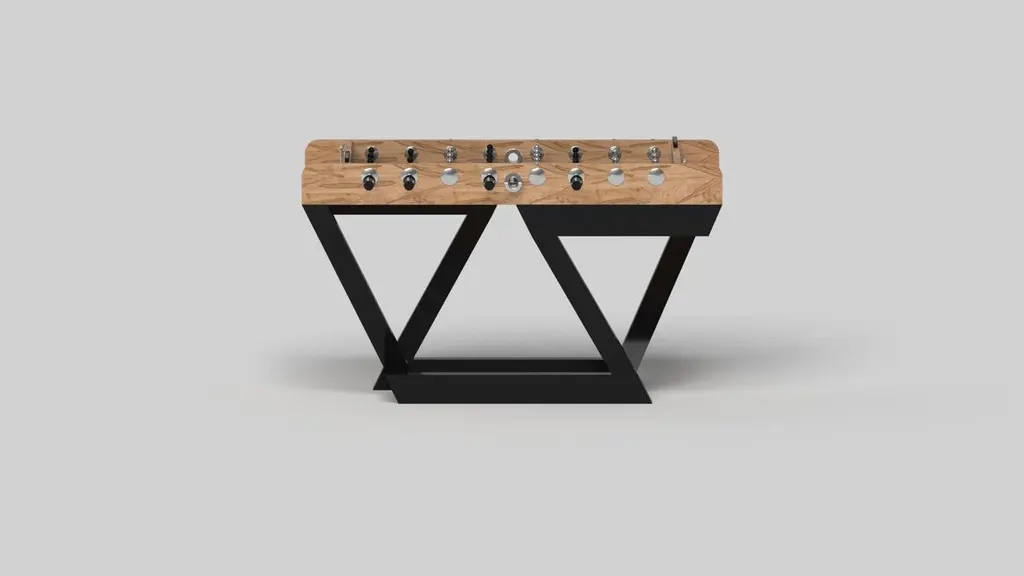A contemporary composition of clean lines and sleek edges, the Trinity foosball table in black chrome with red accent is an elegant expression of modern design. Handcrafted from durable metal with vibrant red accents and a regulation top for professional game play, this table offers statement-making style with sharp angles that form three distinct triangles when viewed from the side. When viewed from each end, a Z-shaped pattern takes form, giving this high-end table a bold, geometric appeal that fits seamlessly into any modern room design.Size:62”X31”X36”