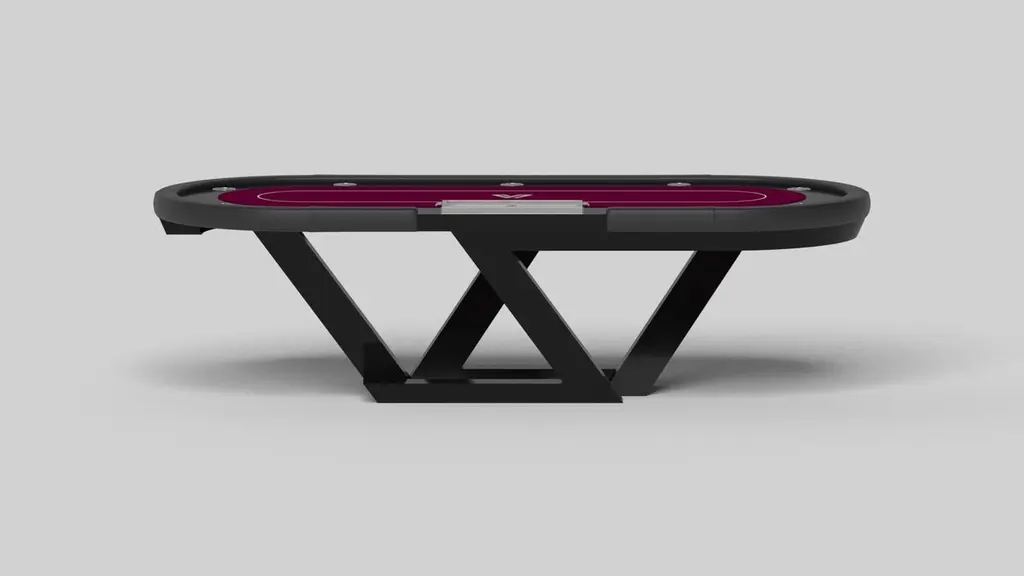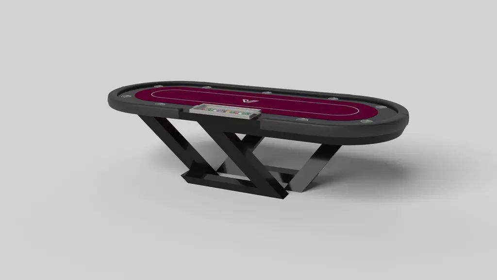 A contemporary composition of clean lines and sleek edges, the Trinity poker table in black chrome with red accent is an elegant expression of modern design. Handcrafted from durable metal with vibrant red accents and a regulation top for professional game play, this table offers statement-making style with sharp angles that form three distinct triangles when viewed from the side. When viewed from each end, a Z-shaped pattern takes form, giving this high-end table a bold, geometric appeal that fits seamlessly into any modern room design.Size:104”X44”X30”Custom Sizes Available Per RequestCustom Table-Top Shapes Available Per Request