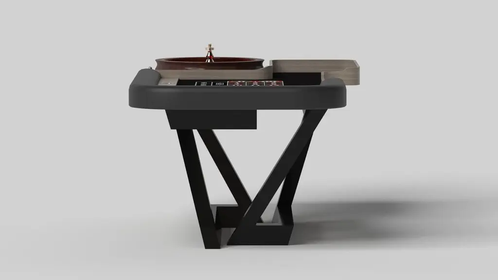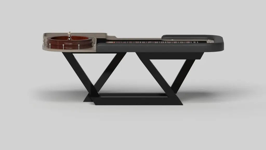 A contemporary composition of clean lines and sleek edges, the Trinity roulette table in black with red is an elegant expression of modern design. Handcrafted in a rectangular design with a classic roulette wheel and bet boxes, this table offers statement-making style with sharp angles that form three distinct triangles when viewed from the side. When viewed from each end, a Z-shaped pattern takes form, giving this high-end table a bold, geometric appeal that fits seamlessly into any modern room design.Size:98”X50”X30”Custom Sizes Available Per Request
