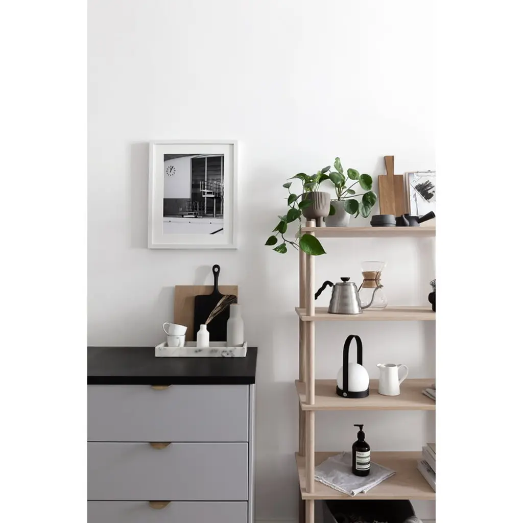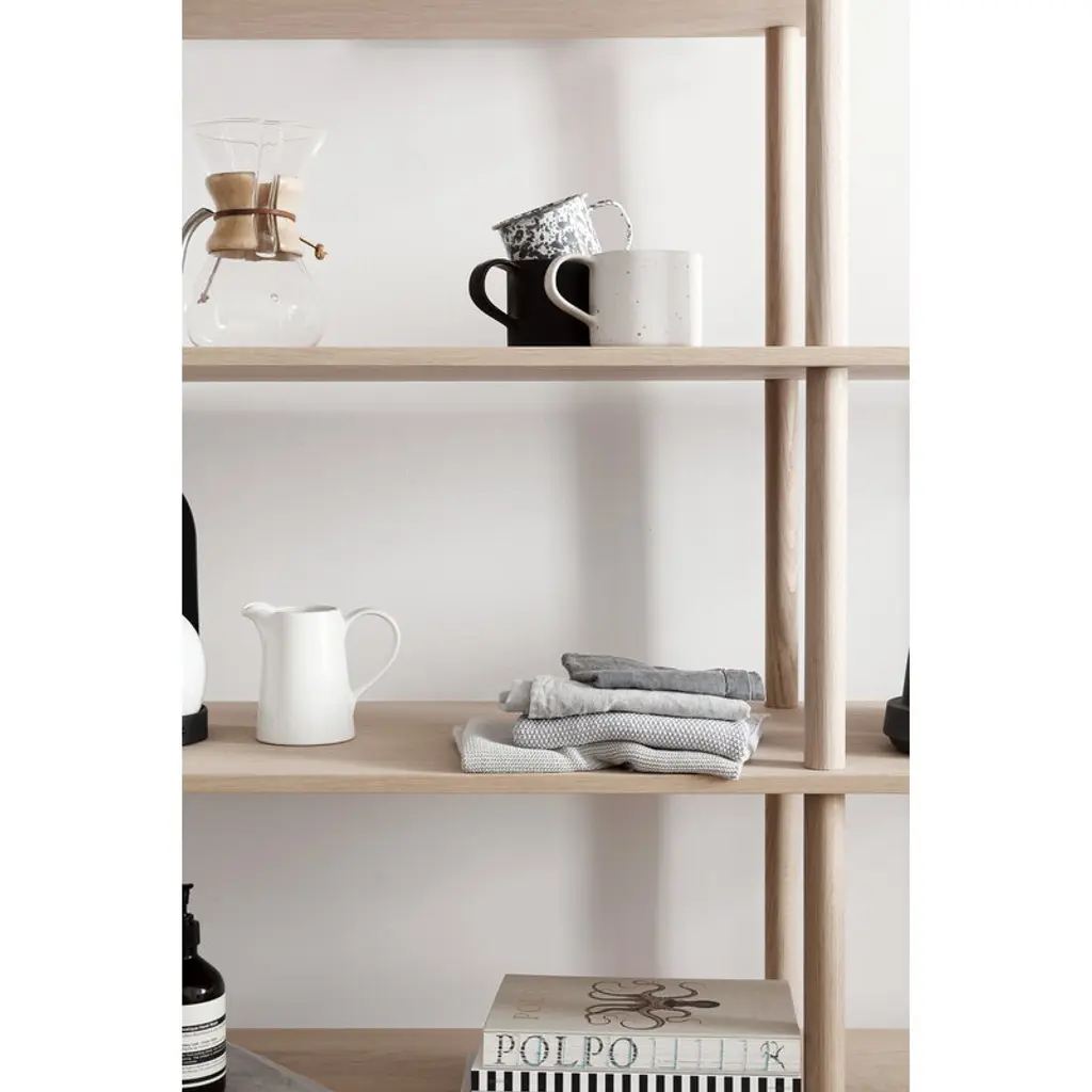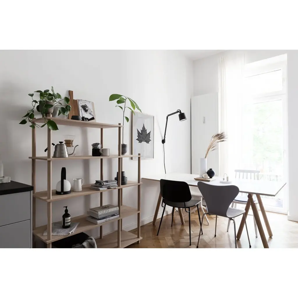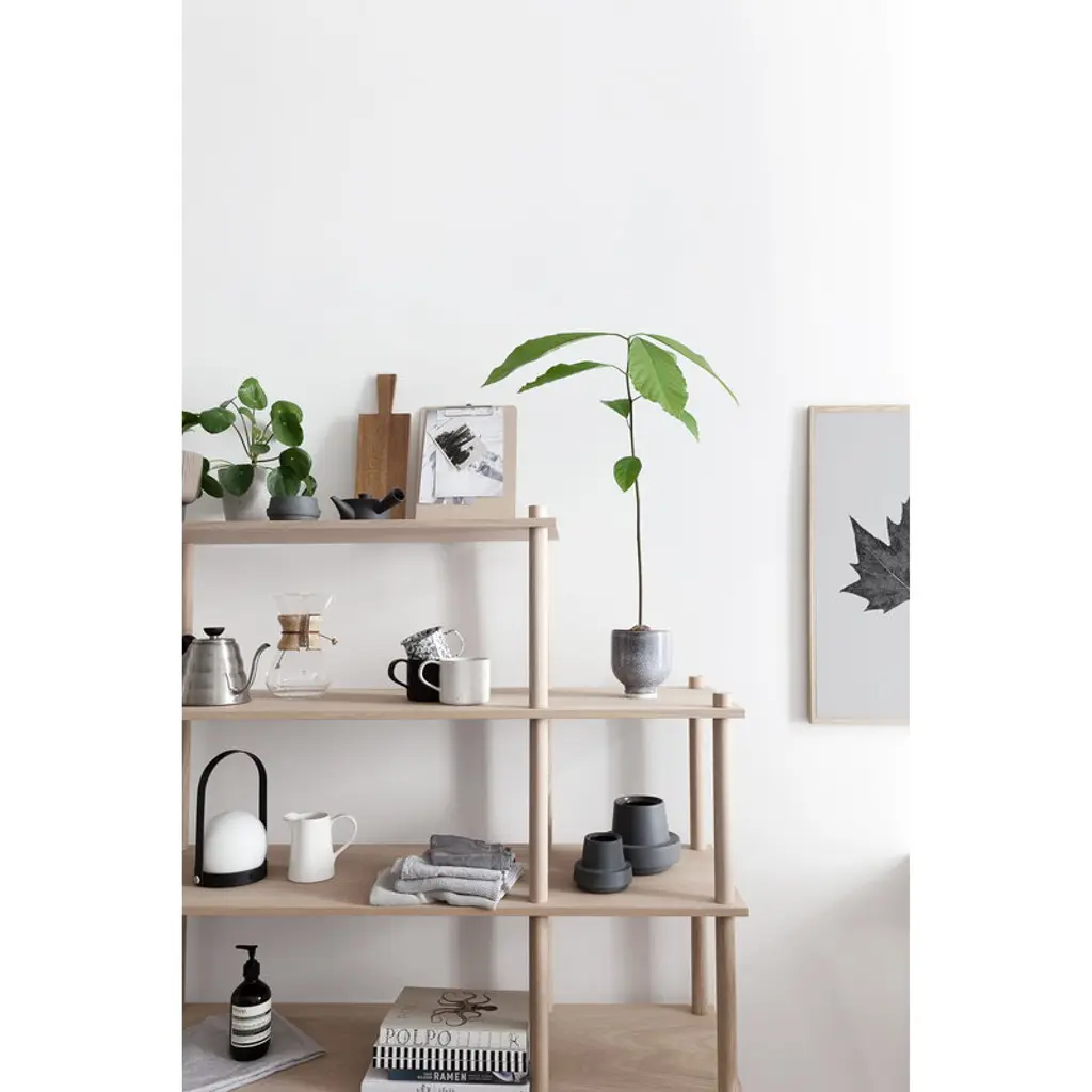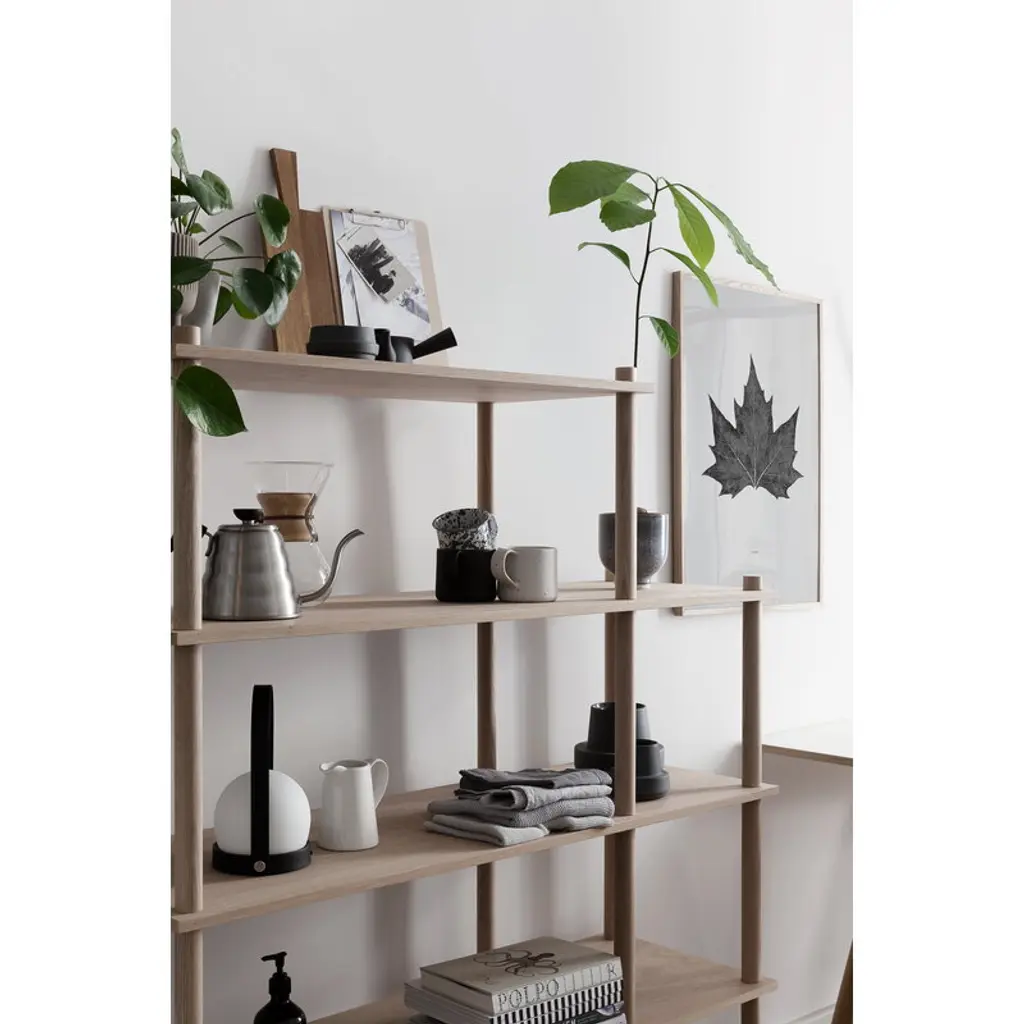 Woud’s Elevate shelving system is a collection of modular shelves that can be fitted into nearly any space. Designed by Camilla Akersveen and Christopher Konings, the minimalist shelving system consist of oak wood shelves and dowels for connecting them. You can use the Elevate shelving system for all types of storage solutions, from small side tables and low shelves to full-width bookcases – and, whenever necessary, modify or expand the system. This Elevate system consists of the following components: 1 x Shelf C4 x Shelf D6 x Top A22 x Connector B6 x Bottom D