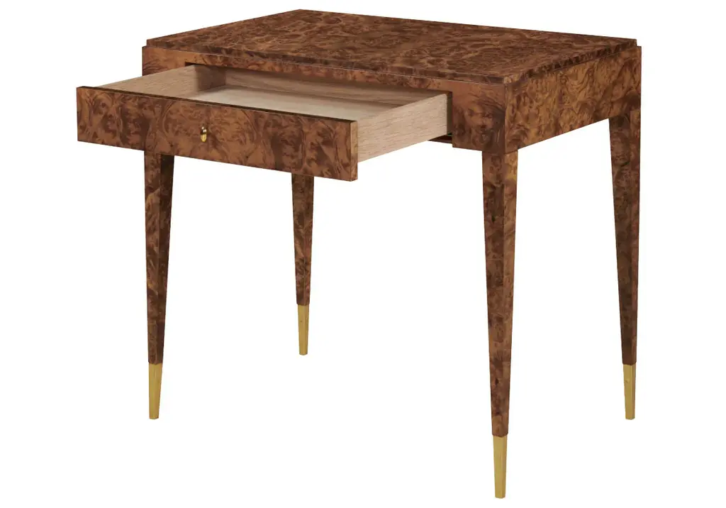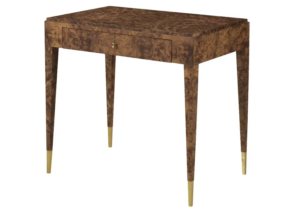 Inspired by French writing desks, this sleek, handsome table lends a classic yet modern look. Crafted from olive ash burl veneer and accentuated by brass ferrules, it effortlessly styles into living rooms and offices.