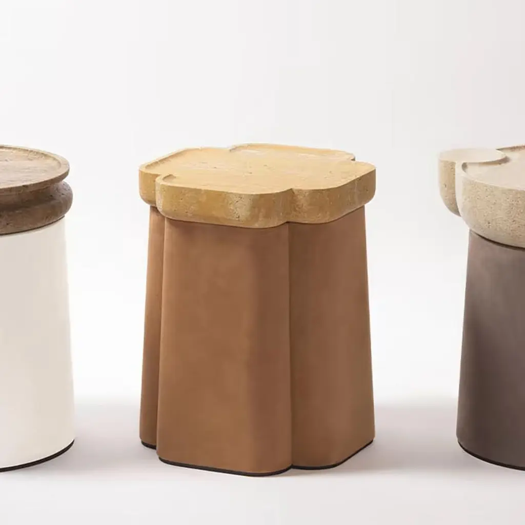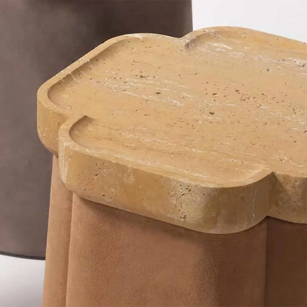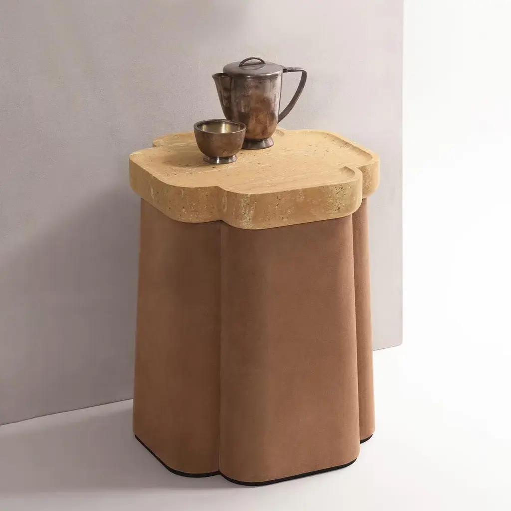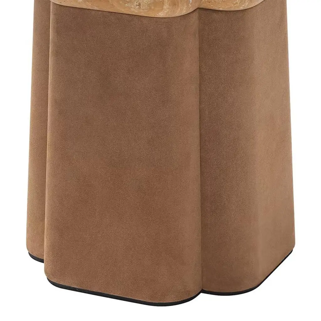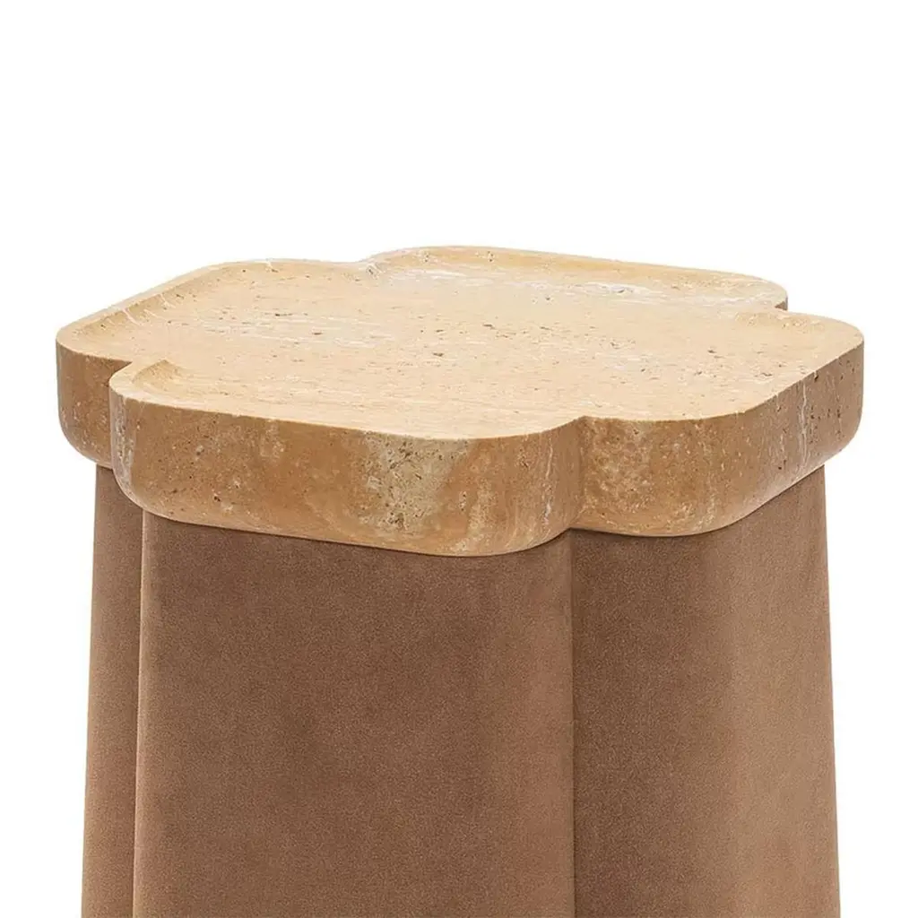 Side Table Elka with wooden structure covered with browngenuine suede leather. With carved polished travertine top.Also available with other leather or suede leather colors, on request.