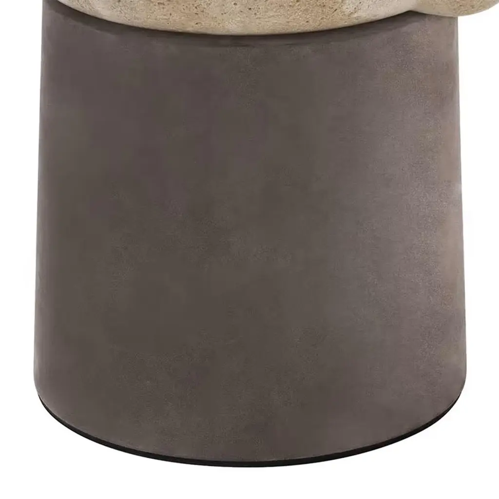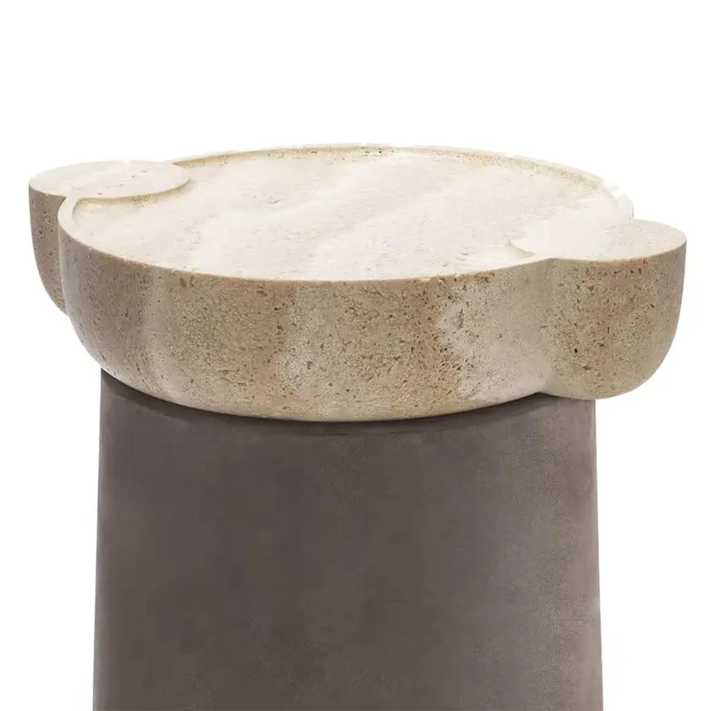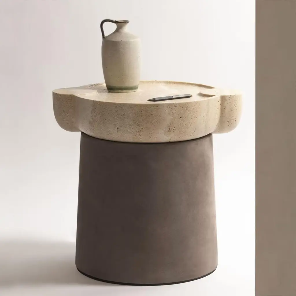 Side Table Elko with wooden structure covered with dark greygenuine suede leather. With carved polished travertine top.Also available with other leather or suede leather colors, on request.