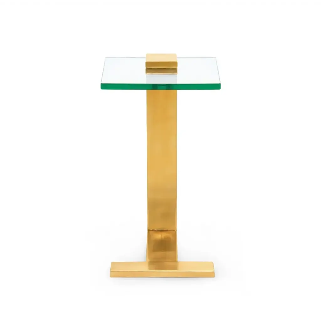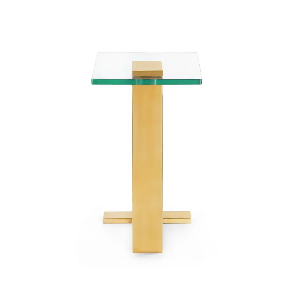 As sleek and compact as it is, the Elle Side Table overflows with Art Deco style. Add visual interest to your at-home ambiance with its retro-cool structural design, which can fit like a puzzle piece at the side of a sofa or lounge chair, or pose boldly on its own. Our artisans have taken traditionally industrial materials—glass and steel—and turned them into a chic and swanky statement-maker. The shining brass finish of the Elle’s architectural form offers a sense of polished glamour, while its minimalist glass tabletop floats above, forming a 90-degree angle and imbuing the piece with a refreshing lightness.