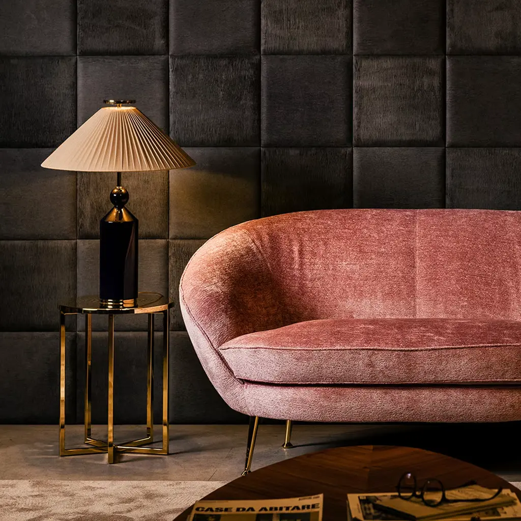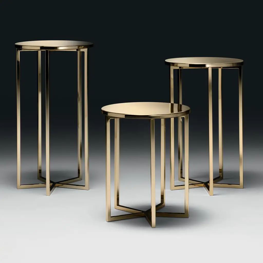 This round metal coffee table has a striking gold finish. The round shape of the top and the converging straight elements that support it create an elegant harmony.