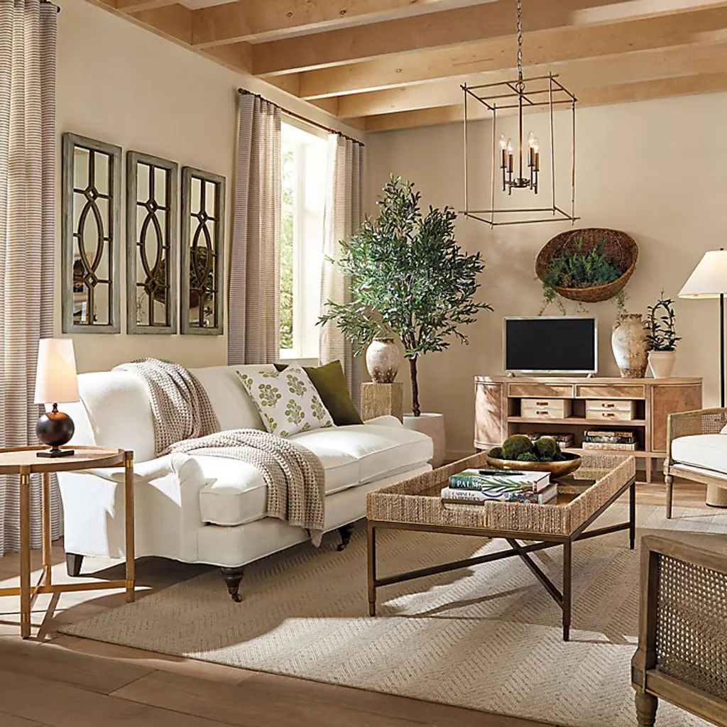 Our Elliot Side Table is a handsome blend of rich materials, tones, and textures. The round top and legs are crafted of oak wood and finished in a medium oak stain to bring out the wood's natural character and grain. A shallow lip framing the top adds extra depth. Legs are collared at the top and bottom with double antique brass "X" stretches for strength and architectural dimension. Elliot Side Table features: