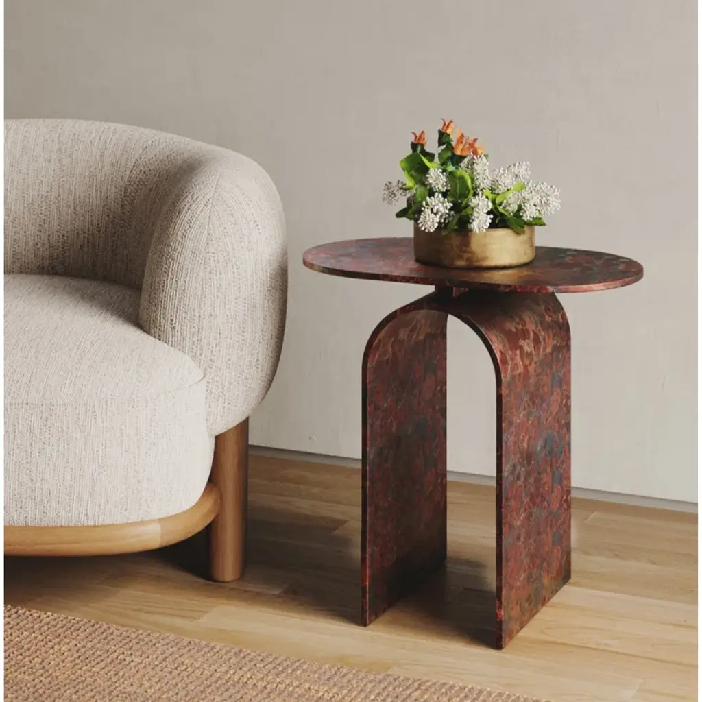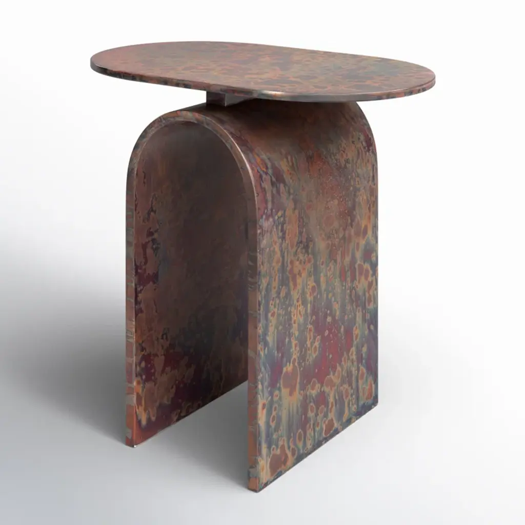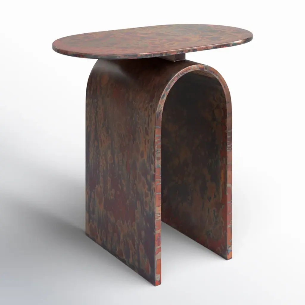 Our Vault side table features a dramatic, arched aluminum base construction. Finished in a reactive metal finish, each piece is a unique addition to your living space.