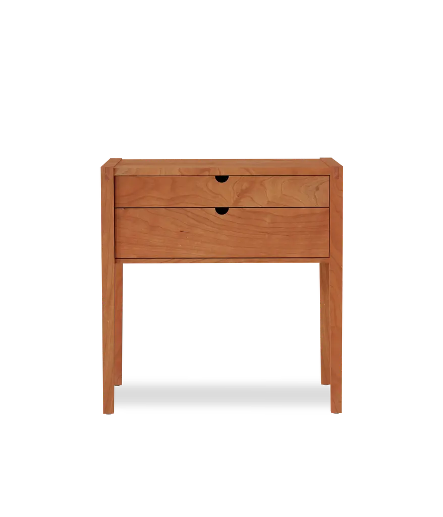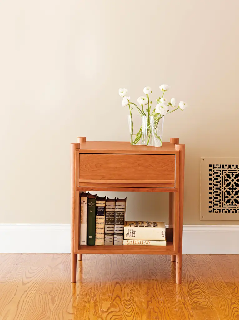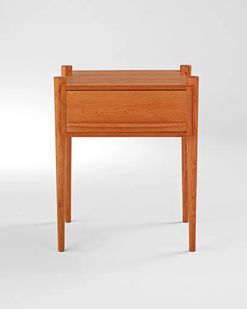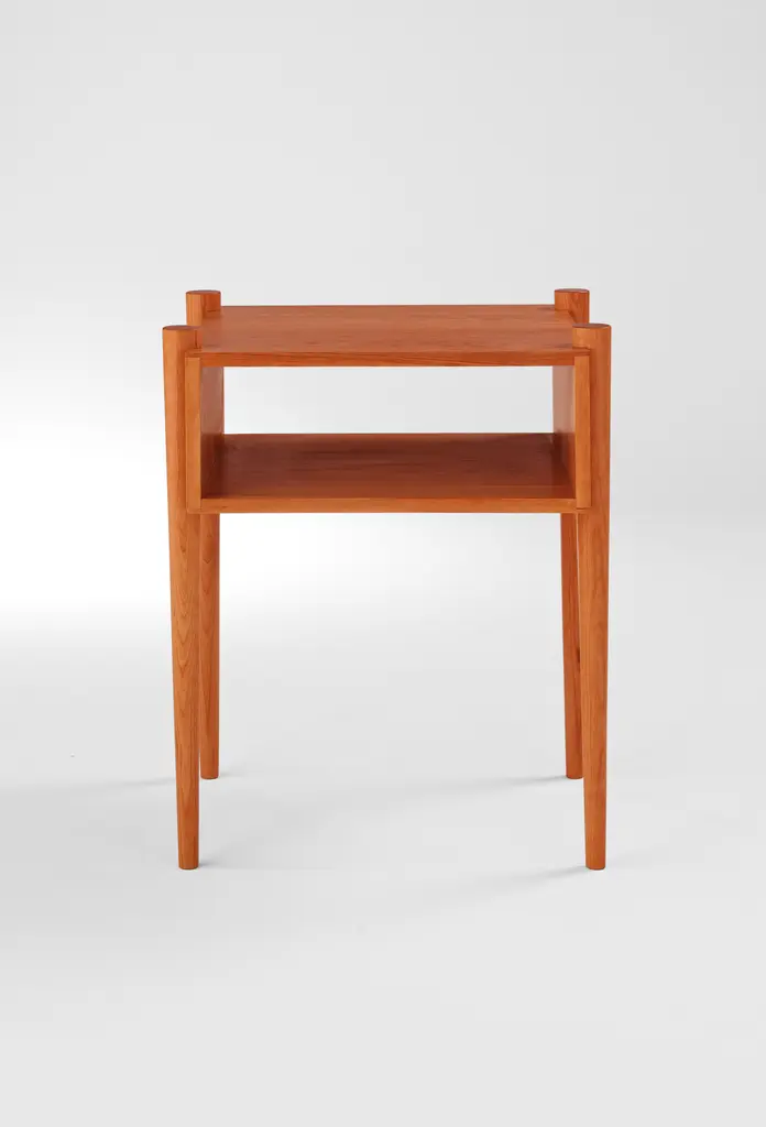 Crafted with tapered, turned legs, the Ellipse Side Table makes prudent use of cherry and walnut, favoring the beauty of simplicity over ornamentation. The legs, secured by mortise-and-tenon joints to the open cabinet, extend beyond its top to accent its unique design. The effect is powerful, echoing Shaker principles to create a utilitarian piece that augments an accompanying chair or sofa.