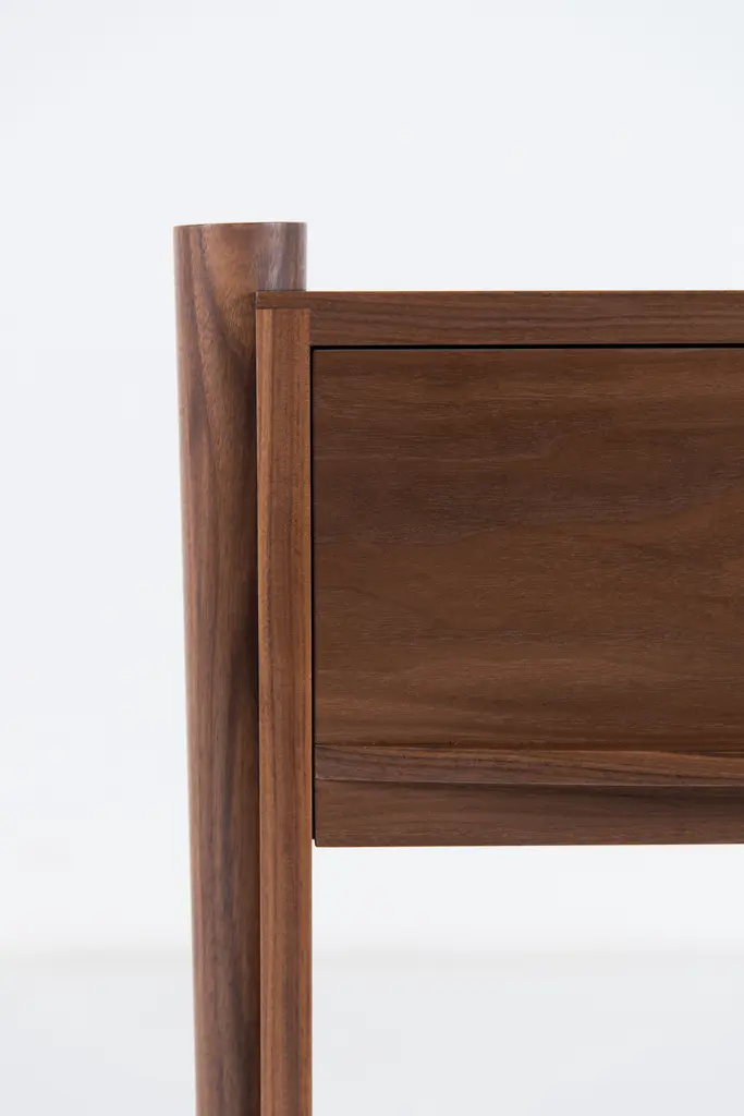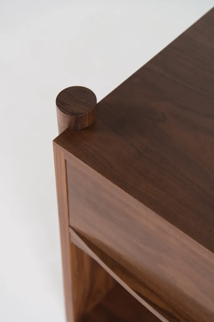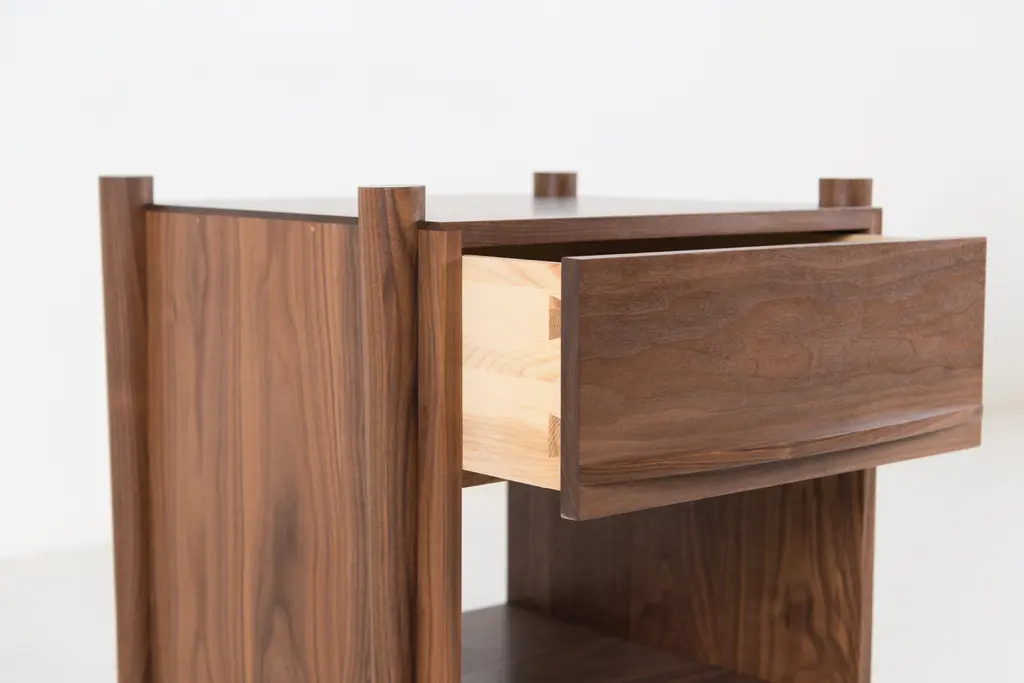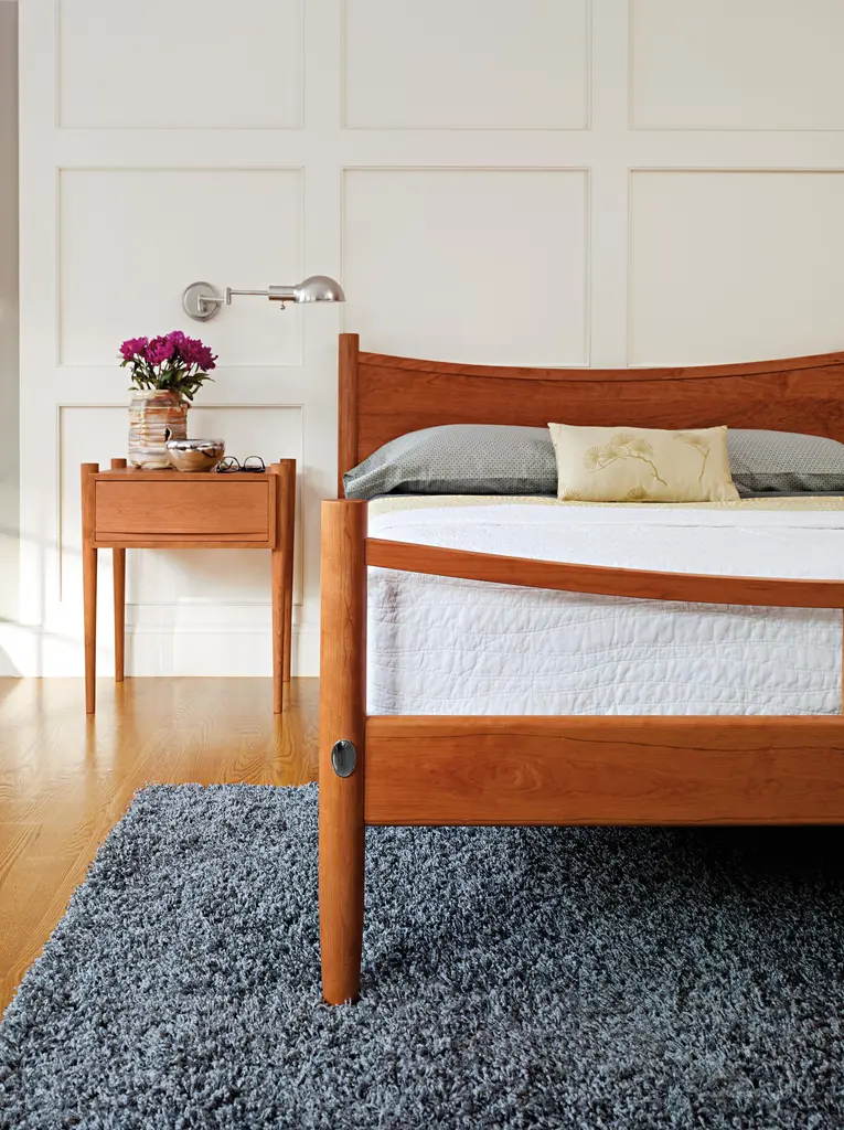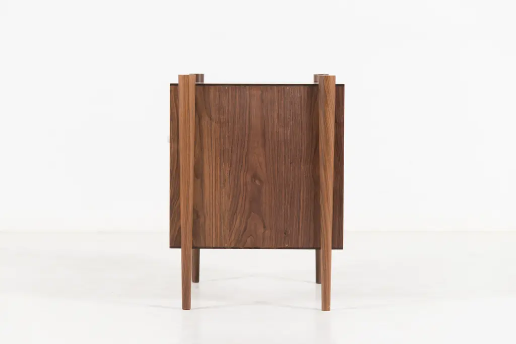 Crafted with tapered, turned legs, the Ellipse Side Table makes prudent use of cherry and walnut, favoring the beauty of simplicity over ornamentation. The legs, secured by mortise-and-tenon joints to the open cabinet, extend beyond its top to accent its unique design. The effect is powerful, echoing Shaker principles to create a utilitarian piece that augments an accompanying chair or sofa.