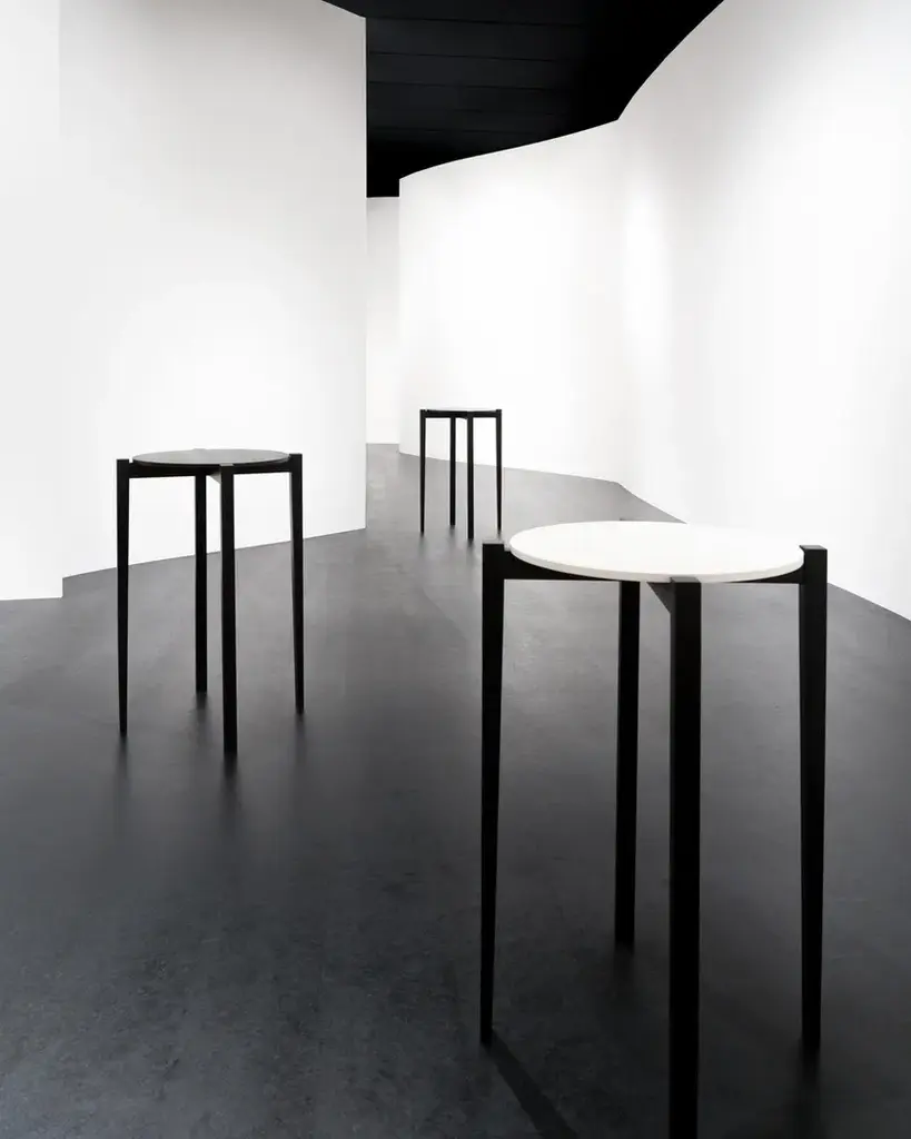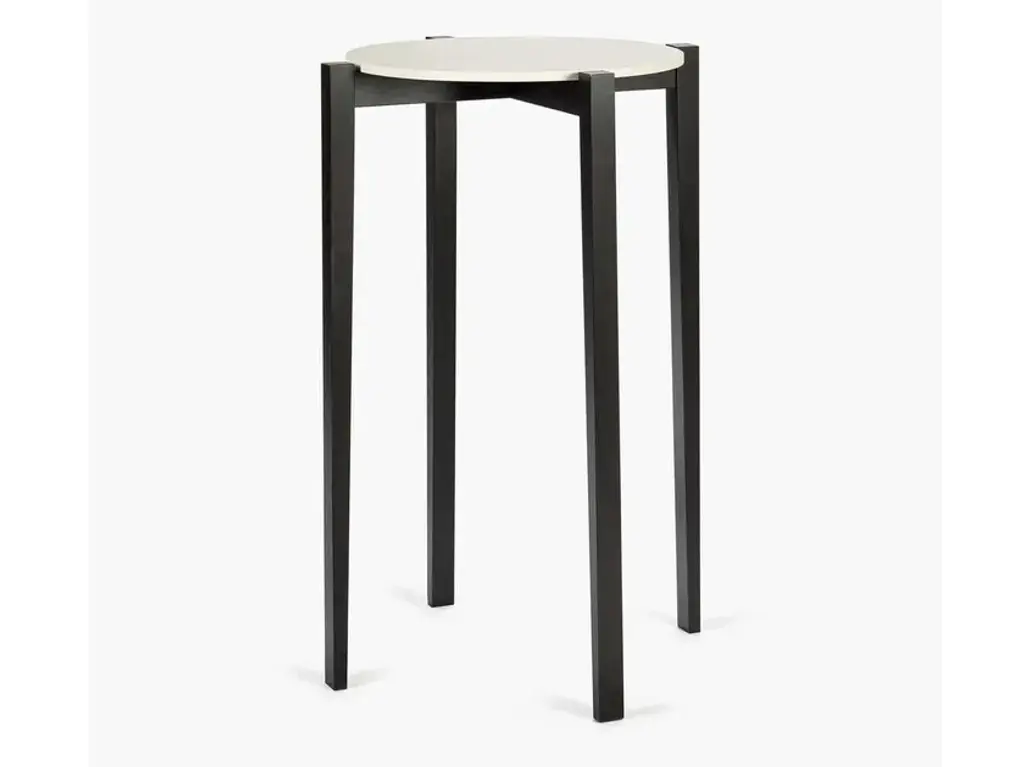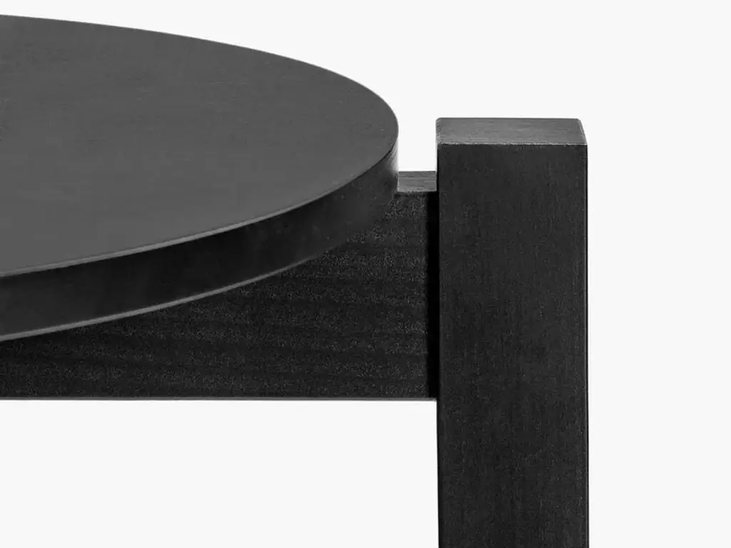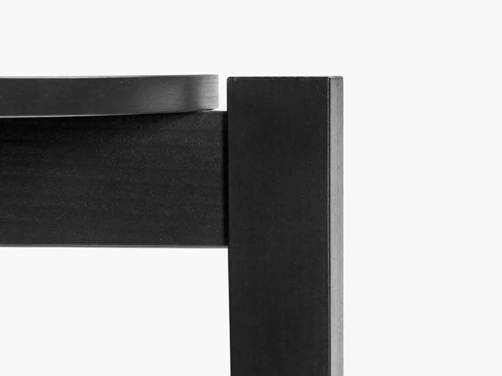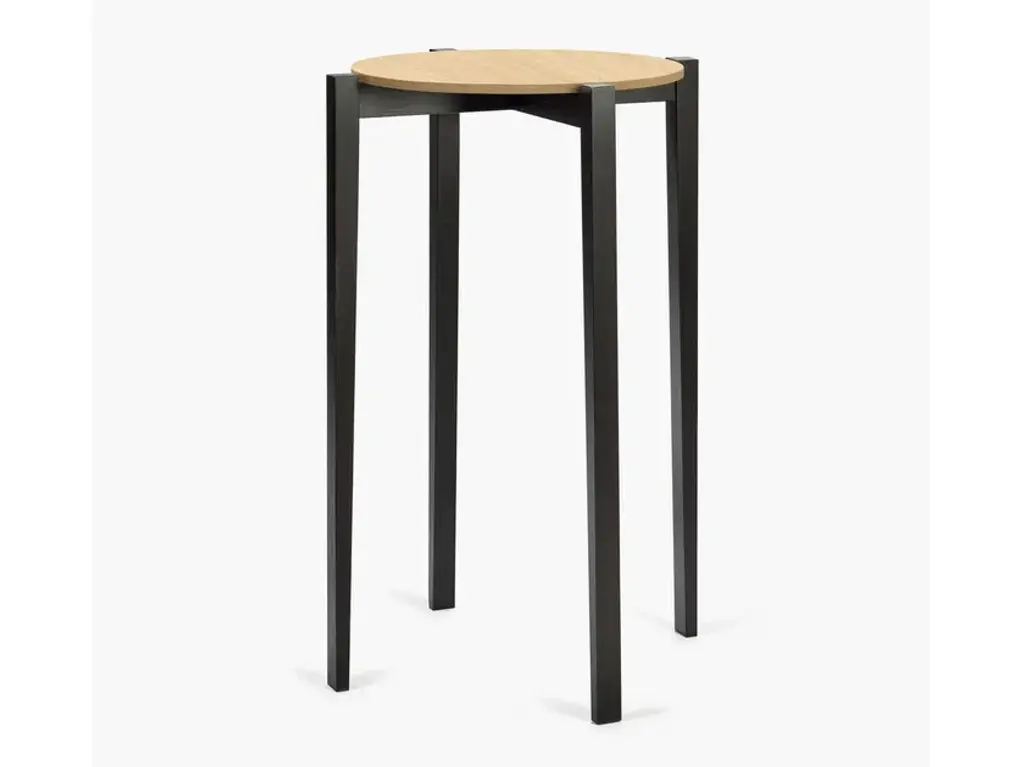 Éloïs is a high wood high table.The stackable Éloïs tables and stool provide a sophisticated, deft solution to various practical needs. Four tapered legs sit outside the top, foregrounding the elegantly skeletal architecture of the design. A cross-braced structure connects the legs and supports a square, rectangular or round top surface. The Éloïs Stool and Éloïs Round Table echo each other’s proportions at drastically different scales. The table offers an ample 122-centimetre-diameter surface, while the stackable stool is a discreet 44 centimetres across.It is the first time that Ann Demeulemeester and her life partner, Patrick Robyn, have designed a complete line of furniture. They have made one-off pieces, such as the Table Blanche for Bulo. As always, the starting point came from an own need or personal interest. “I make something because I’m missing it, I want it, and I can’t find it”, says Demeulemeester. The realisation developed into them wanting to translate these furniture pieces, designed for their own use, into accessible, timeless pieces that people would also want to integrate and cherish at home. Their furniture remains true to the couple’s distinctive aesthetic style. As with all their previous work, a light-hearted game between shadow and light is clearly visible, as well as a kind of refined decadence requiring an involved, intelligent owner. They don’t want to prescribe the use of these pieces but rather make suggestions for their use. At its heart, Demeulemeester’s work has always been an exploration and a celebration of contrasts - a beauty found in the interplay between strength and fragility, structure and nonchalance, the poetic and the radical, aesthetics and functionality. This is also the soul of the furniture collection and is further reflected in a dialogue between proportions and geometry. Linen, oak, wool, velvet, canvas - these materials form the heart of the collection and make you want to touch, caress and feel them. By experimenting with yarns, fibres and pigments, the designers have created a unique palette of textures and colours exclusively for the collection. There is the anticipated deep black and off-white, and also moss green, soft pale pink, a chic cream and warm roasted orange. All furniture is made of wood veneer or solid wood, FSC certified, and finished with either a lacquer or a water-based stain, which protects against dirt and allows you to clean the wood with a slightly damp cloth. The lacquers and stains are always sprayed (not applied with a brush). Customers should always be aware that wood is a natural material that can show imperfections and still undergo changes over time (shrinkage/expansion, change of colour under the influence of light). For the upholstered furniture, the fabrics are woven in Belgium and exclusively designed and confectioned for this collection.
