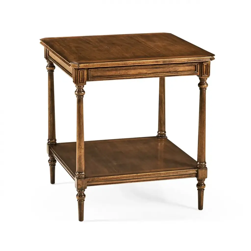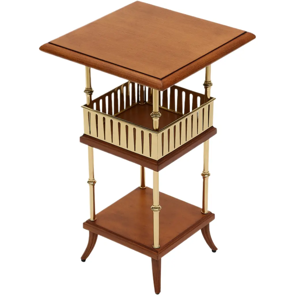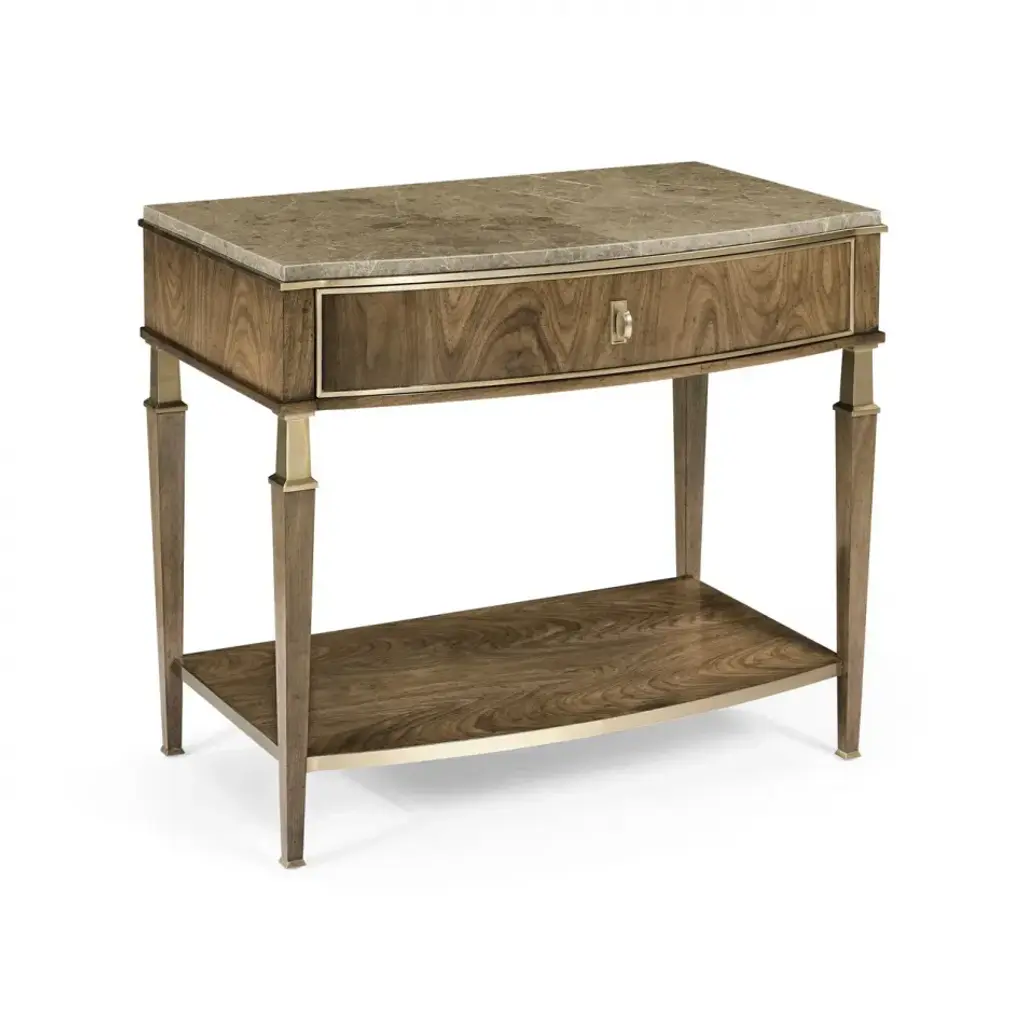 Sleek pops of brass lend this hardwood side table warmth and refinement, offset by expressive walnut veneers and a warm mink stain.