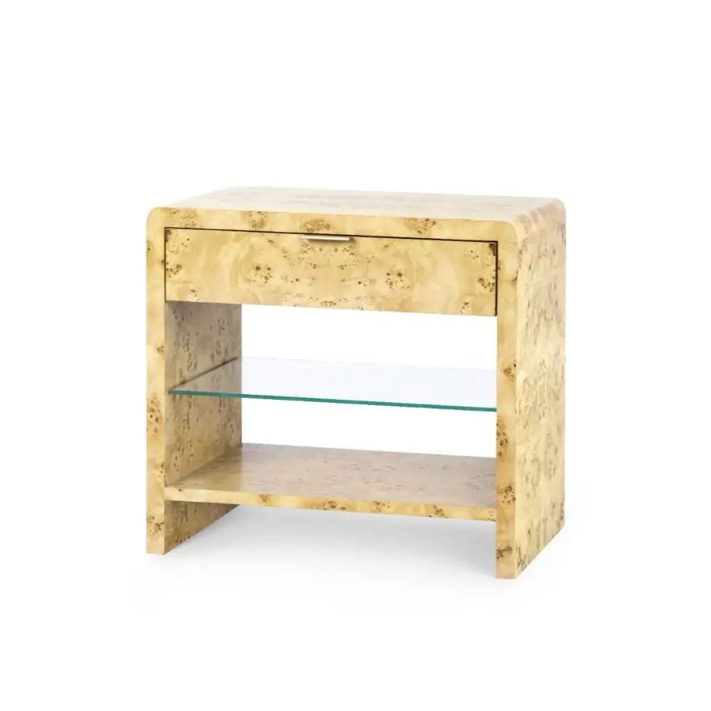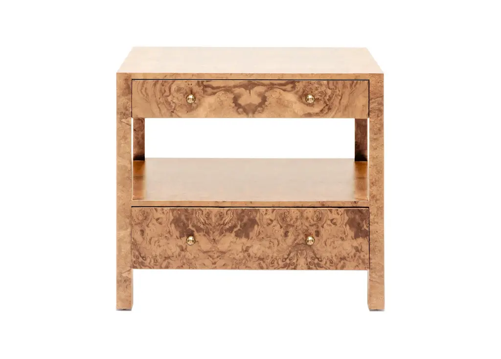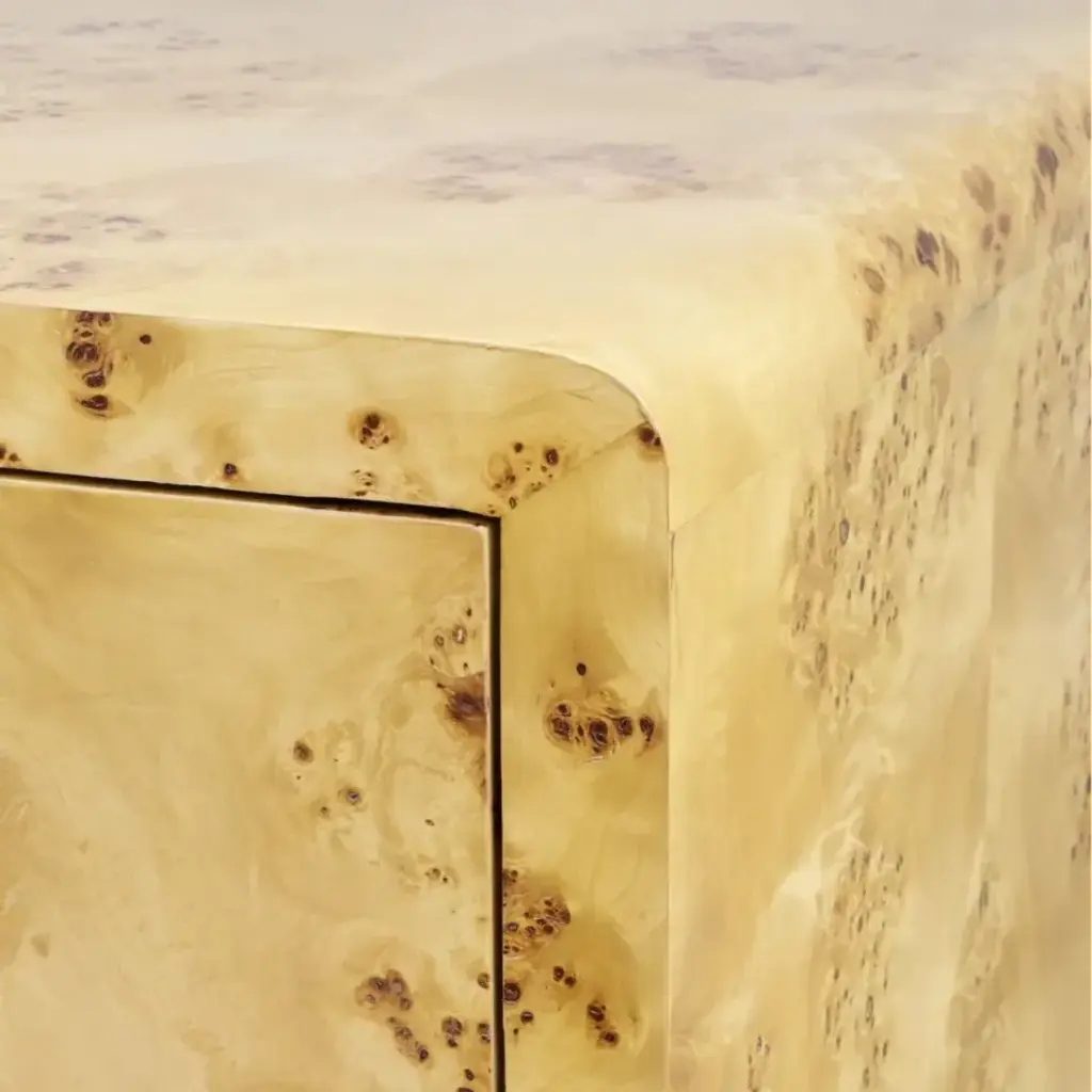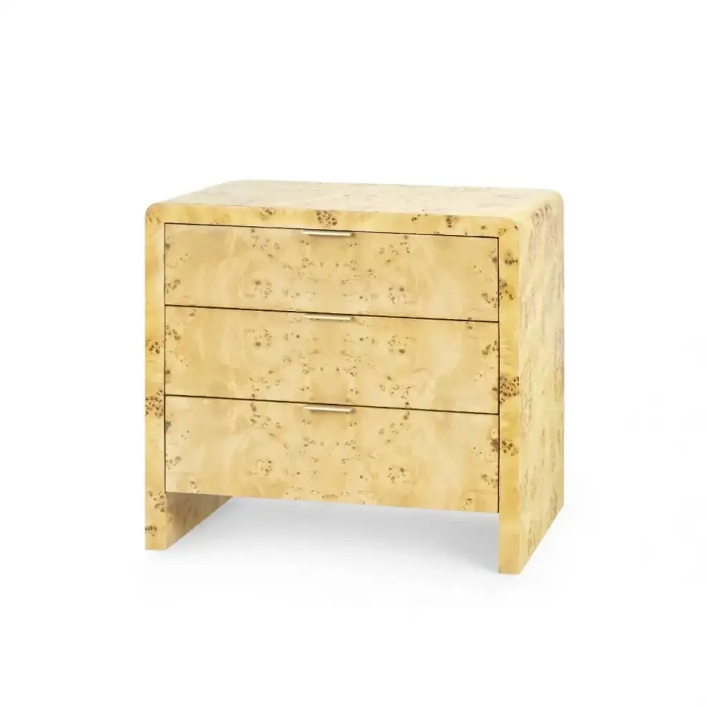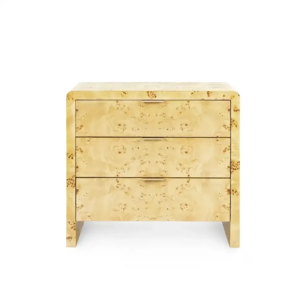 We love our Emil Collection for its embrace of retro silhouettes and cosmopolitan style. The naturally vibrant patterns found in burl wood have a distinctively 1970s feel—all kaleidoscopic swirls with a bold sense of cool. Our Emil 3-Drawer is a masterful reinterpretation of the beloved vintage waterfall table style. Its seamless, curved design effortlessly channels the spirit of the era. The silhouette gracefully accommodates three spacious drawers adorned with brushed brass edge pulls, striking the perfect balance between vintage aesthetic and optimal storage functionality. Whether gracing the bedside as captivating nightstands or commanding attention as an exquisite accent table in a living room or office, the Emil 3-Drawer is a statement of refined sophistication, an embodiment of enduring style.