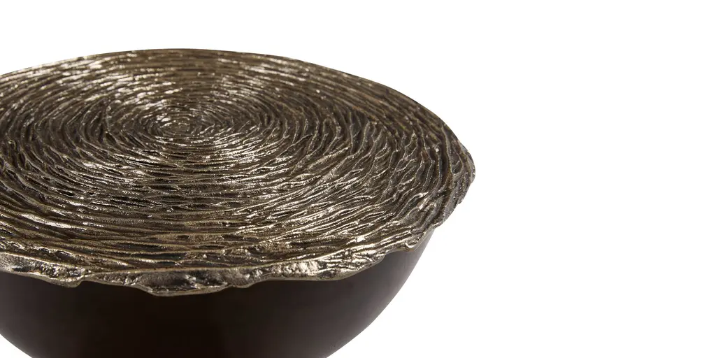 With textured brass rings encircling its mango wood base, the Emiline Side Table will be the jewelry-wearing accessory in your living room decor. The dark walnut finish is the perfect counterpoint to the spiral-patterned aluminum top, textured and finished in antique gold. Choose the mixed material design of the Emiline table in large or small, depending on your space, or pair them for double the impact in your modern eclectic aesthetic.