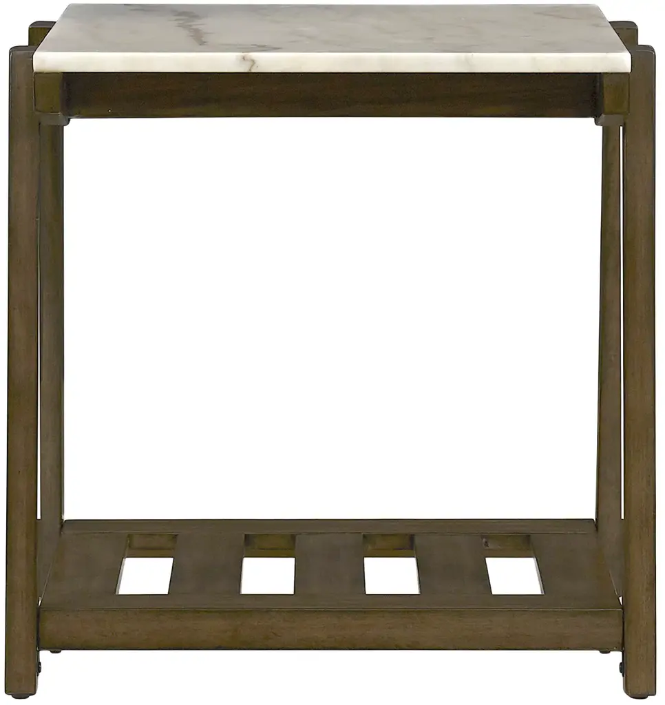 Add versatile style to your space with our Emory end table. This piece boasts a cream-colored marble tabletop that overhangs on canted legs in a weathered sand finish for visual intrigue.