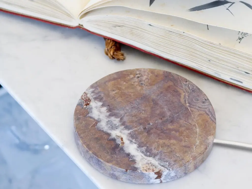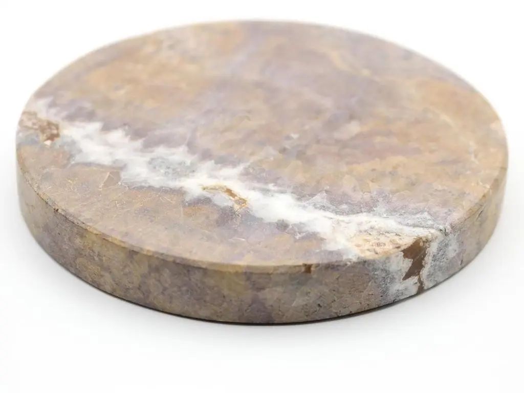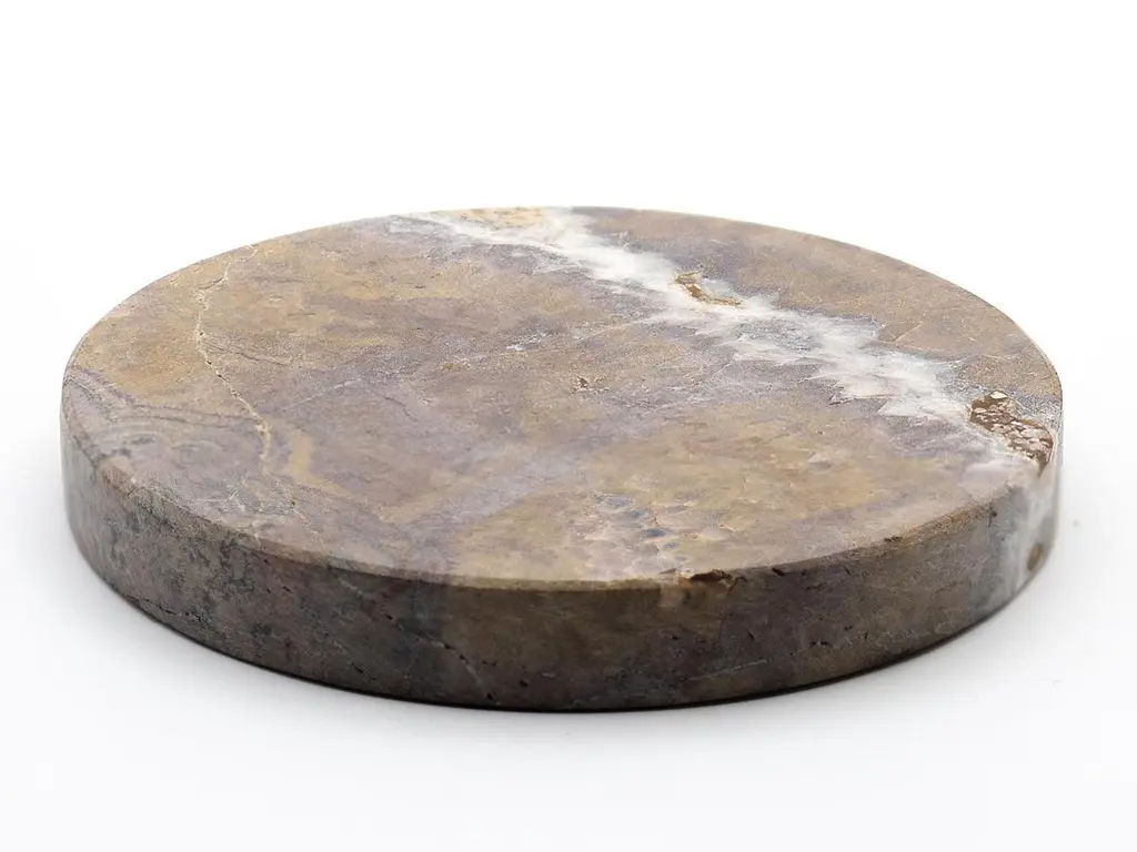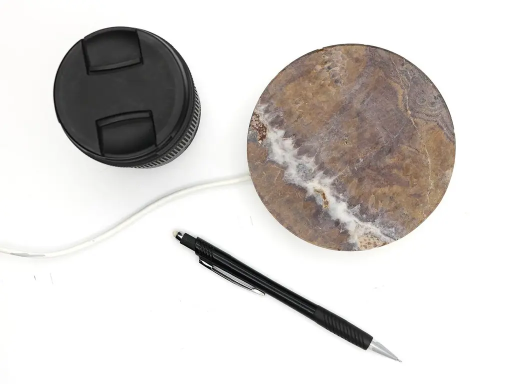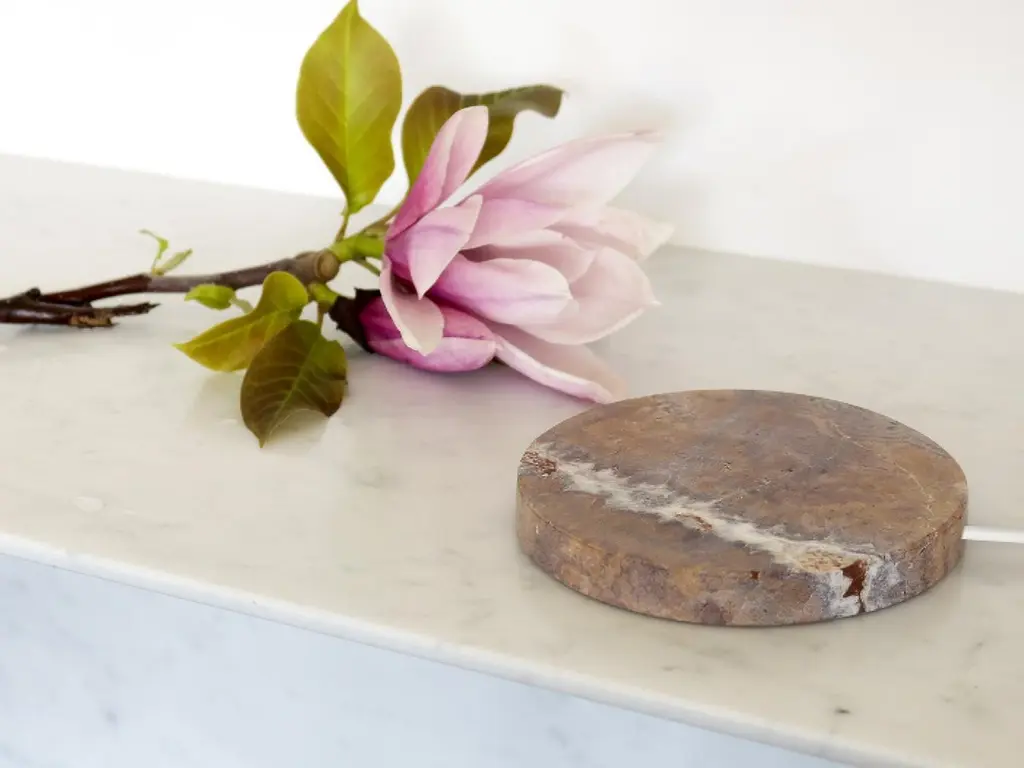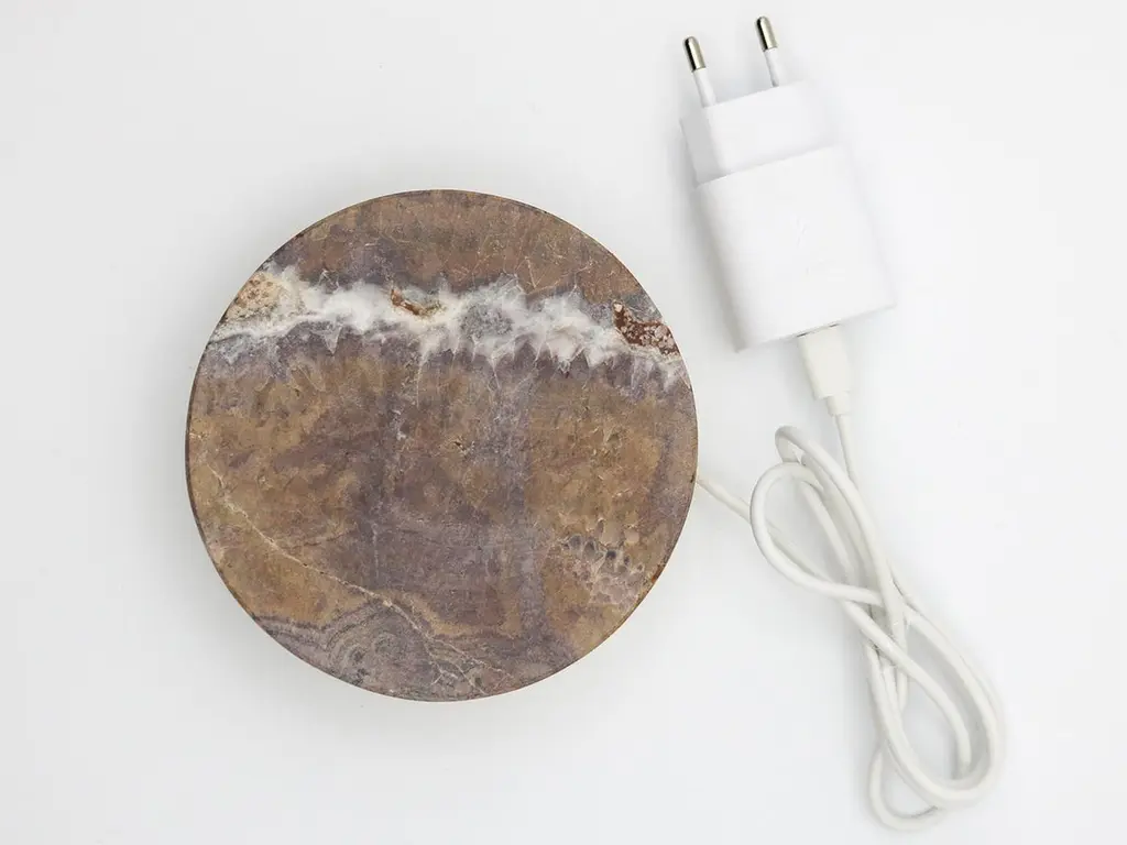 A marble base,that quickly charges your phone, with a touch of magic. A circle, a stone, realized with the care that marble requires.A powerful wireless charging technology ensures an efficient and reliable power delivery.The result is a magical object, with a natural feeling,a piece of art that wonderfully fits on any table or bedside table,or everywhere you imagine.It refers to the most famous variety of brown marble, characterized by a crystalline brown background embellished with a dense network of beige, hazelnut, gray, and light brown veins.Designed and manufactured in Italy, 100% Italian marble, 0% plastics.- 15w power supply included in the box.- Measures: Integrated cable: 90cm (3ft)- Base diameter Ø 12cm (4.72in) Compatible with all Qi-enabled devices.