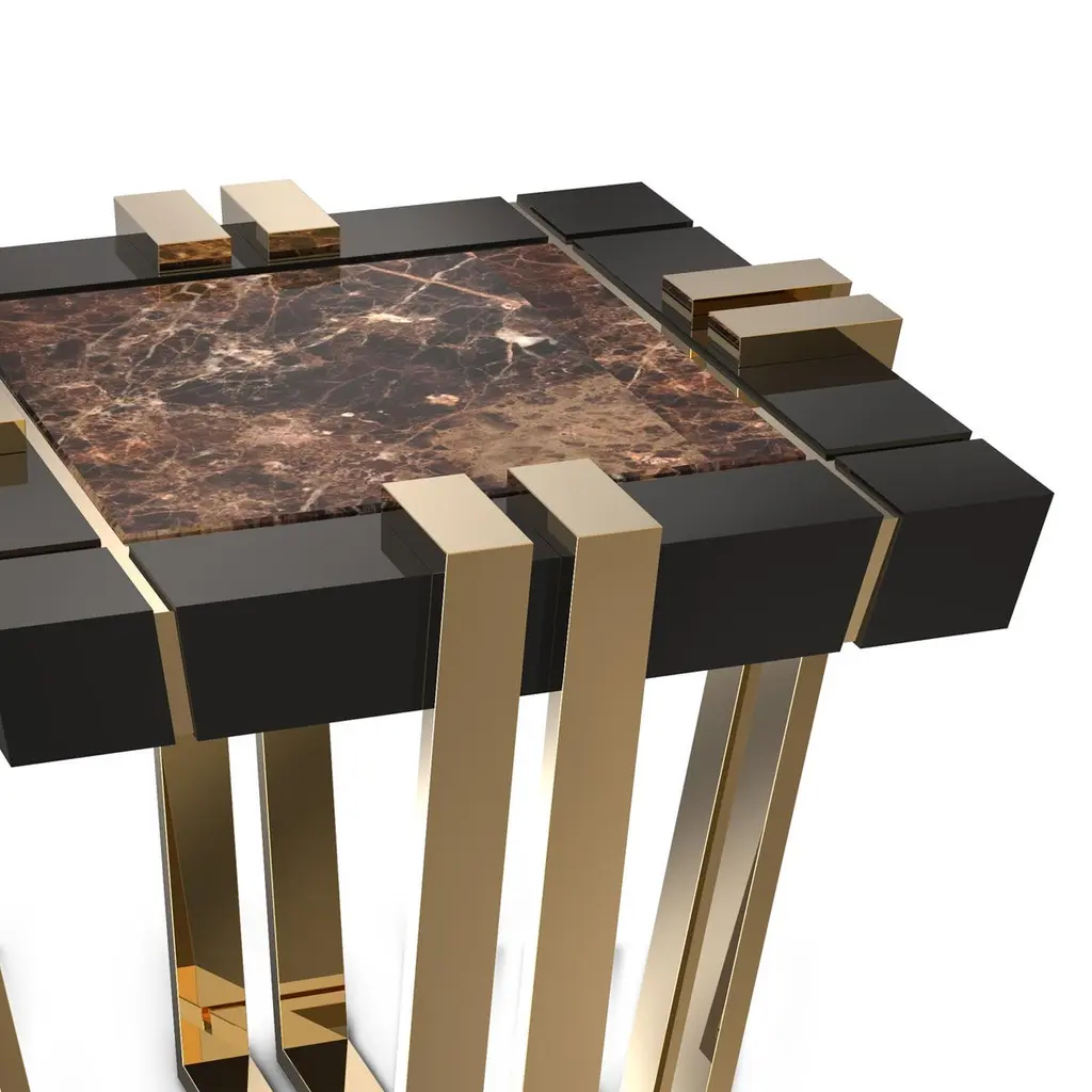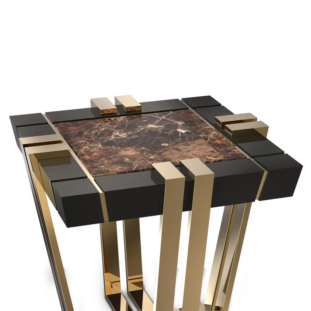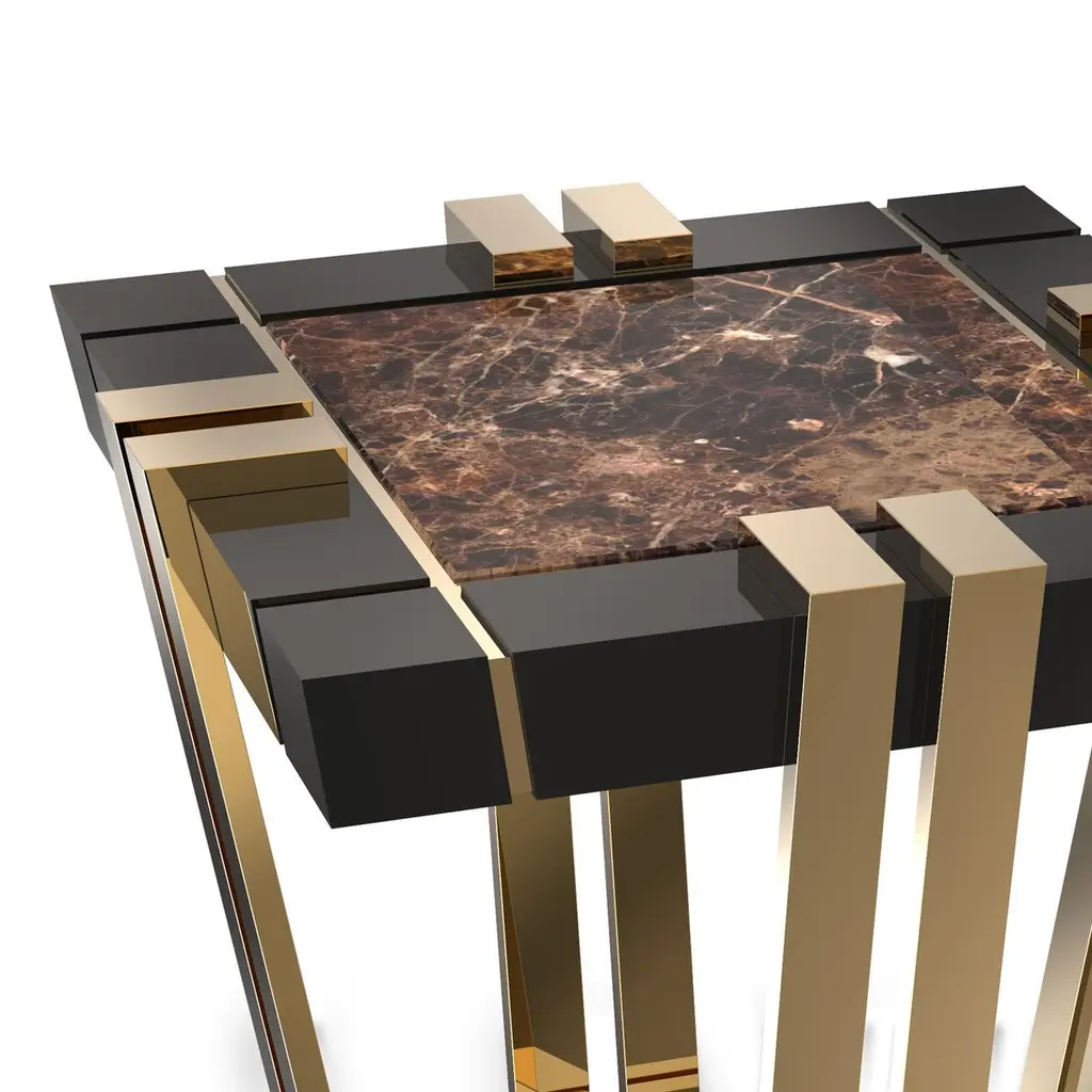 Side Table Emperador with brown marble top withblack lacquered wood frame. With polished brassbase and polished brass subtle line details.