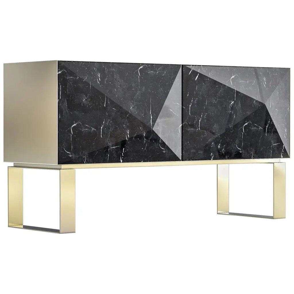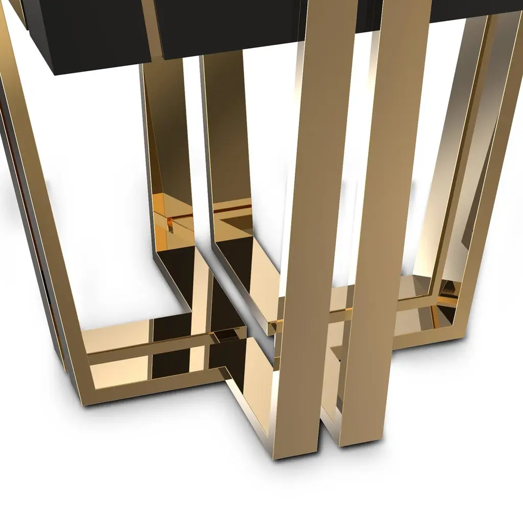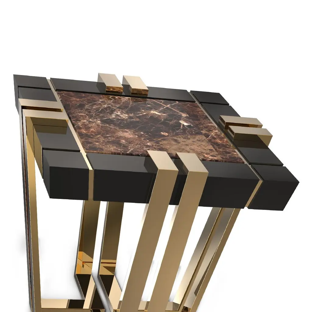 Side Table Emperador with brown marble top withblack lacquered wood frame. With polished brassbase and polished brass subtle line details.