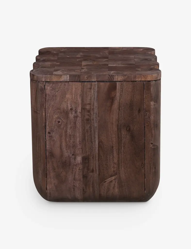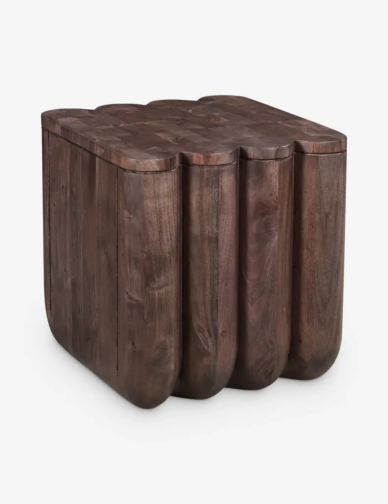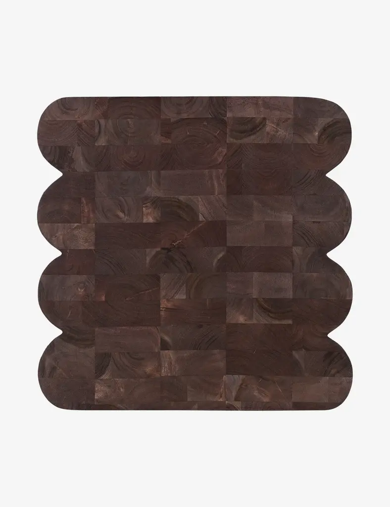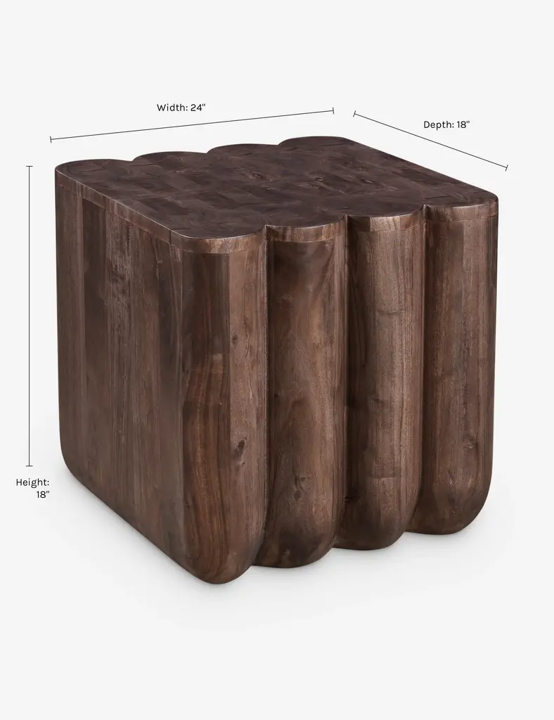 The Emsy side table is a soft statement in acacia. Scalloped edges fashion a dynamic silhouette contrasted by a clean plane on the other sides for a beautiful balance of form. With its joinery details and the wood grain's dramatic depth under a rich espresso finish, this small end table is set for outsized impact in your design.