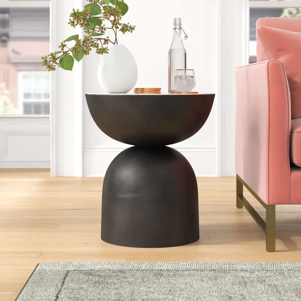 A sculptural play on shape. The aluminum base supports a round tabletop with natural veining.