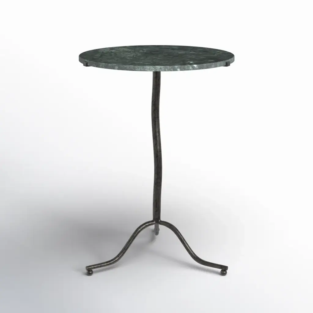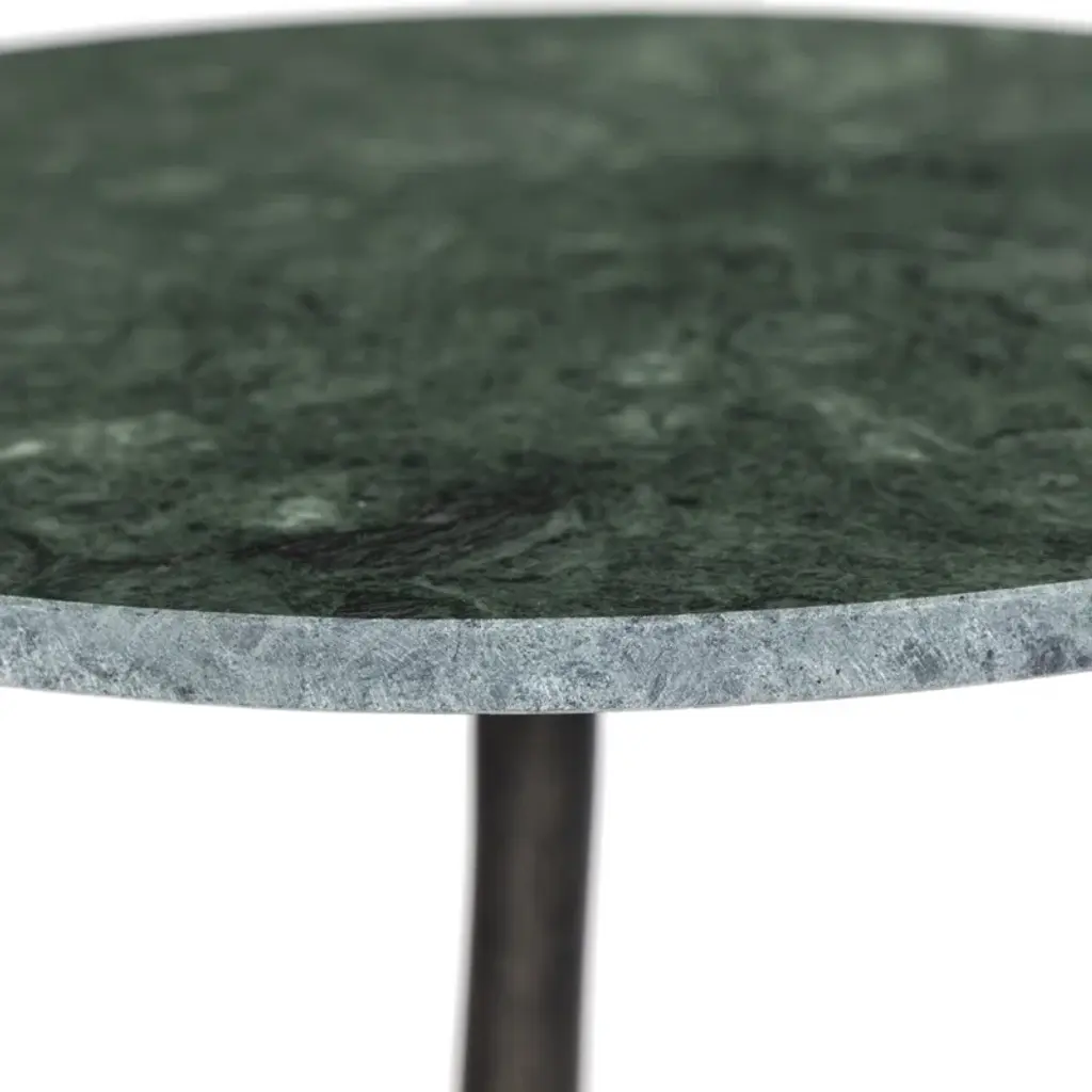 Elevated elegance. Our round end table features a smooth marble top with captivating veining, resting on an iron pedestal base with an antiqued rust finish. The contrast between the materials creates a striking balance that adds a touch of sophistication to any space. This versatile piece is perfect for displaying your favorite lamp, plant, or decorative accents.
