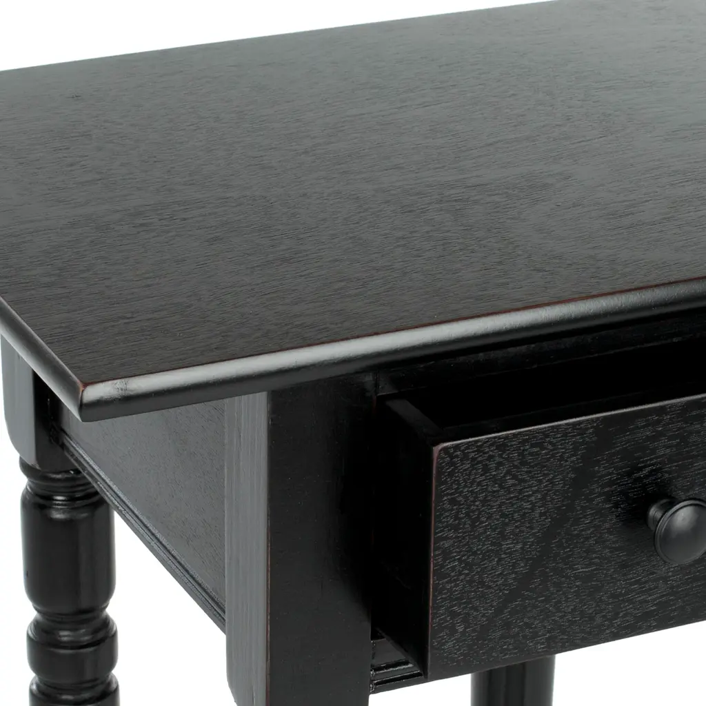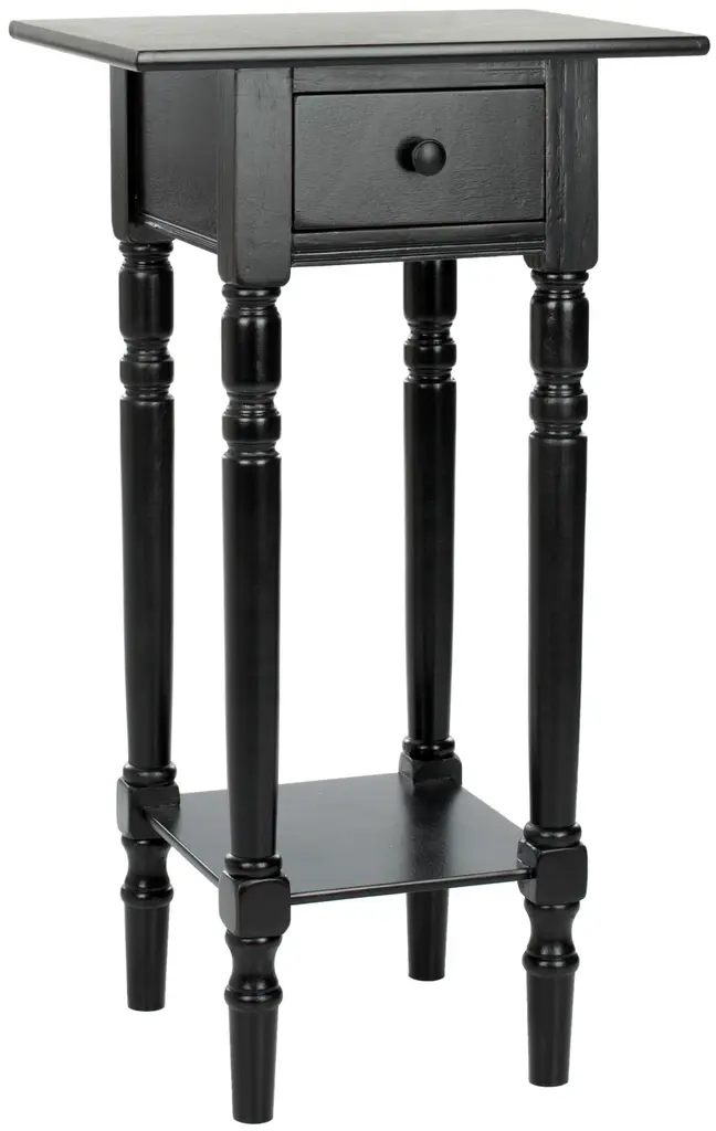 The dainty end table with it's long shapely legs marries a easy farmhouse allure with just-right bedside manners. Large enough to hold essentials, like glasses, reading lamp and books,, in pine with distressed black finish, doesn't need much space to shine. Wood is a natural material with variations of color shade, configuration, streaks, and grain structure. Each individual piece of furniture has characteristic markings that will differ from photo and showroom Samples. Regular attention and maintenance of fine furniture can ensure it's beauty for years to come. Always use felt pads under all articles to prevent discoloration or softening of the lacquer. Plastic and rubber bases on items can discolor wood. Some assembly required.