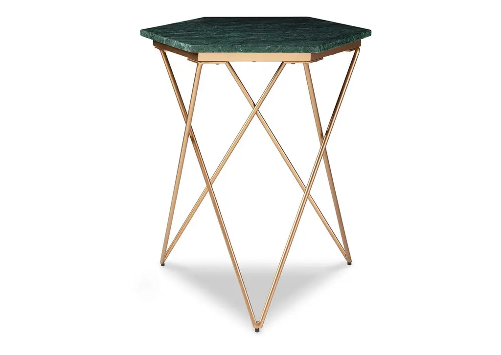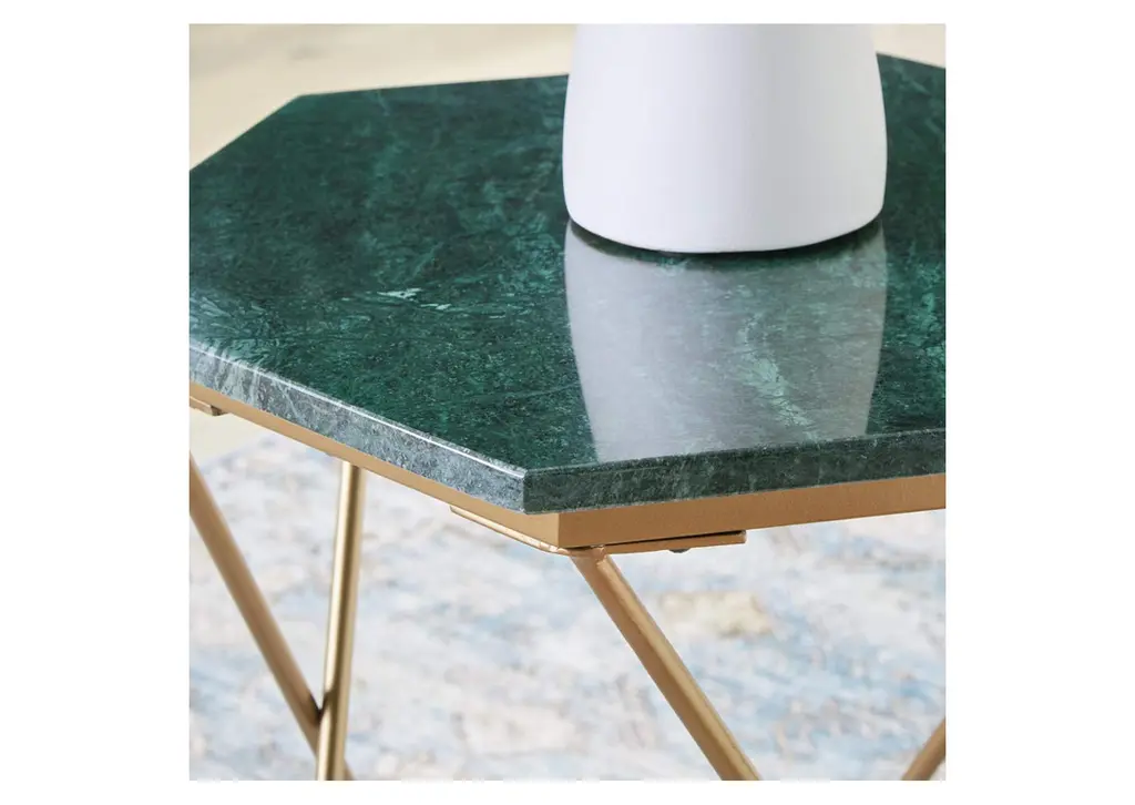 The Engelton accent table redefines classic glamour for the modern age. It draws from art deco influences with its geometric goldtone base, while the green marble top will be the envy of every guest. There’s no place quite like home, and this table crafts a contemporary space you’ll always want to come back to. Weight 32.000 lbs. (14.4kgs.)