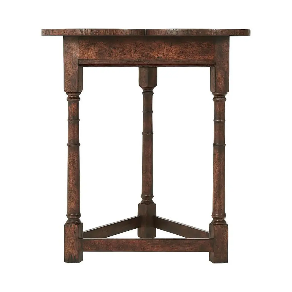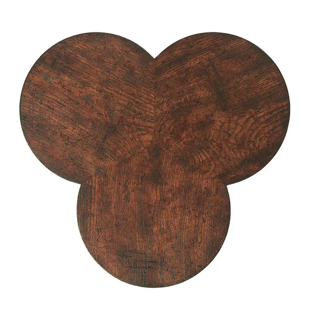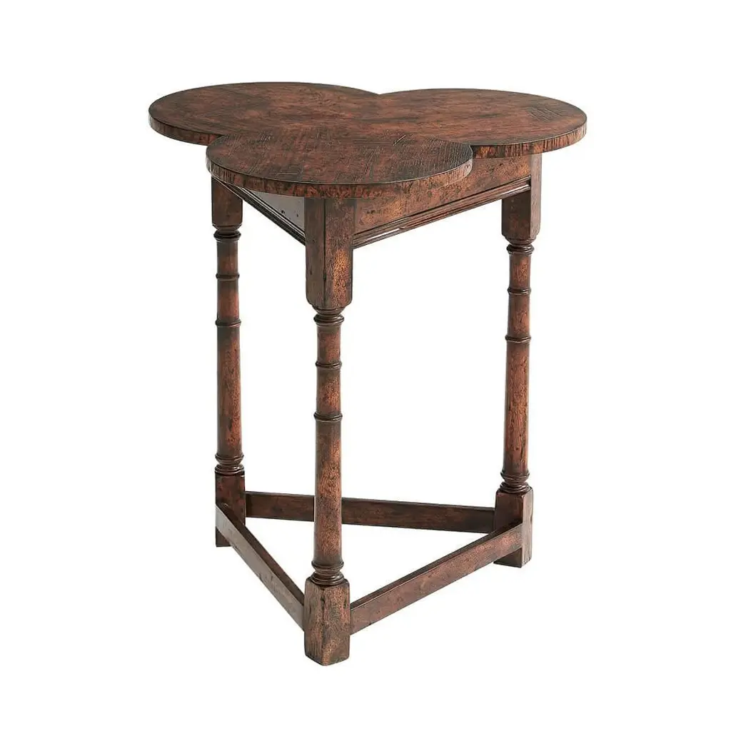 A mahogany and reclaimed oak 'Clover' table, the trefoil top above a triangular frieze and Cricket base, on three turned and block legs joined by board stretchers.Dimensions: 24.5" W x 23" D x 27" H.
