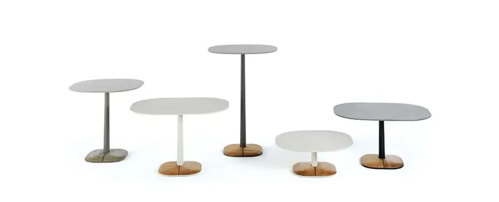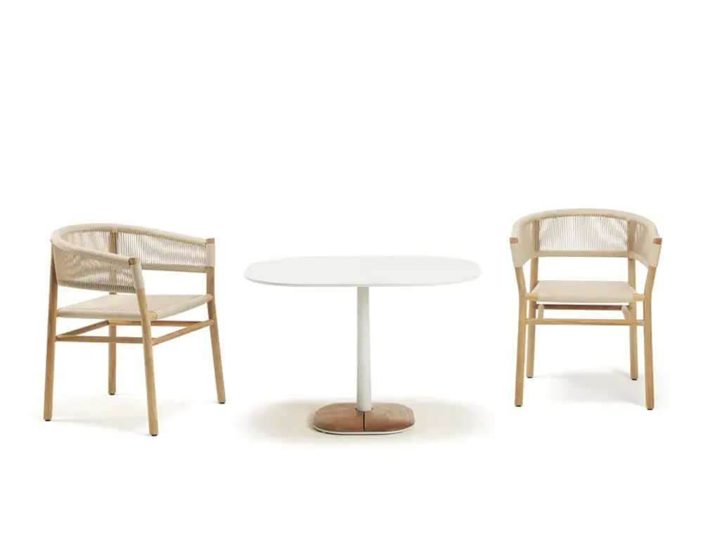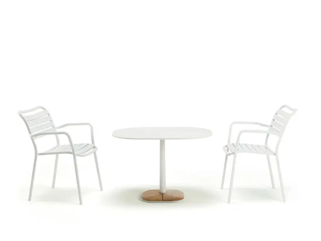 Coffee table in metal with top in ceramic stone. Table cover base in teak.Essential lines, a contemporary mood and a transforming soul define the new line of Ethimo outdoor tables. The Enjoy collection is designed to be combined with any lounge or dining chair, suitable for any specific need for private or contract use. Enjoy tables are available in five different heights and with three types of top, made of ceramic, which differ in size and color (white, black vulcano, grey), allowing the most varied and amazing customizations.The metal conical structure, which supports the top, rests on a base that can be declined in natural or pickled teak. In this way, Enjoy can change its 'outfit' to integrate itself in every outdoor context, according to different needs and styles.