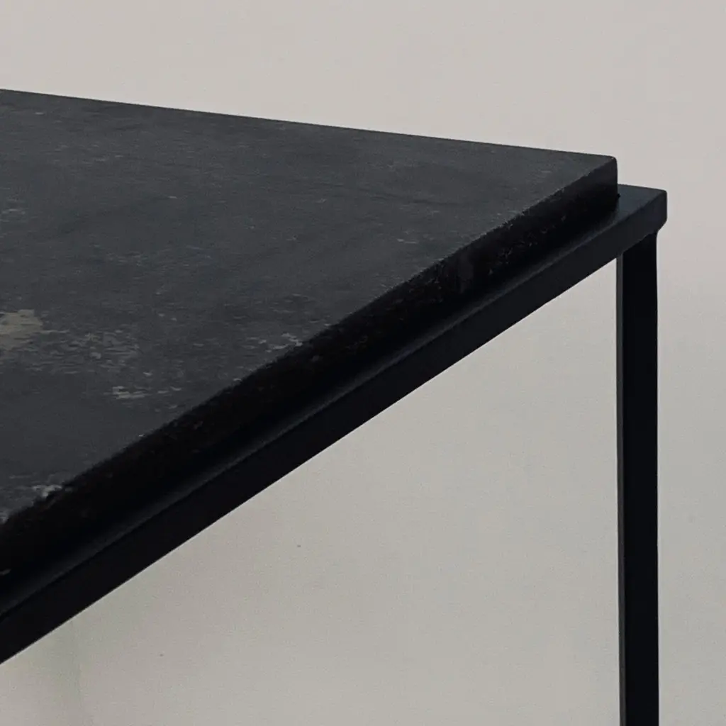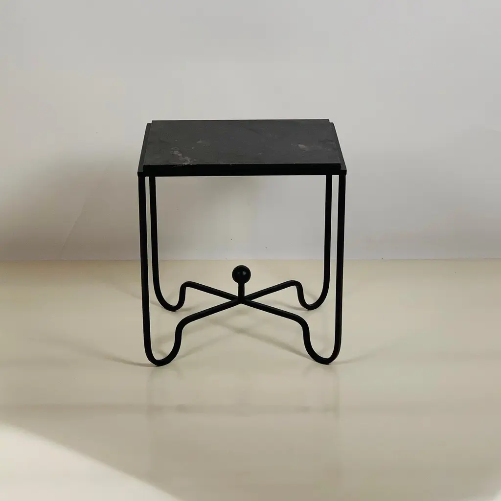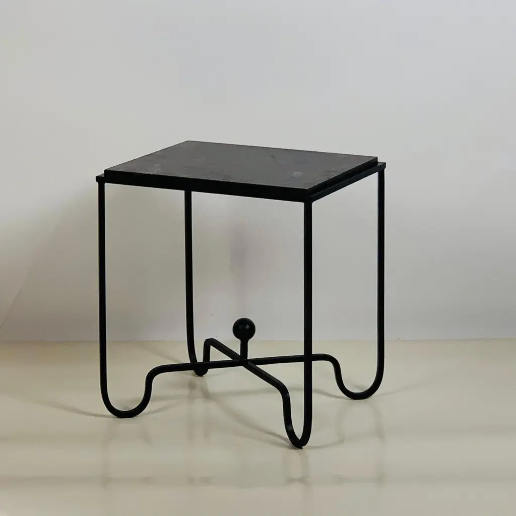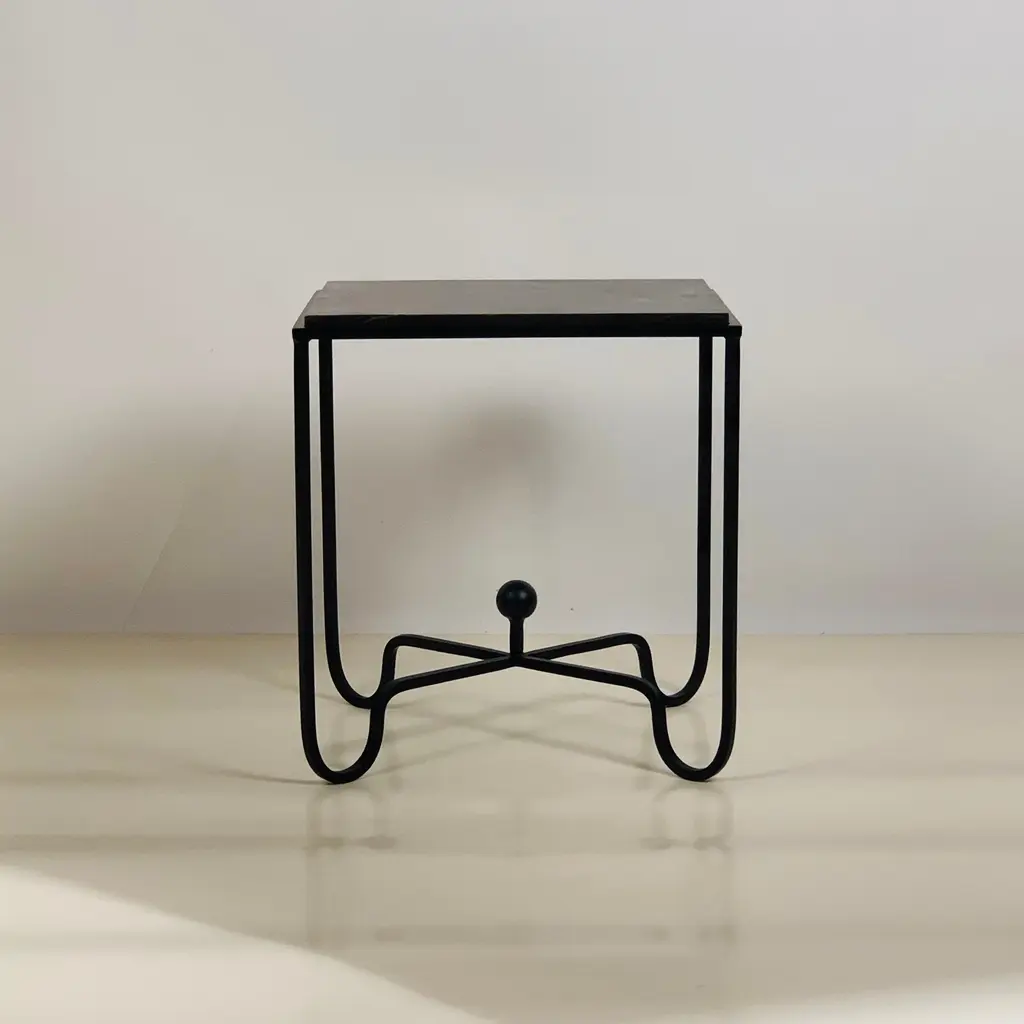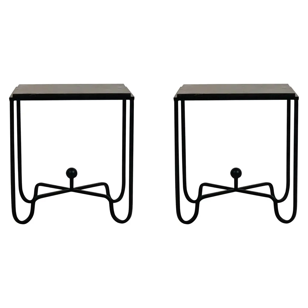 Sculptural blackened steel frames fitted with gorgeous black limestone tops. Very durable stone surface. Inspired by the timeless aesthetic of French modern design, these night stands / side tables / end tables from our exclusive Design Frères line are handmade in our Los Angeles atelier by our skilled artisans. These classic pieces will blend in, structure and enhance any space and last a lifetime.