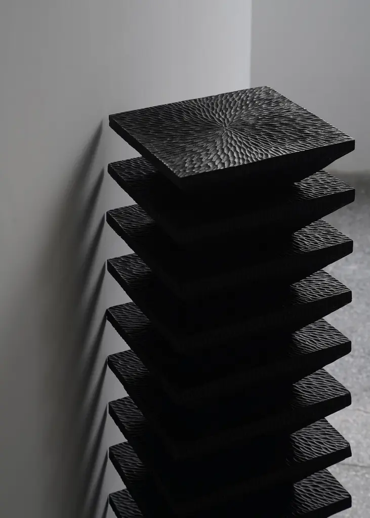 Epang 06 side table by Sing ChanDimensions: W 25 x D 25 x H 37.5 cmMaterials: Manual sculpture, teak, black paint, waxing.Sing Chan ( Chinese: 陈星宇/Xingyu Chen) , the founder of SINGCHAN DESIGN, was born in 1990, and graduated from the Department of Industrial Design in Guangzhou University in 2013. He served as the Design Director for Bentu Design in 2016.Founded his own design studio in 2020, Sing specializes in discovering new revelations from different civilizations and eras, reconstructing them through design methods, and shaping new objects that link the past and the present.Panyu, Guangzhou, China, where Sing grew up, is a small town with a rich history along the Pearl River. In the early years, thanks to the developed waterway transportation, the port of the town has a very close relationship with Hong Kong, the imported cultures, utensils, and values meet and fuse here.It was not until he had been in the design industry for more than ten years that he realized that his understanding of native culture was shallow. He is confused about this, and experience tells him that the truly valuable objects are not groundless and pieced together, but based on historical inspection and adaptation of the times. Sing hopes that his design can be like a story that is worth telling in a lyric way, affecting the present across time.