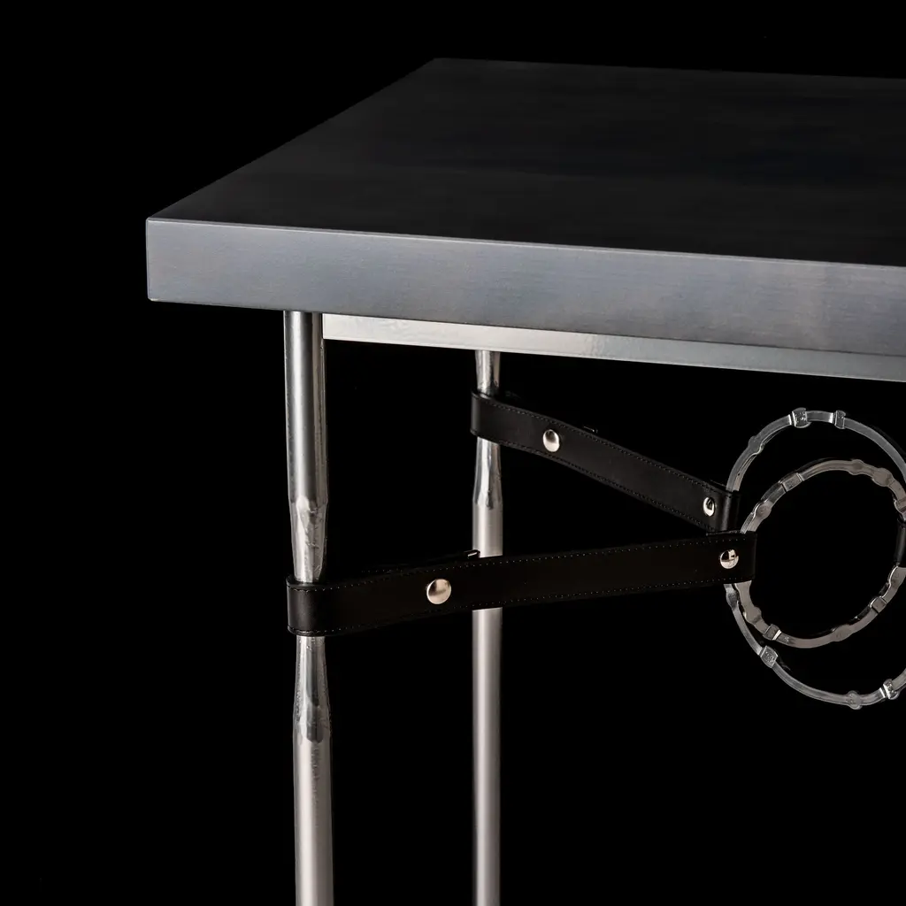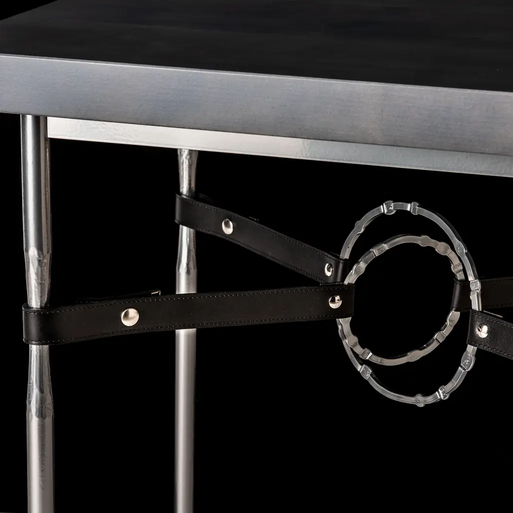 The Equus Side Table is the perfect accent to a sophisticated setting. This side table is perfect for living and lounge areas, studies and other spaces. With its artisanal leather strapping connected by hand-forged and hammered steel rings, this Equus Side Table features a solid Vermont Maple Top that completes the richness of materials complementing the steel and leather. Available in all standard finishes.
